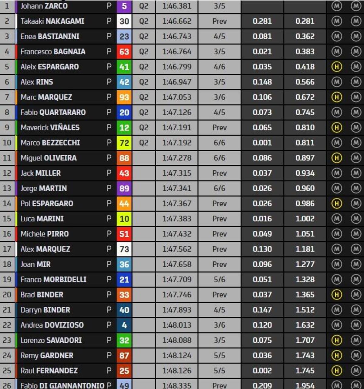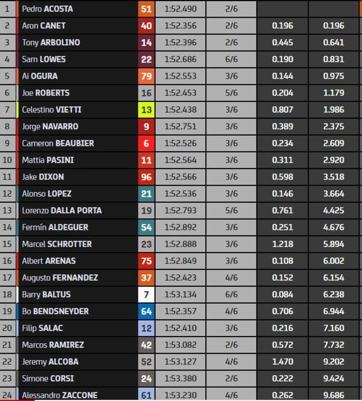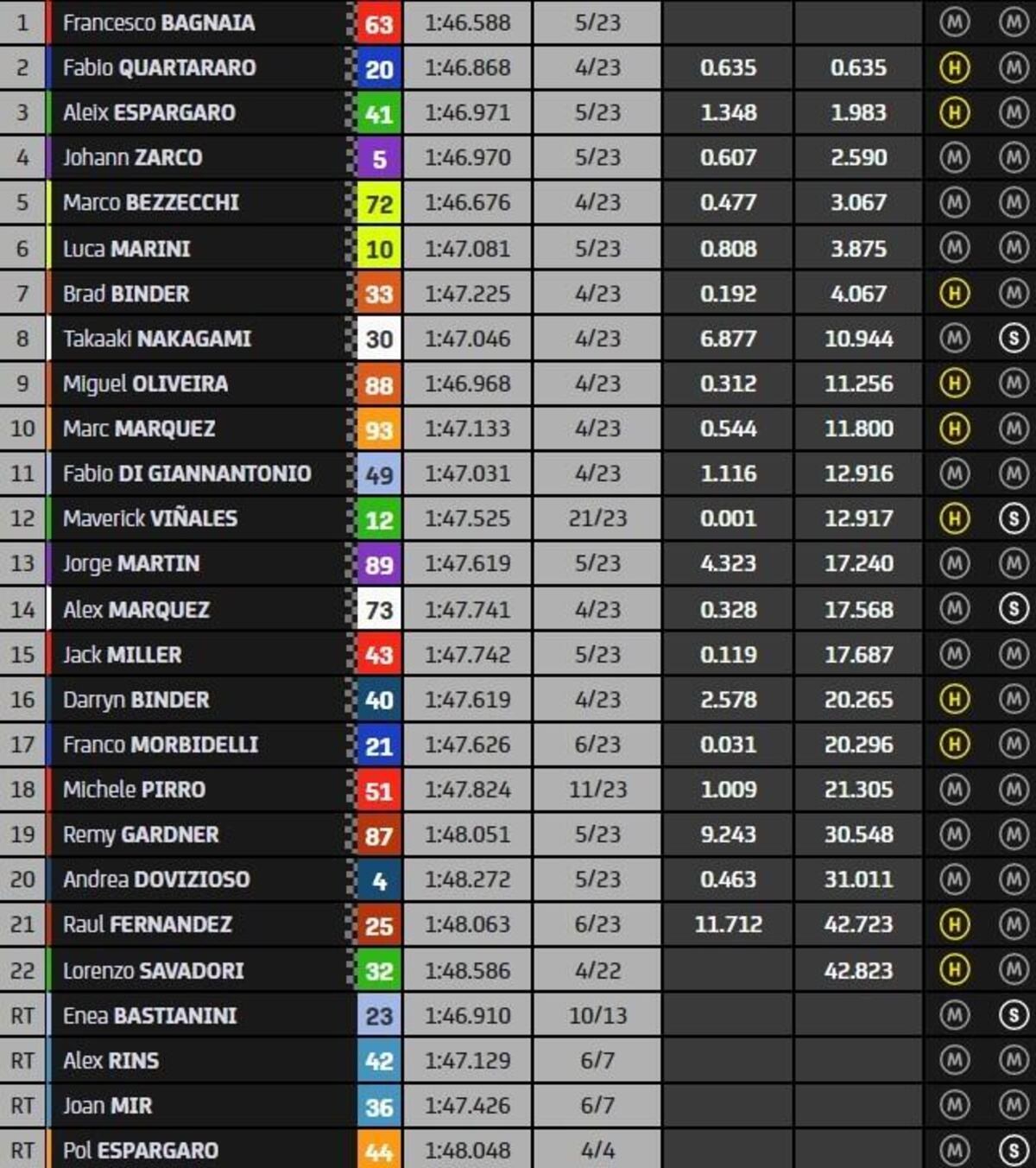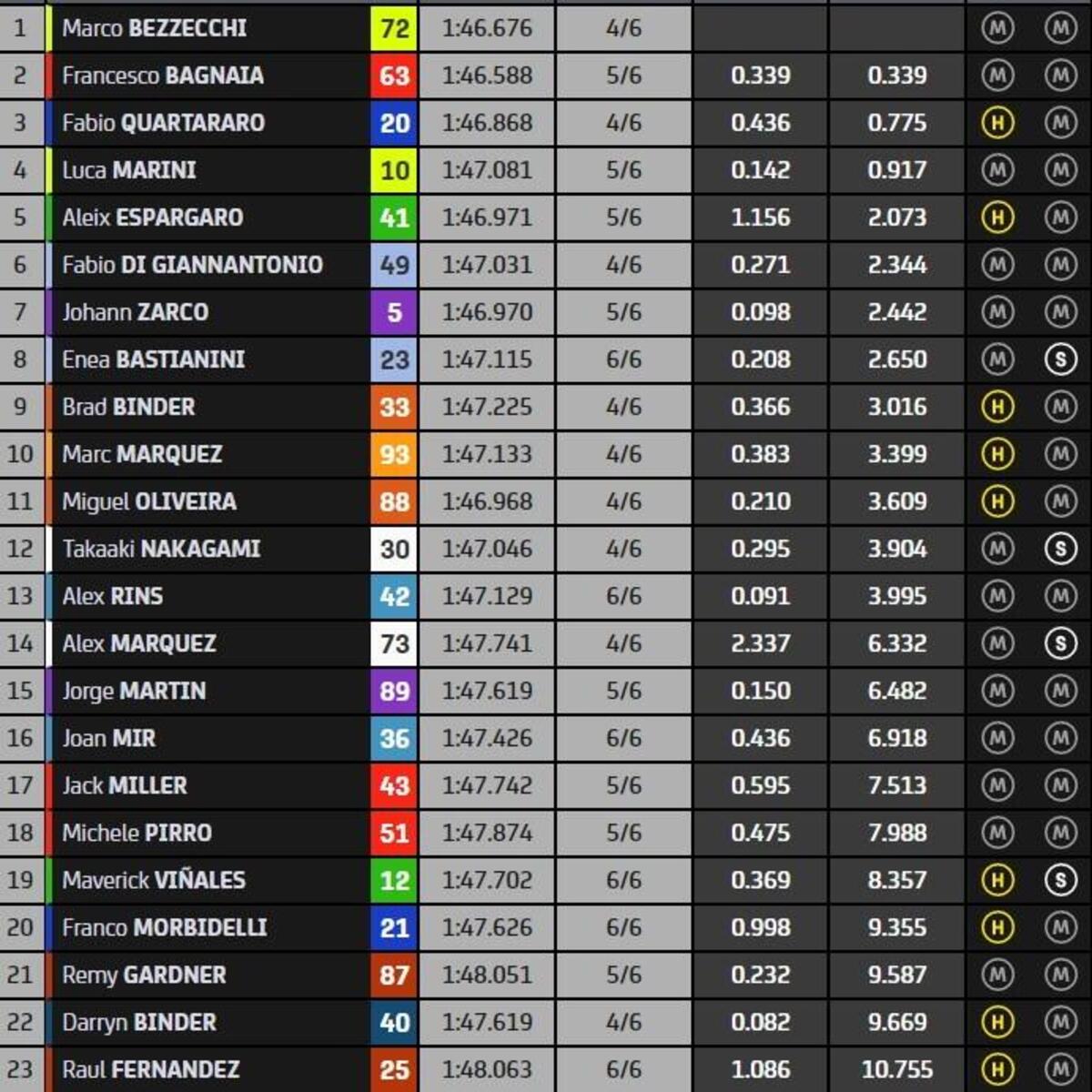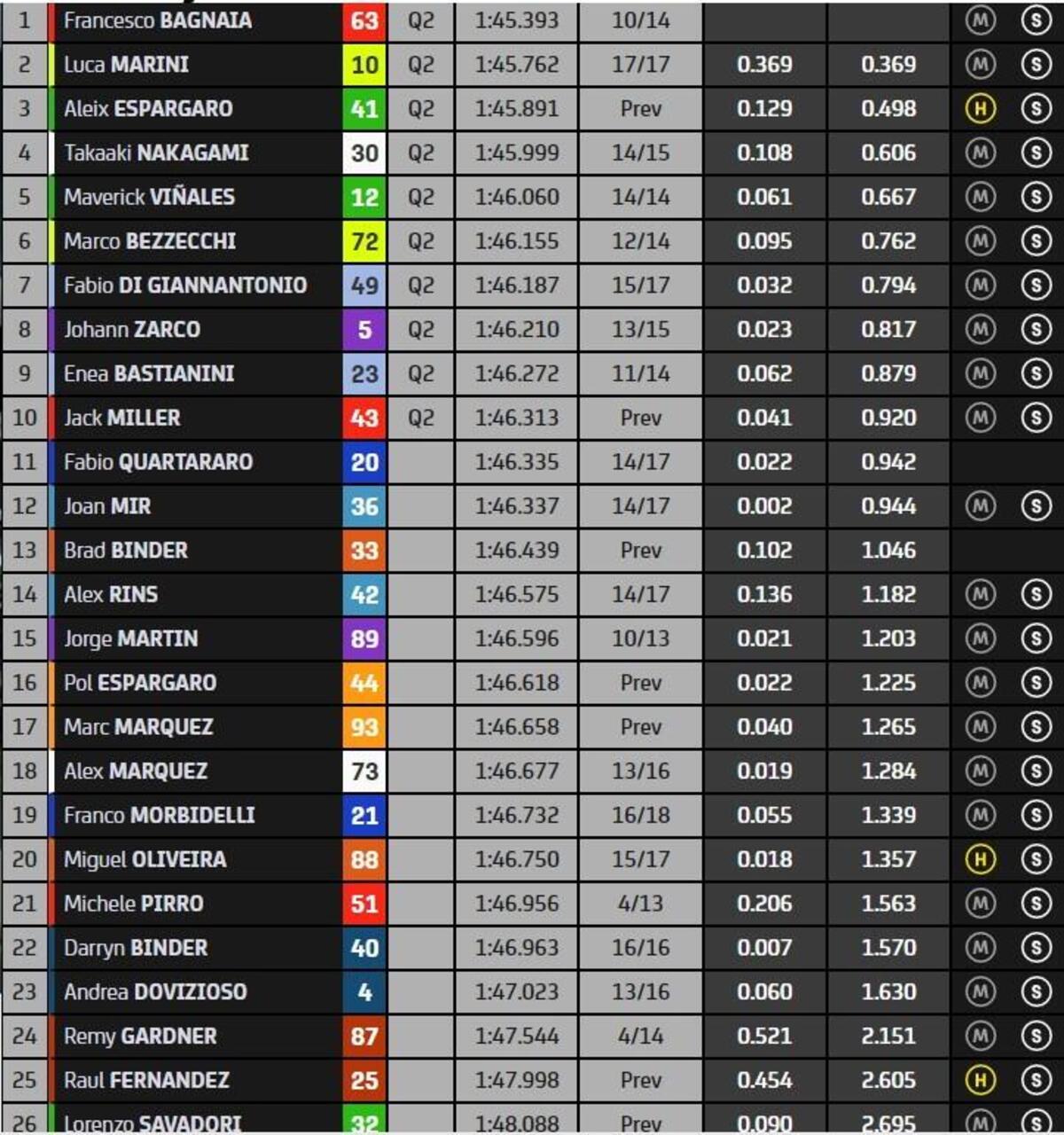 bagnaia ha 1.2 su fabio che ha 0.7 sulla coppia bezz-aleix