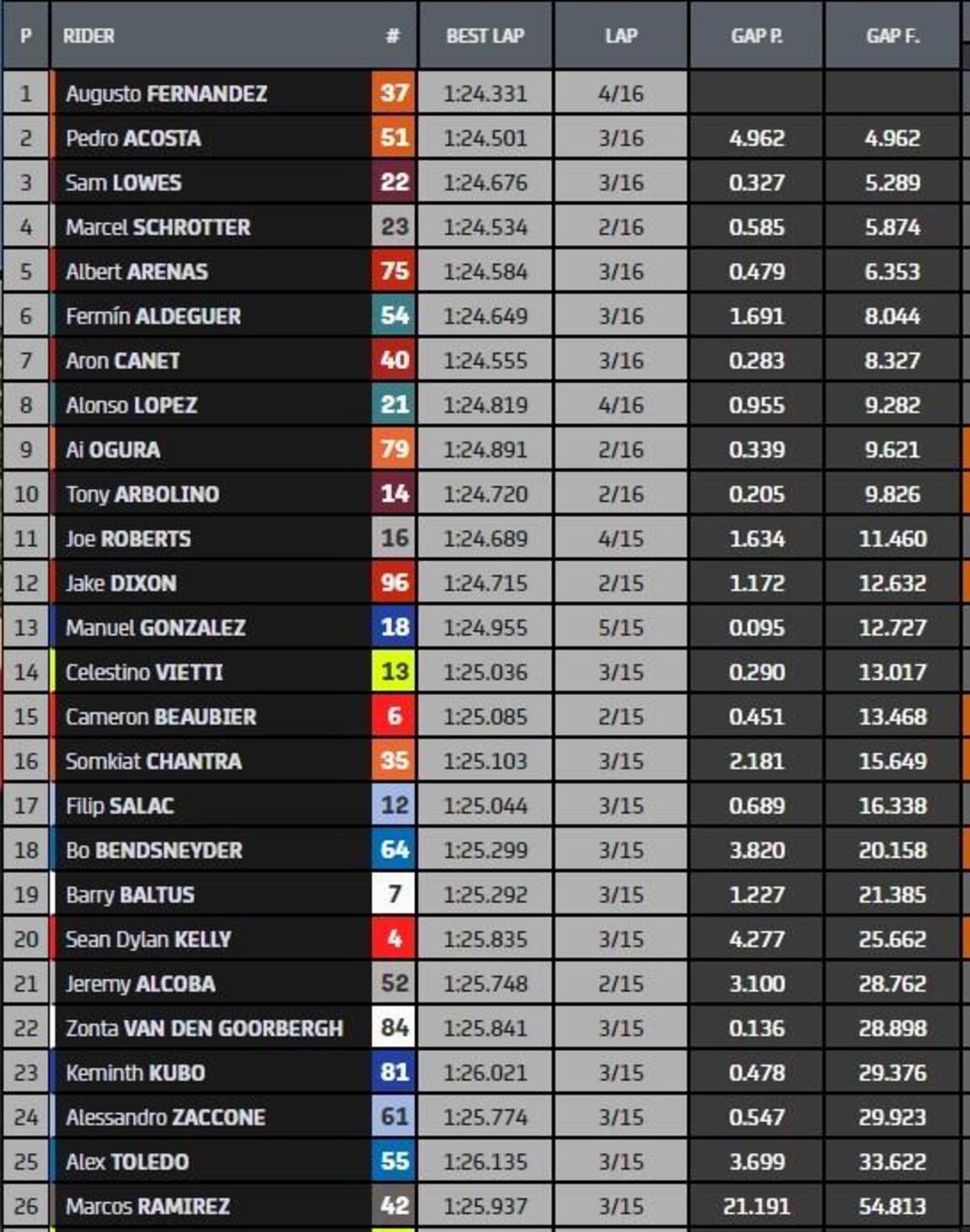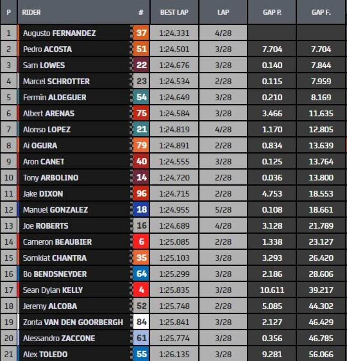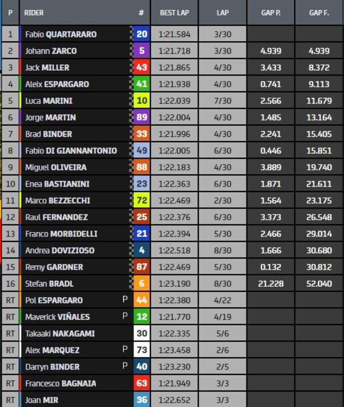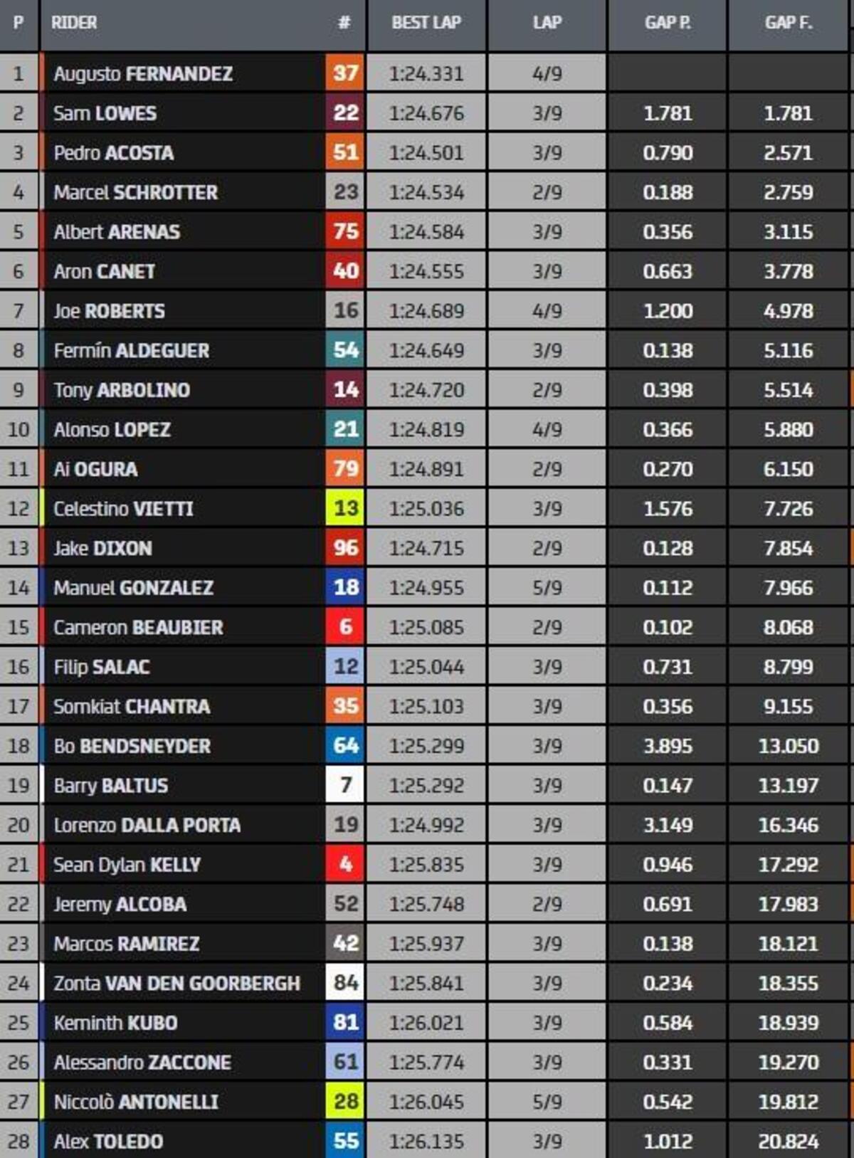 "Purtroppo oggi fin dal primo giro ho avuto una strana vibrazione all'anteriore, che è andata poi peggiorando. Ad un certo punto della gara ho dovuto alzare molto il ritmo, cambiando il mio stile di guida e non sfruttando i punti di forza della RS-GP. Un peccato perchè, anche se non sarei stato capace di stare con Fabio, avevo sicuramente il passo per lottare con Zarco. Per come si erano messe le cose, sono soddisfatto del quarto posto, perchè pur guidando male e senza fiducia sono riuscito a limitare i danni. I punti persi non mi preoccupano troppo, è la forma di Fabio in gara che in questo momento ci deve spingere a trovare ulteriore velocità”.