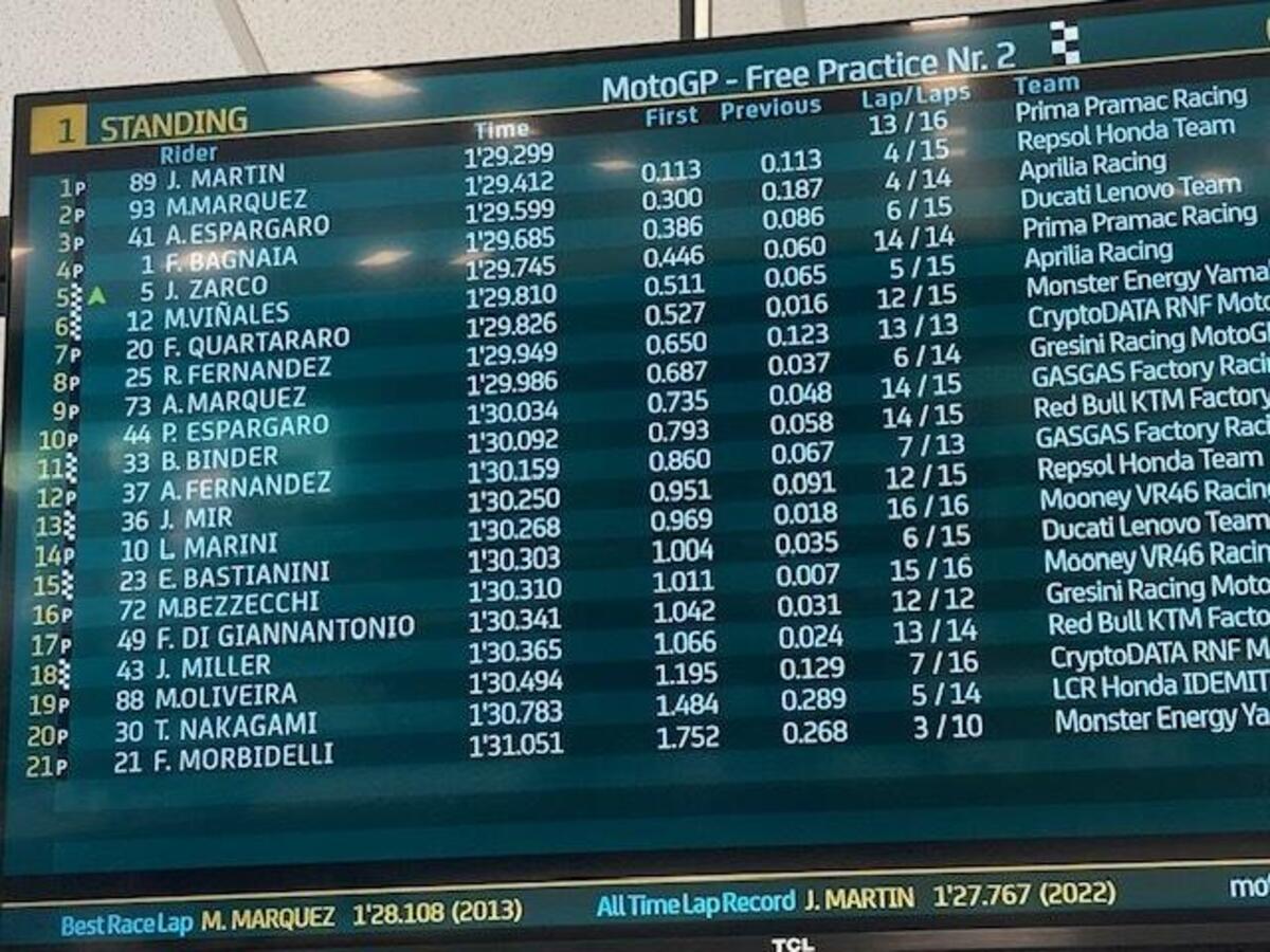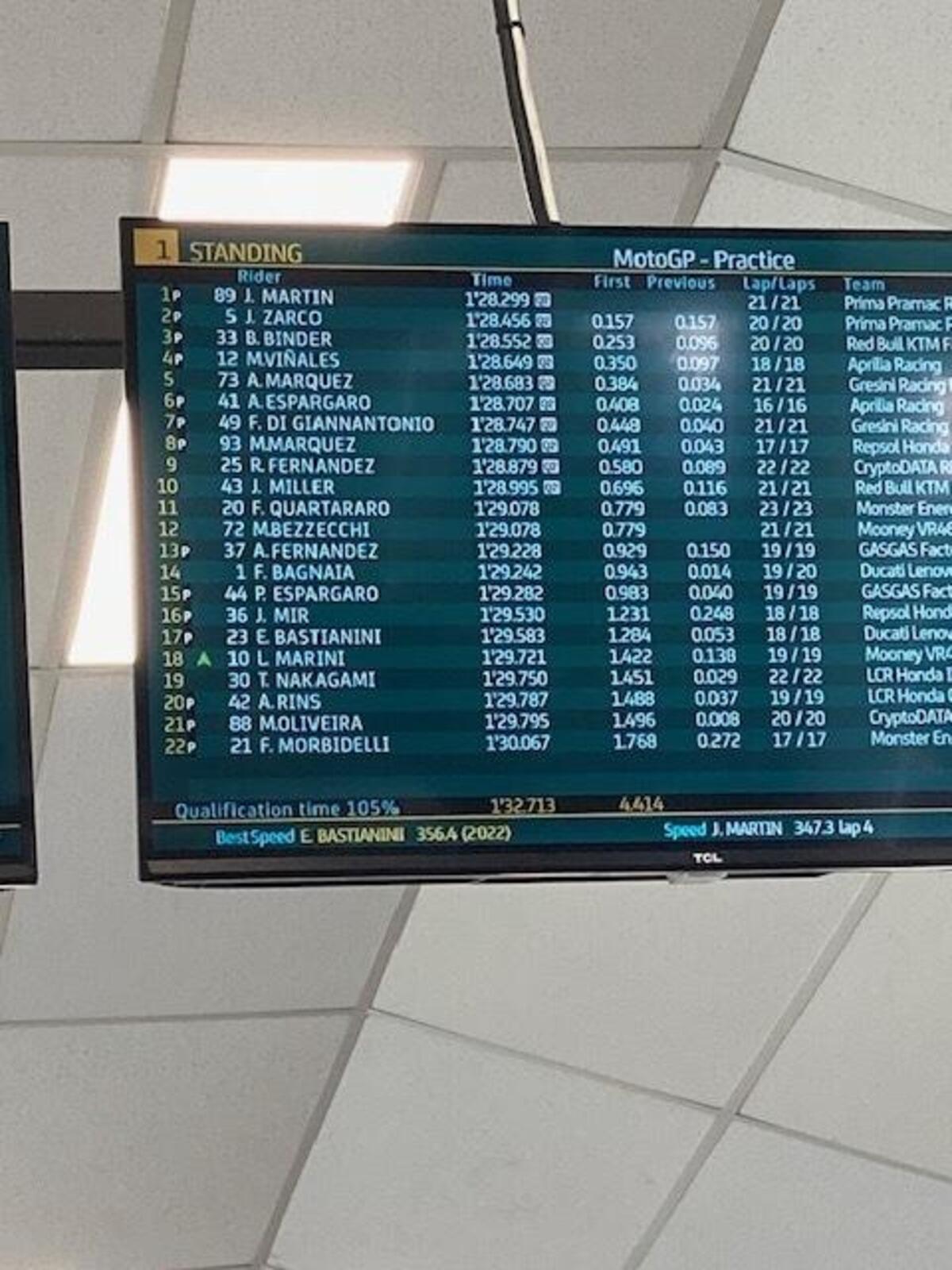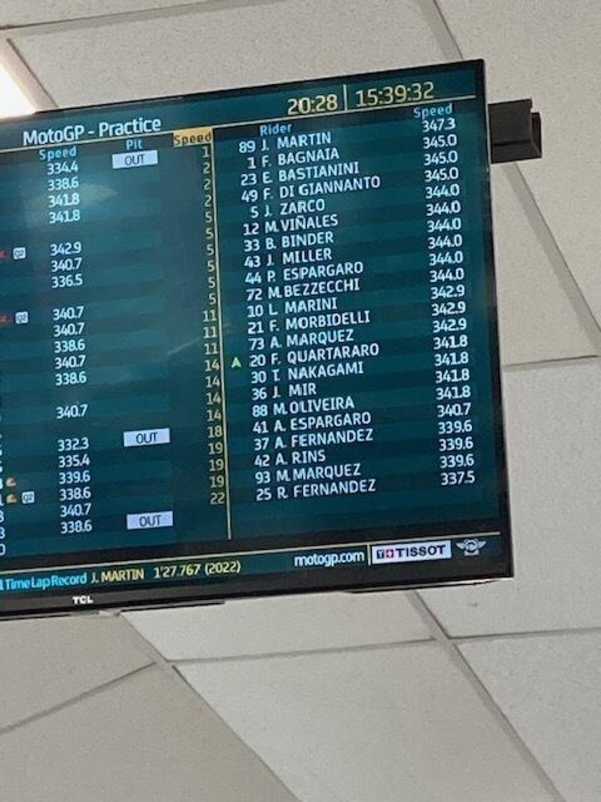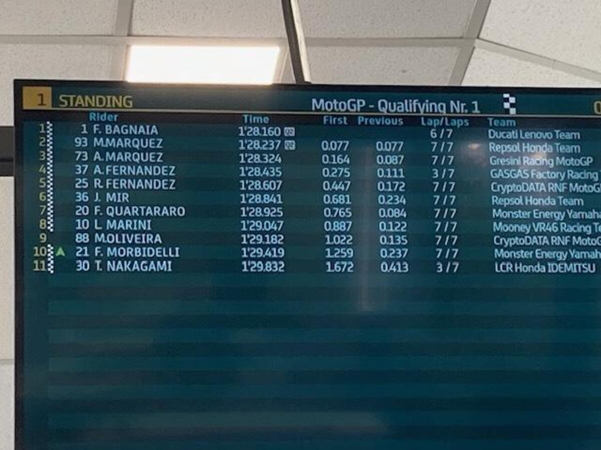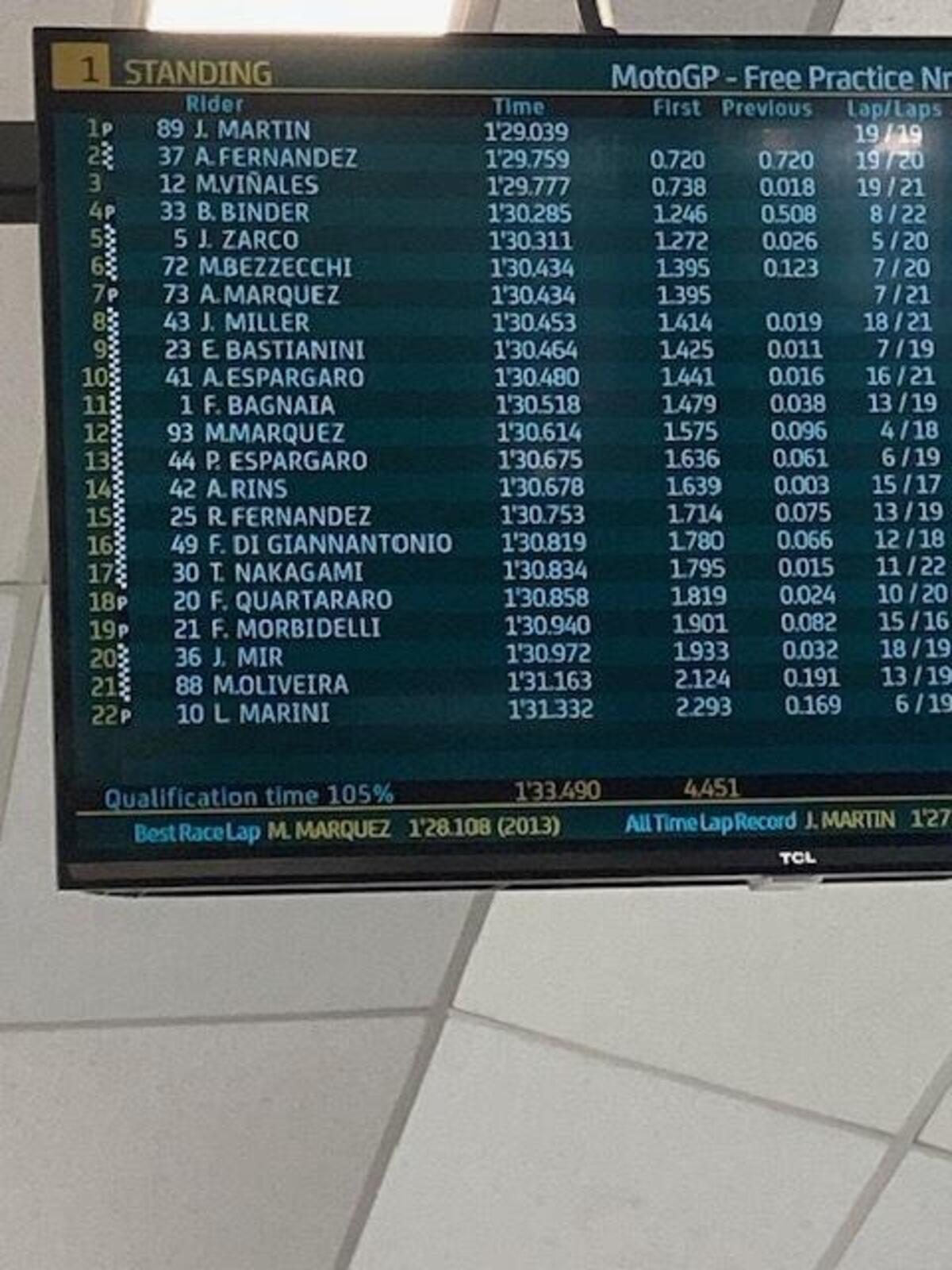 Altra caduta per Marc Márquez, che poi nel finale si esibisce in uno dei salvataggi che lo aveva reso famoso in passato: è l’unico motivo di soddisfazione per Marc, 16esimo, con il convalescente Alex Rins 12esimo, più veloce di Marc di circa un decimo e mezzo. Addirittura ultimo Franco Morbidelli, in grandissima difficoltà da questa mattina.