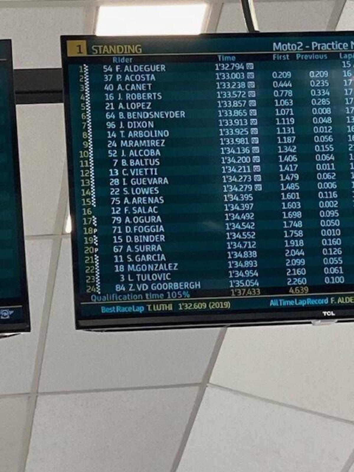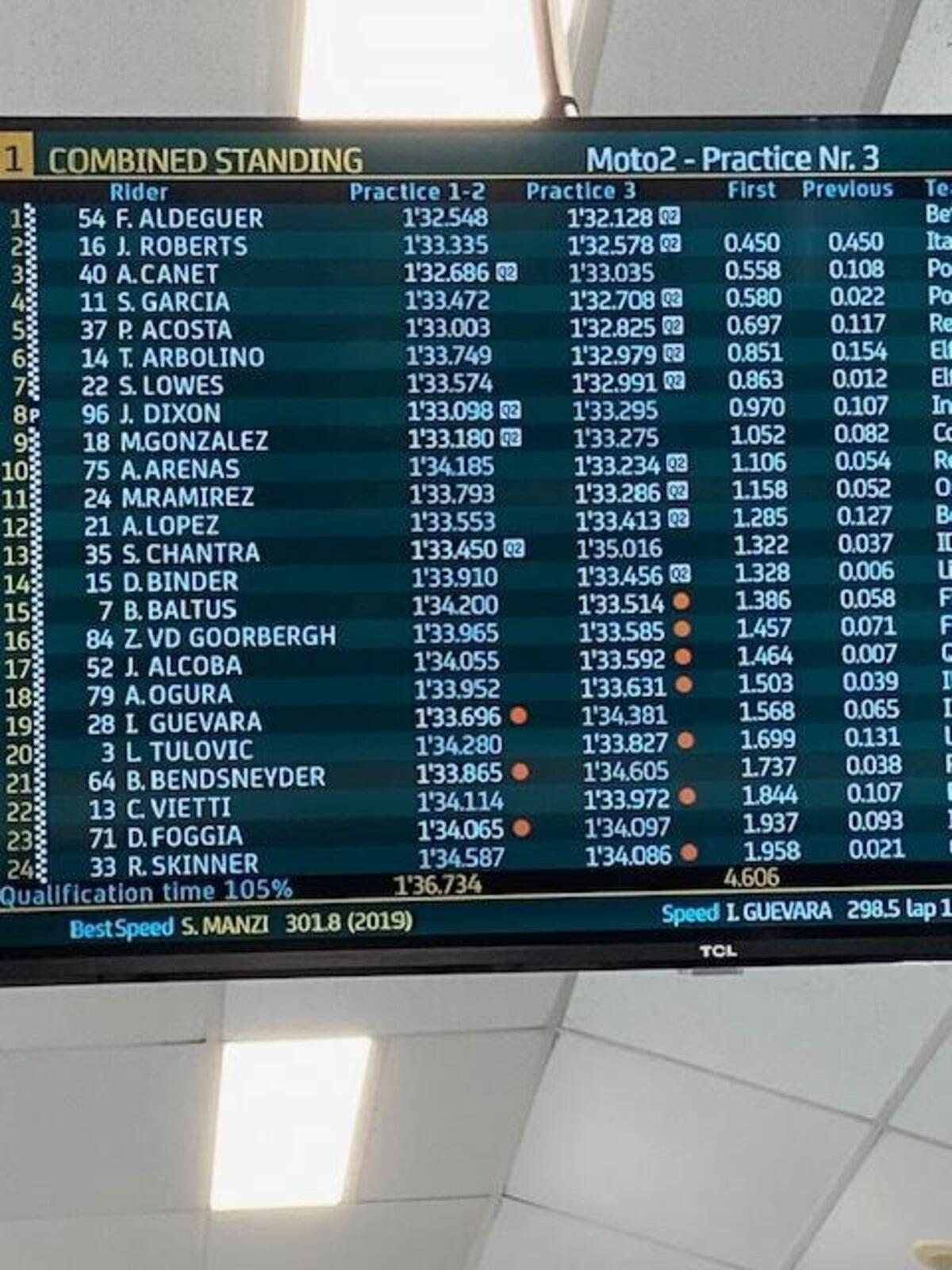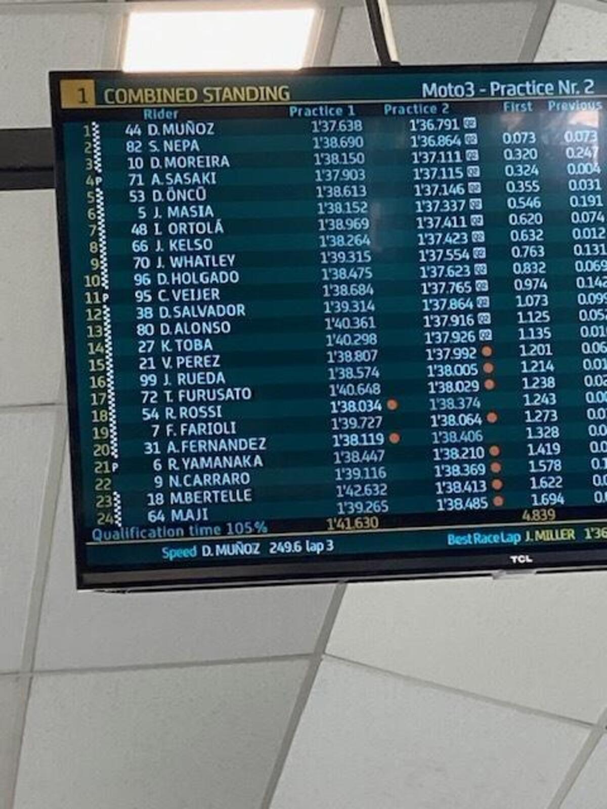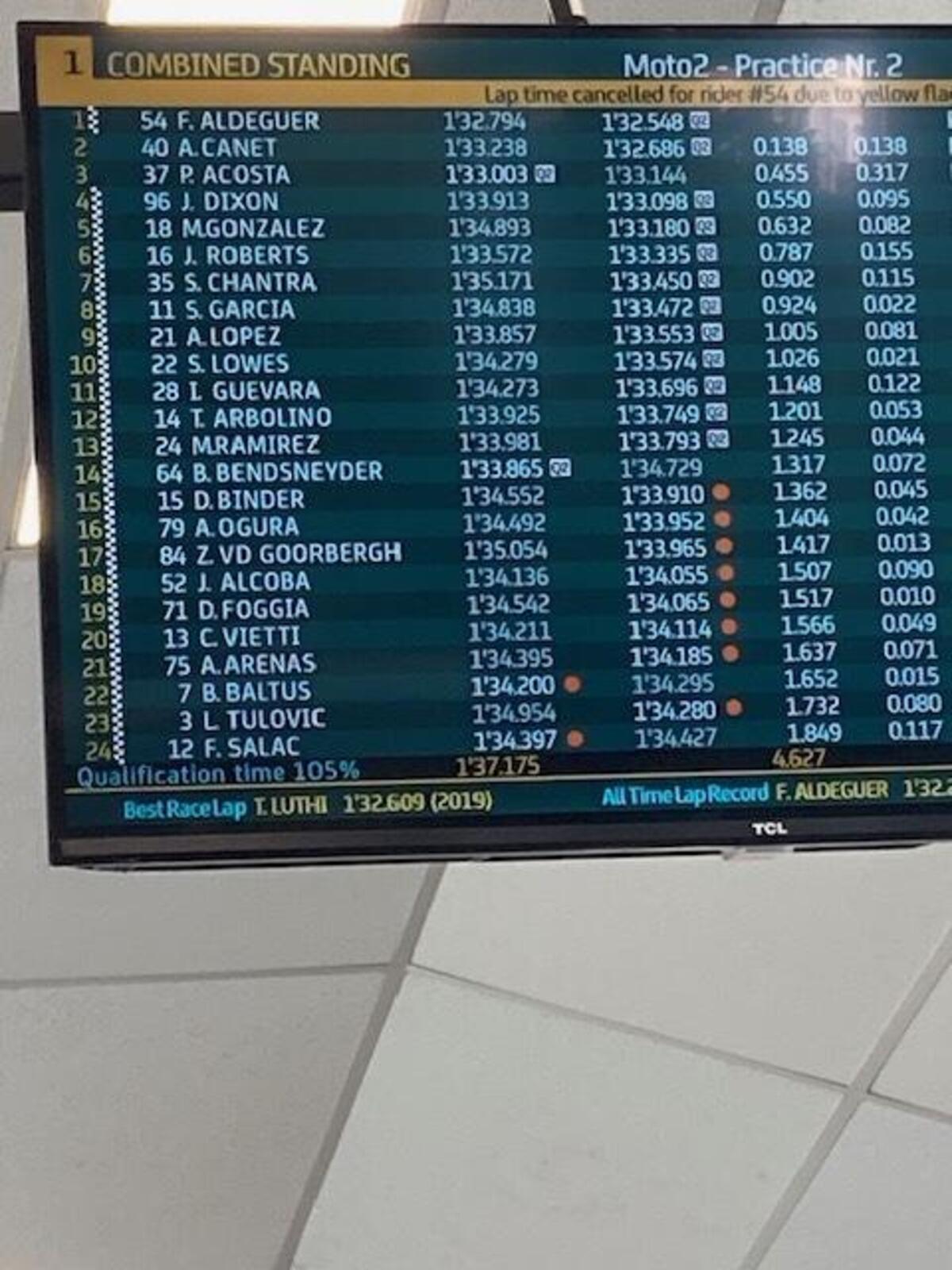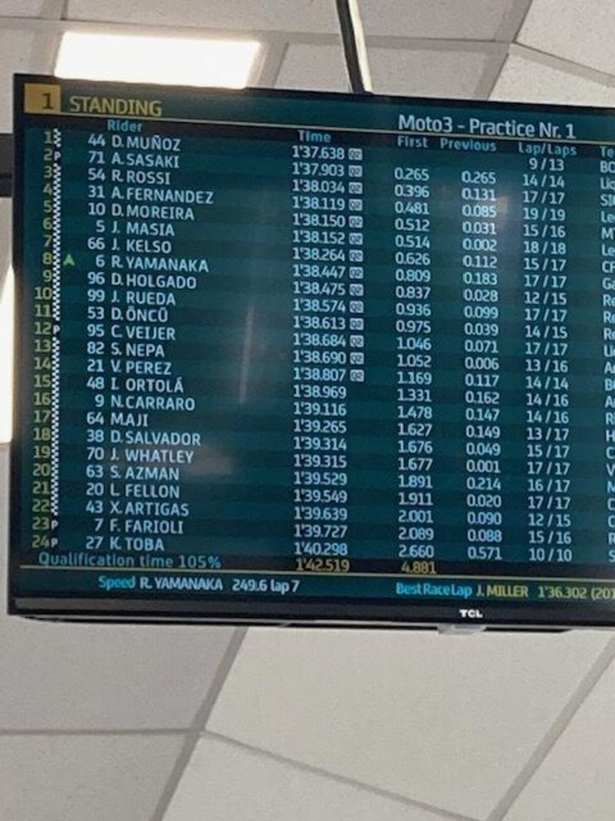 Altra caduta per Marc Márquez, che poi nel finale si esibisce in uno dei salvataggi che lo aveva reso famoso in passato: è l’unico motivo di soddisfazione per Marc, 16esimo, con il convalescente Alex Rins 12esimo, più veloce di Marc di circa un decimo e mezzo. Addirittura ultimo Franco Morbidelli, in grandissima difficoltà da questa mattina.