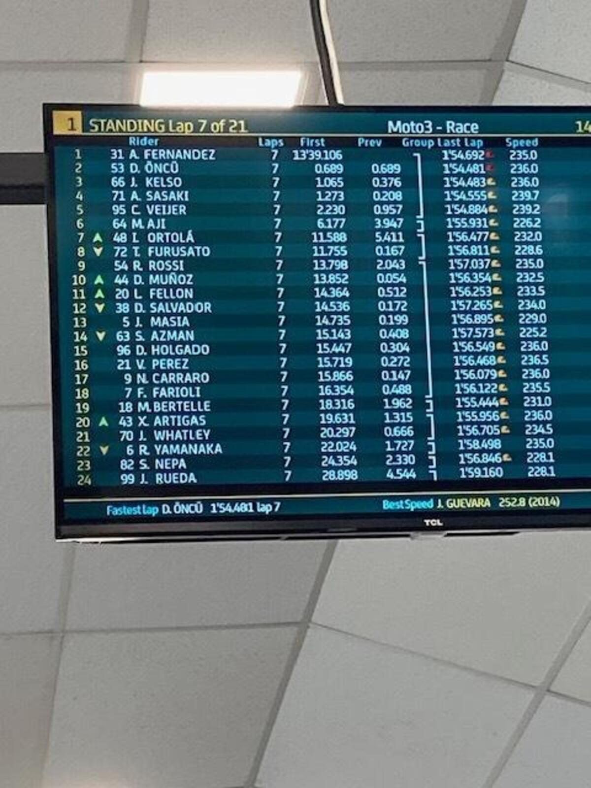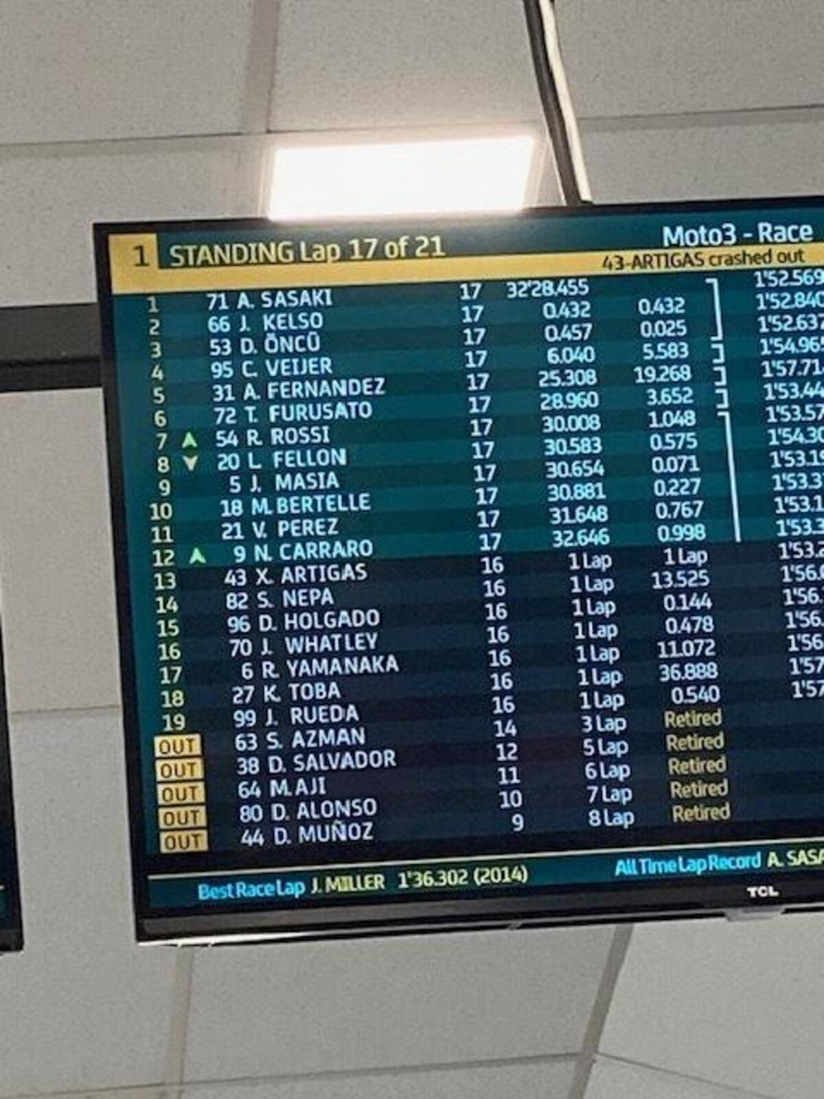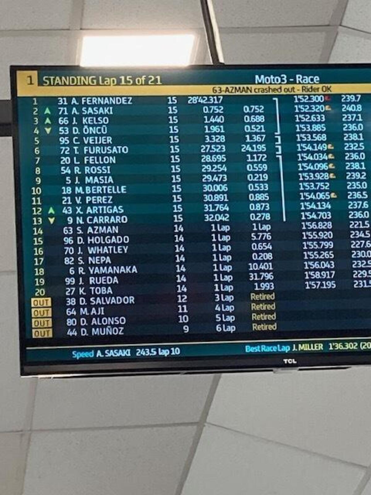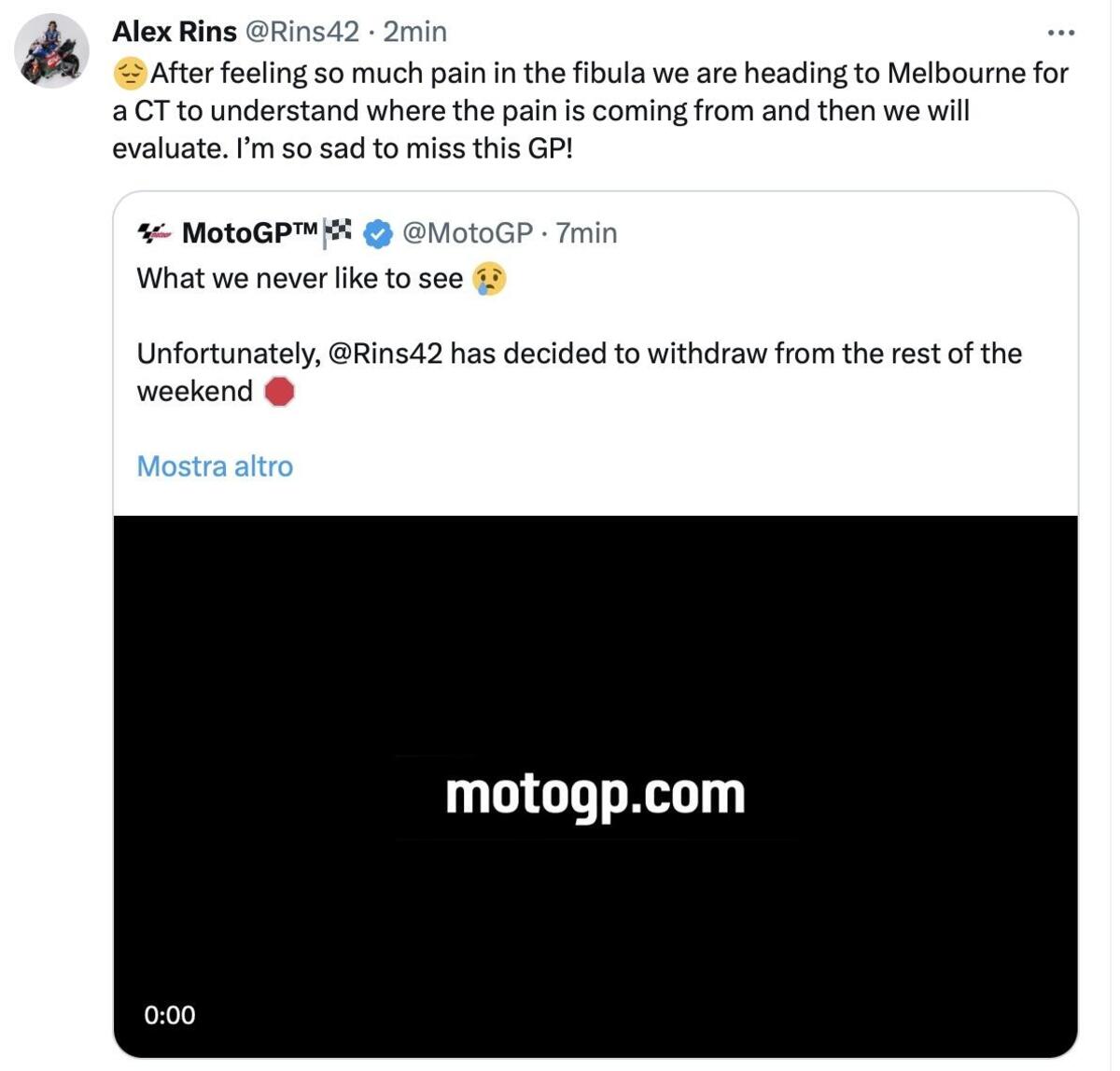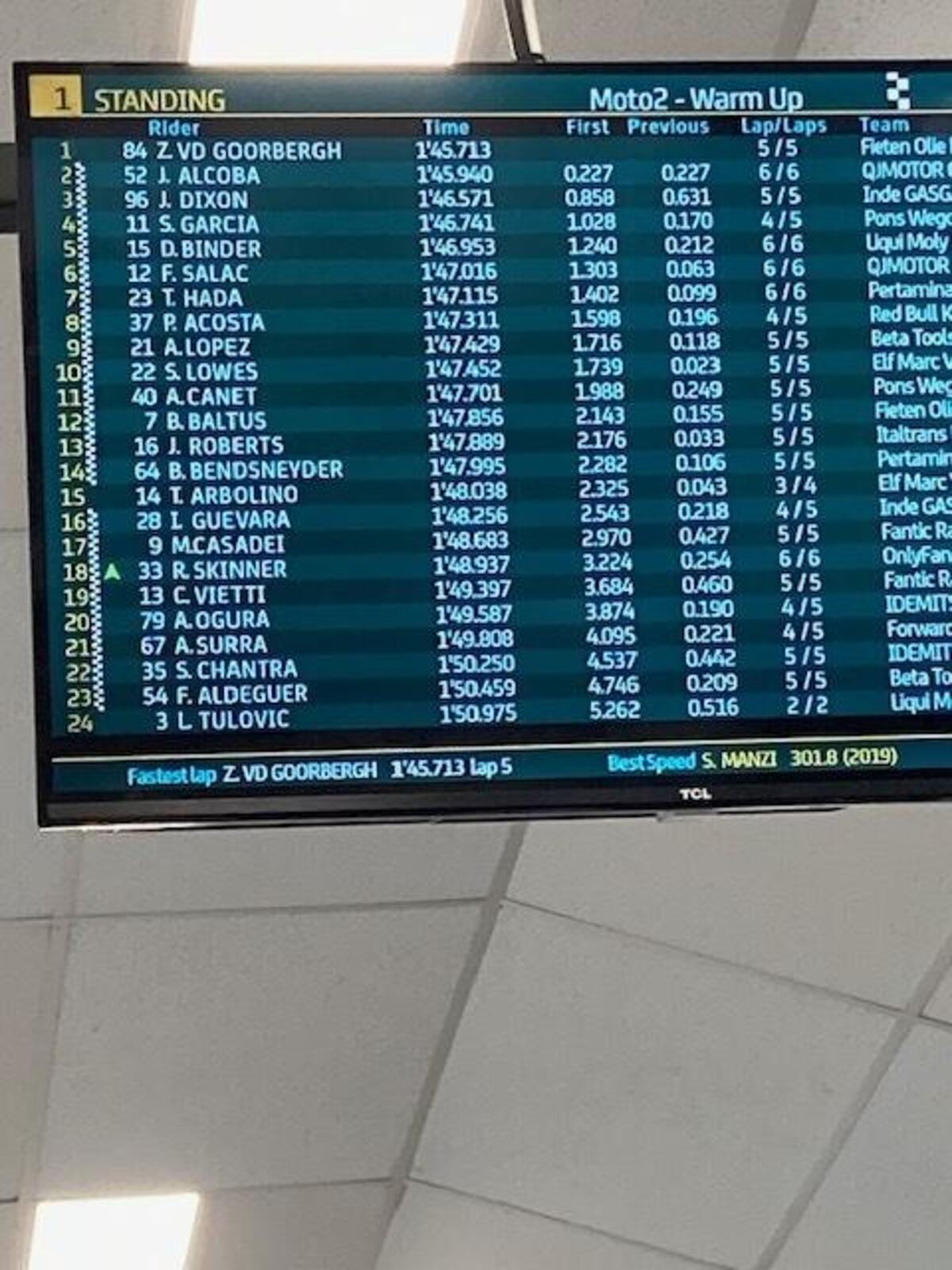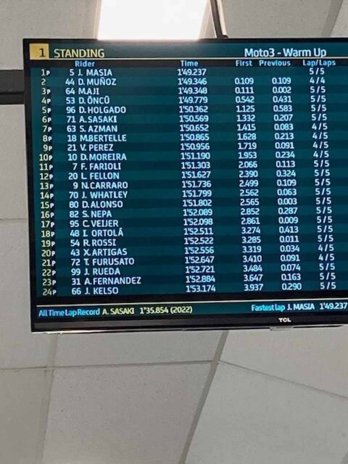 Altra caduta per Marc Márquez, che poi nel finale si esibisce in uno dei salvataggi che lo aveva reso famoso in passato: è l’unico motivo di soddisfazione per Marc, 16esimo, con il convalescente Alex Rins 12esimo, più veloce di Marc di circa un decimo e mezzo. Addirittura ultimo Franco Morbidelli, in grandissima difficoltà da questa mattina.