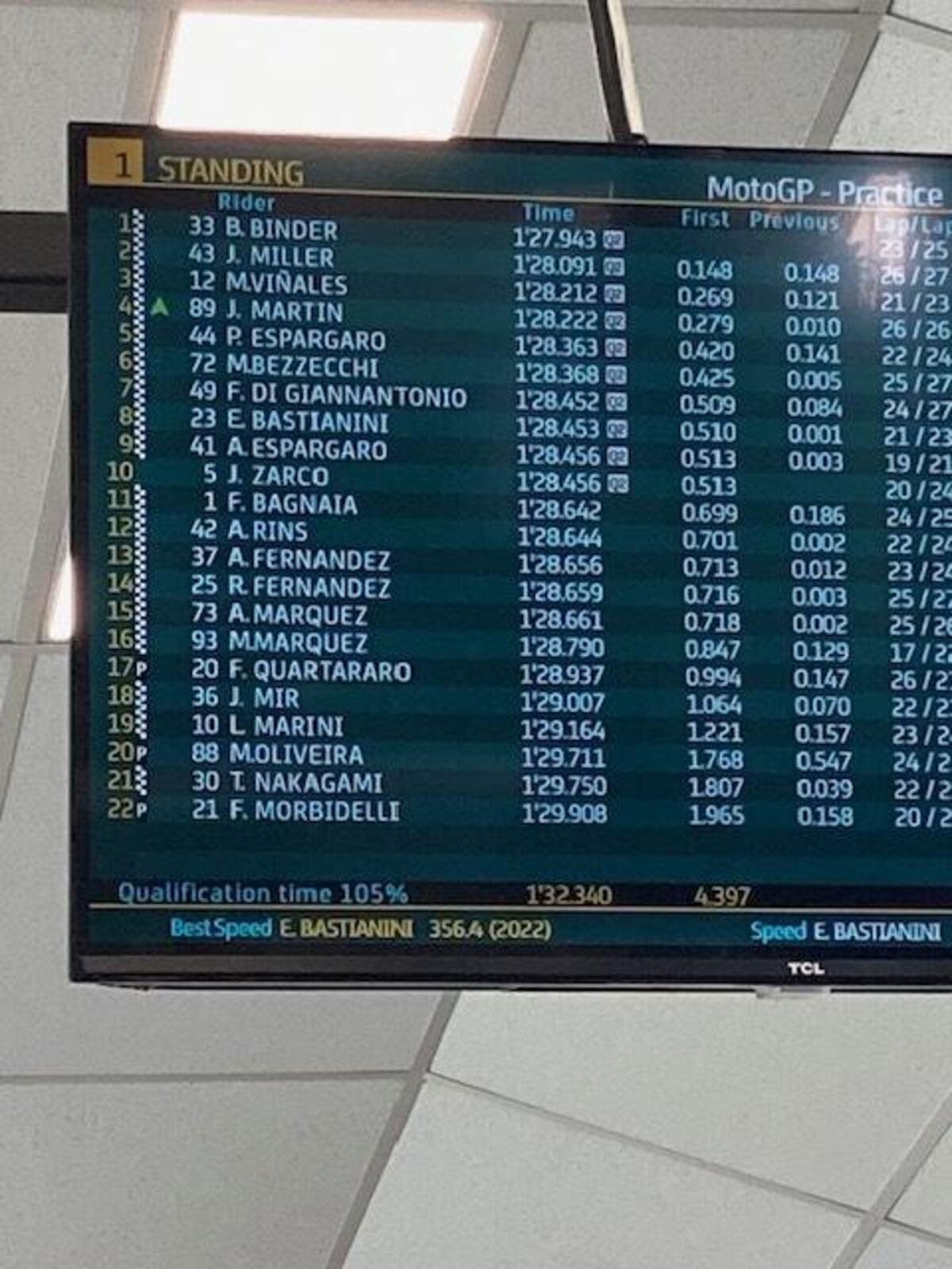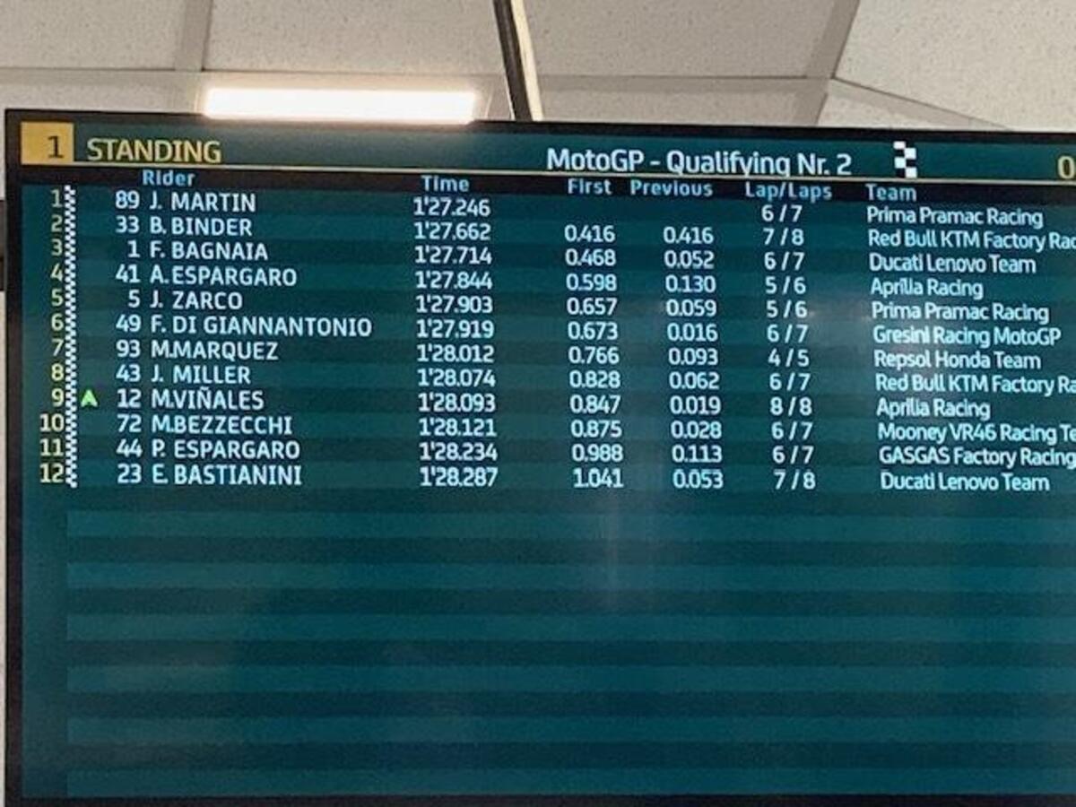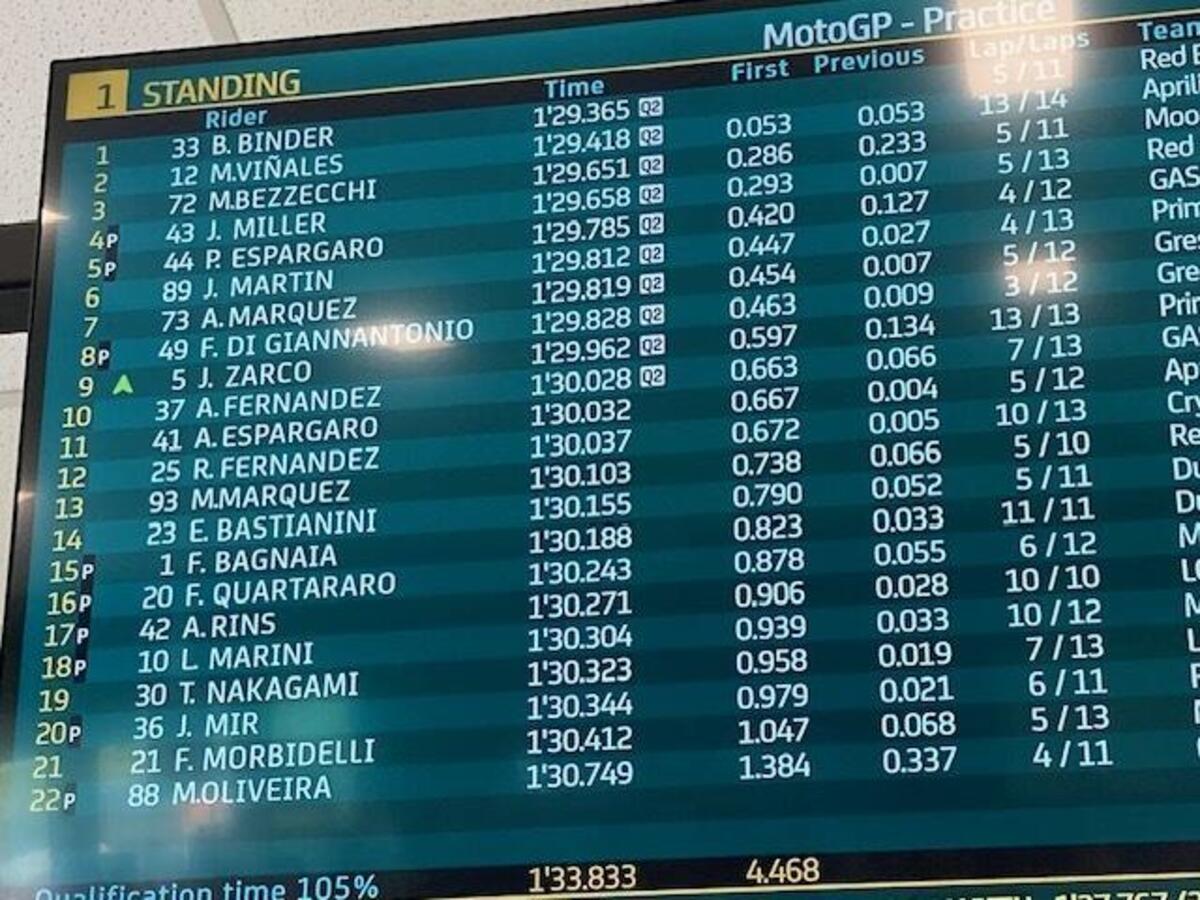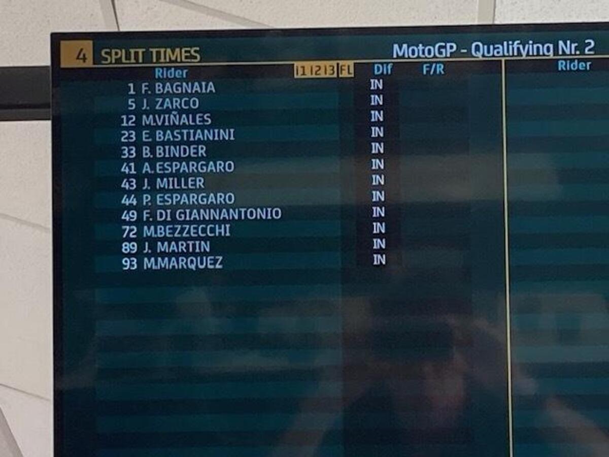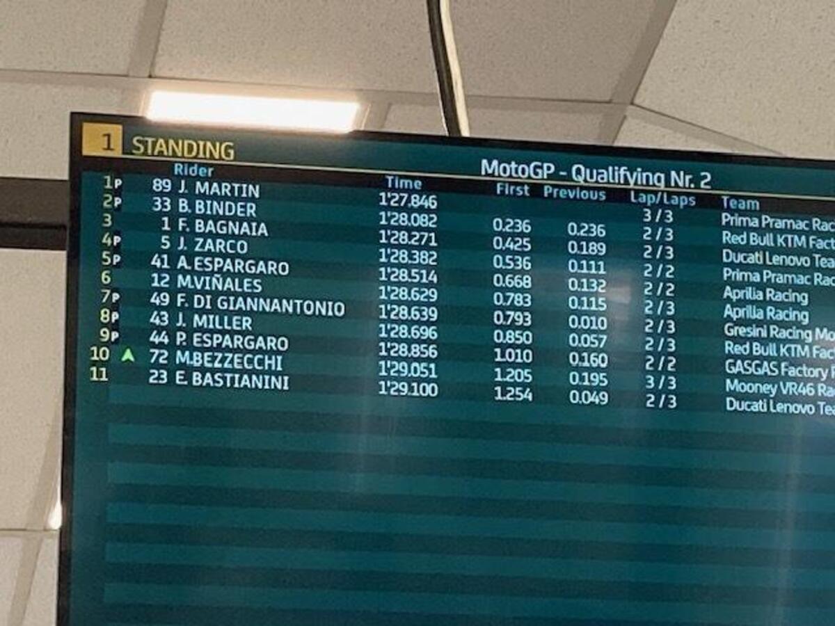 Ecco i dieci piloti già in Q2: Binder, Miller, Vinales, Martin, P.Espargaro, Bezzecchi, Di Giannantonio, Bastianini, A.Espargaro, Zarco.