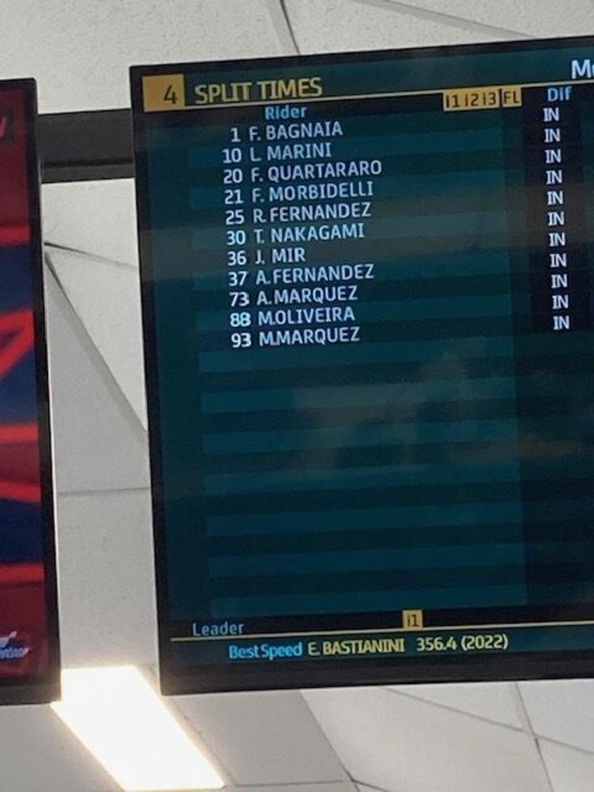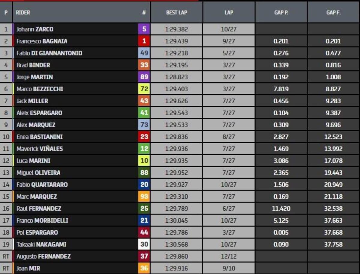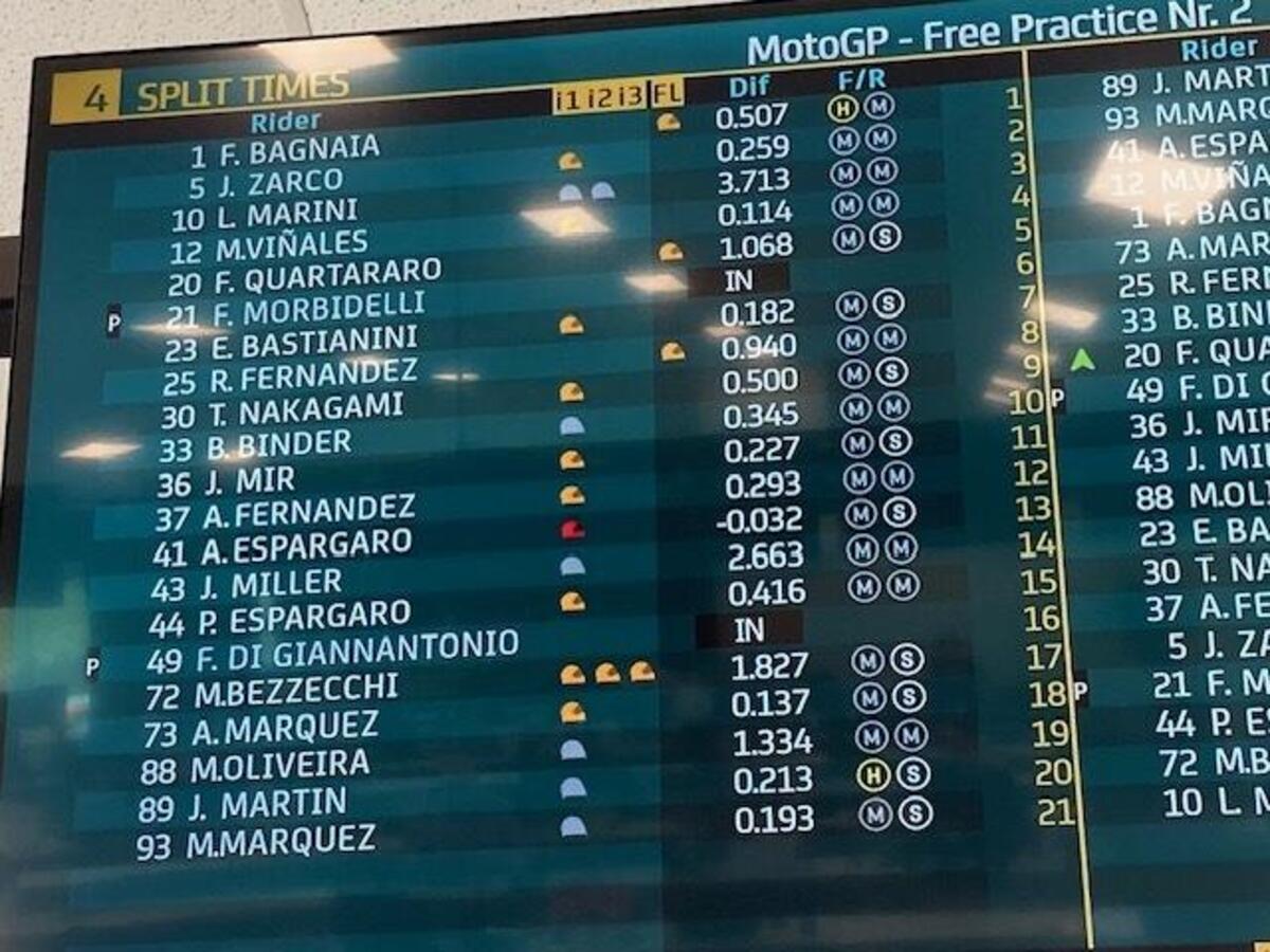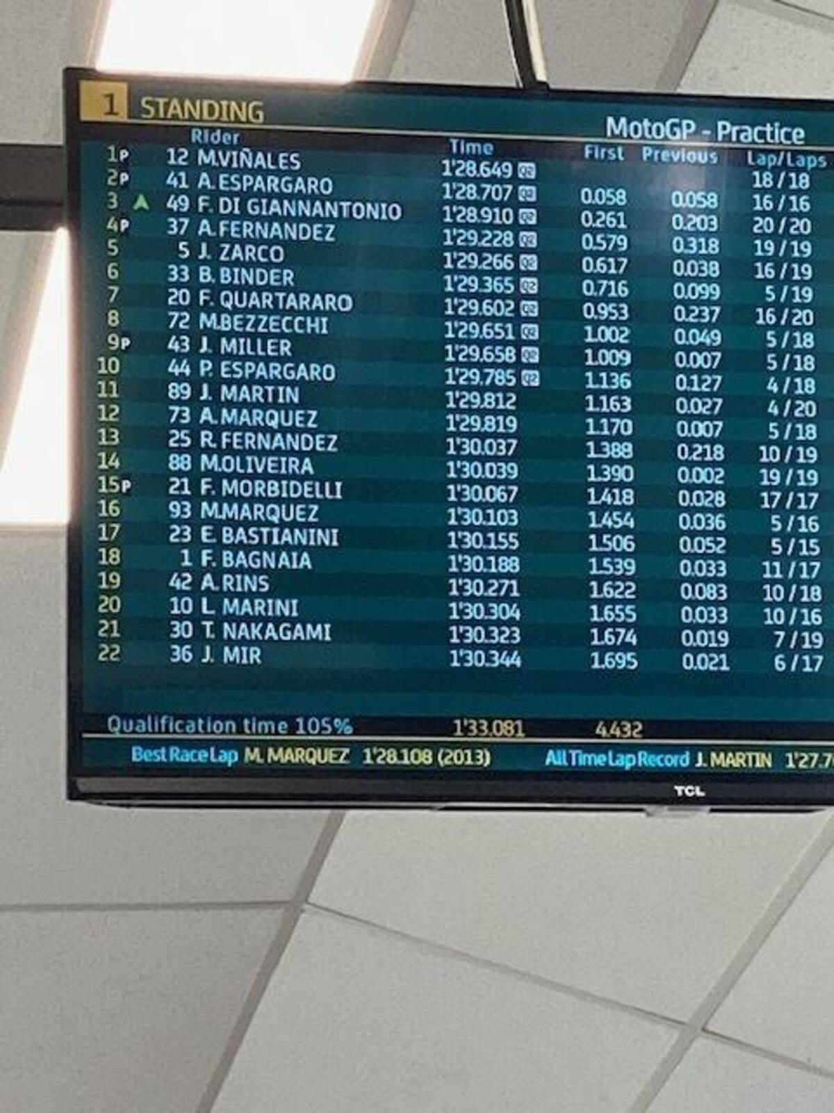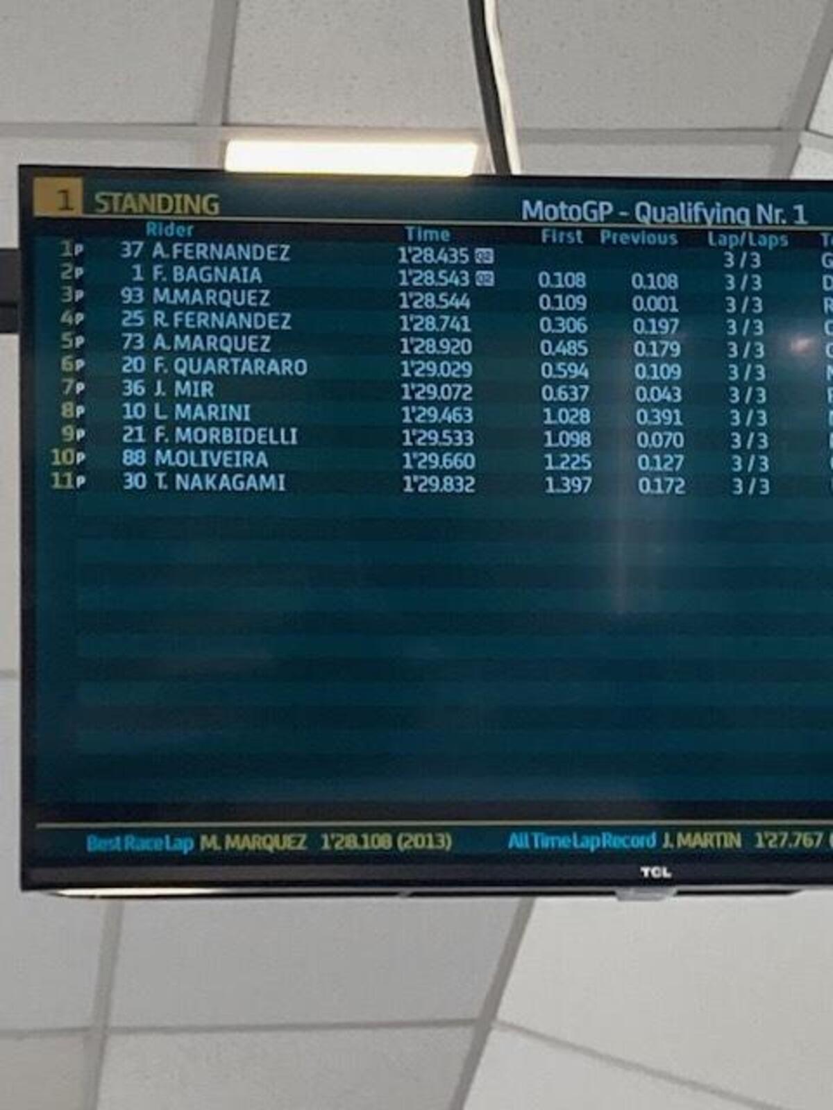 Ecco i dieci piloti già in Q2: Binder, Miller, Vinales, Martin, P.Espargaro, Bezzecchi, Di Giannantonio, Bastianini, A.Espargaro, Zarco.
