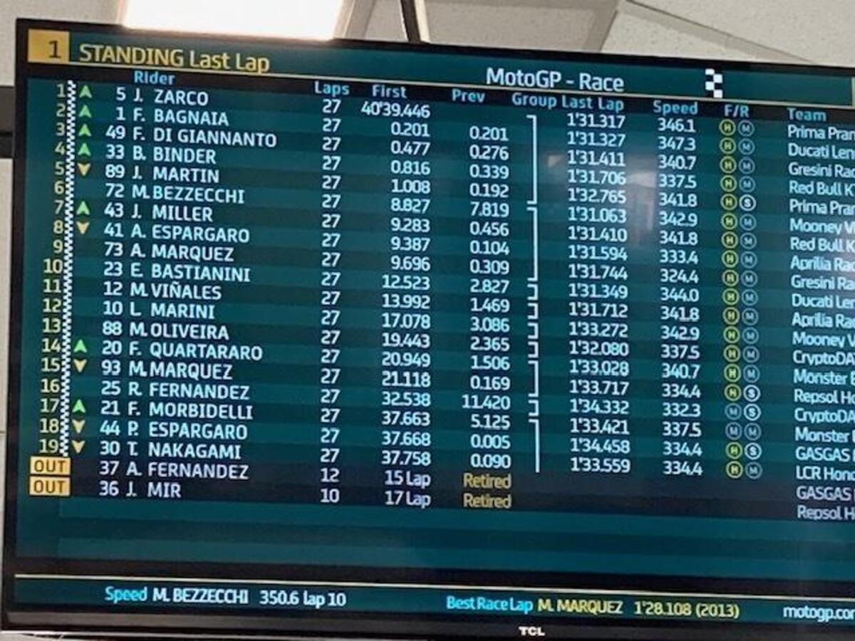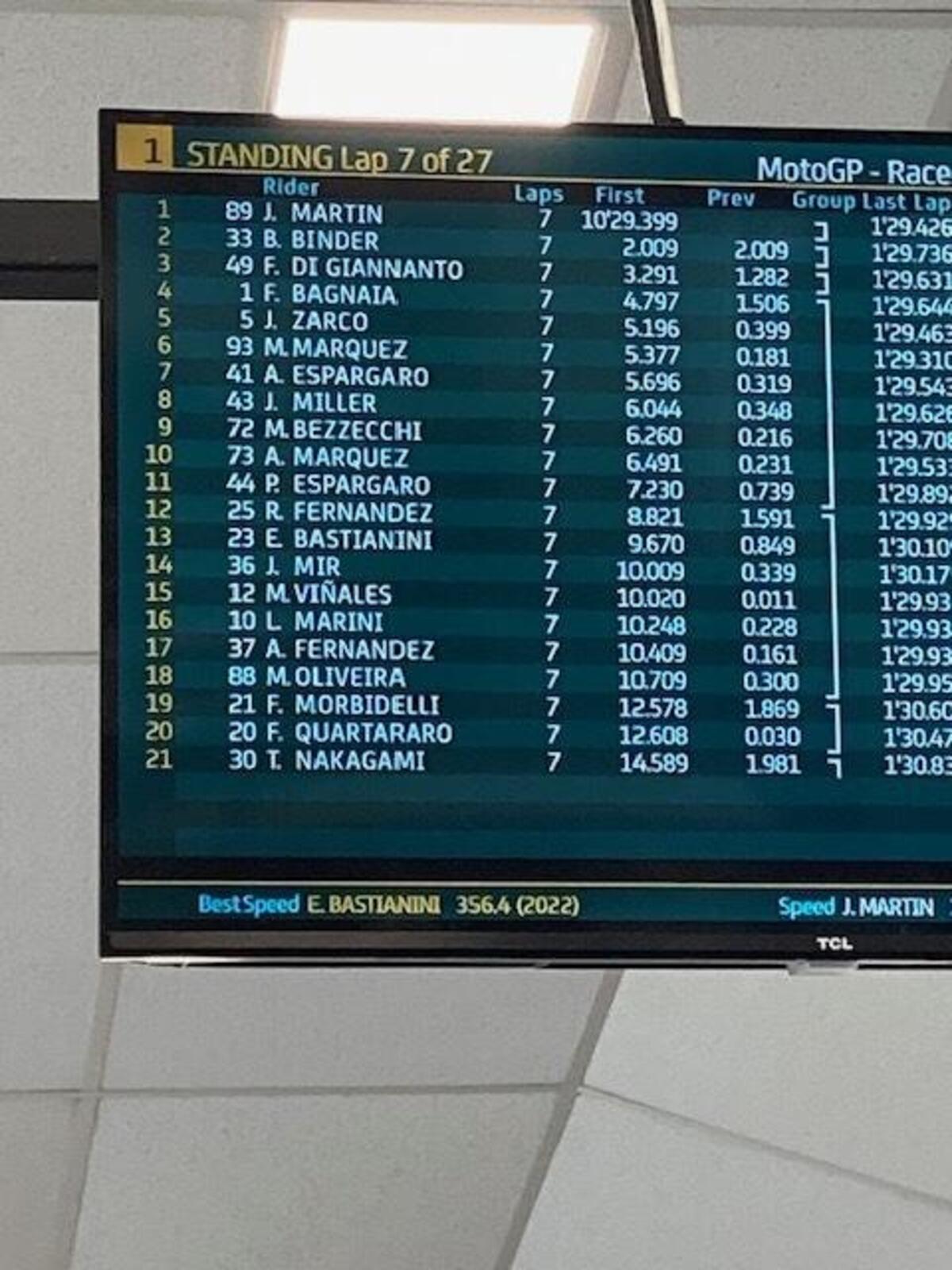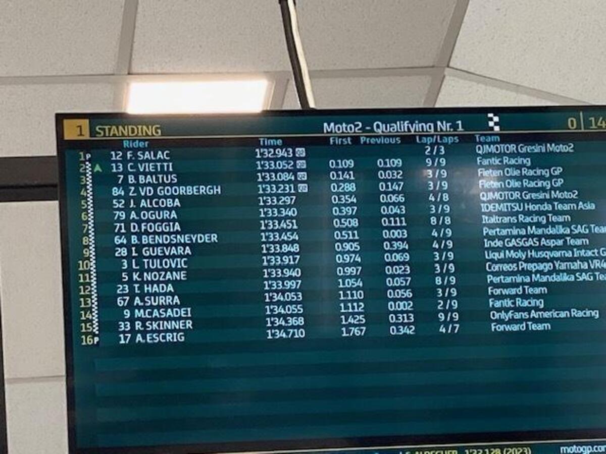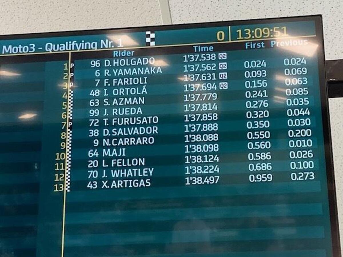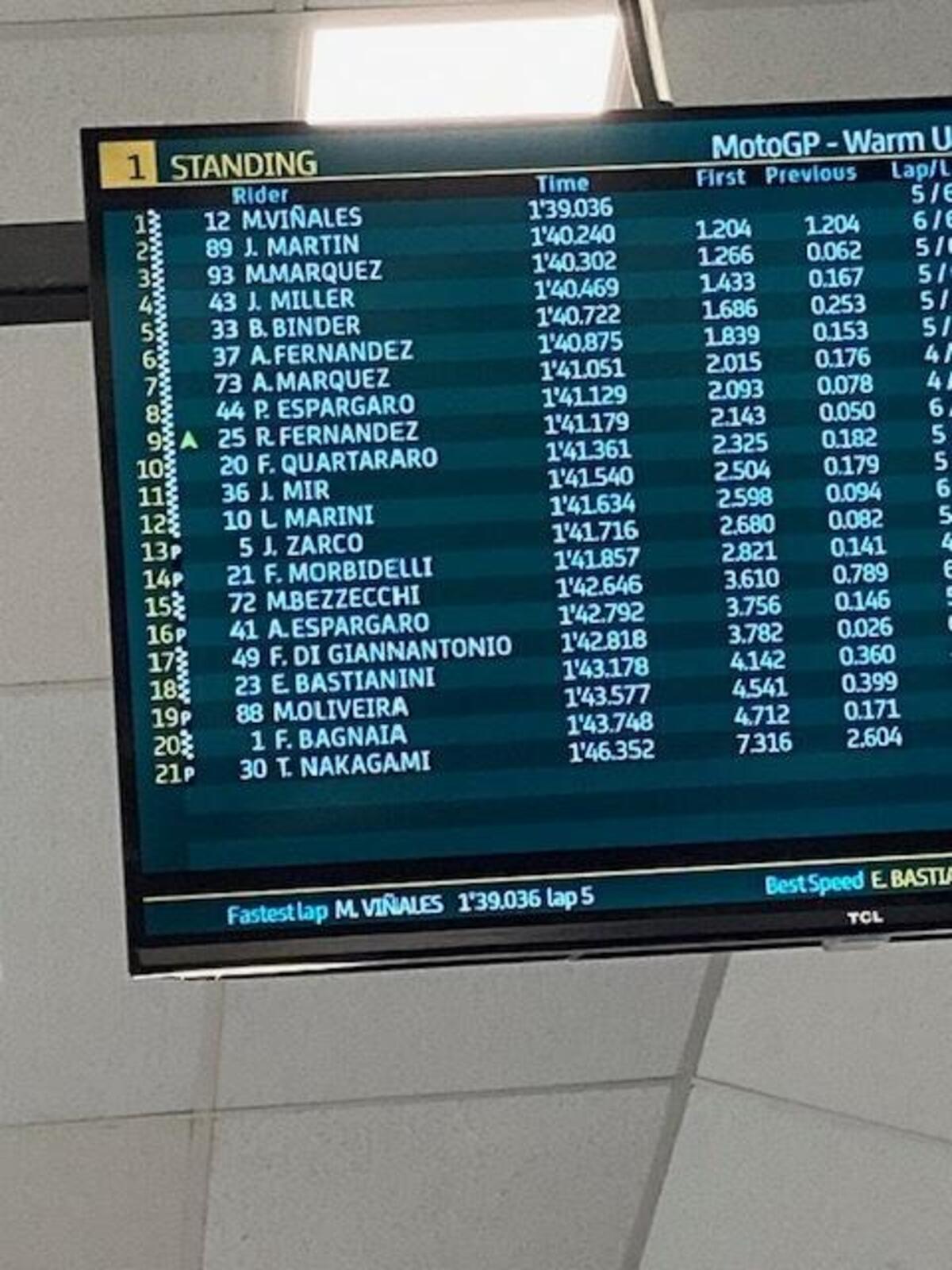 Ecco i dieci piloti già in Q2: Binder, Miller, Vinales, Martin, P.Espargaro, Bezzecchi, Di Giannantonio, Bastianini, A.Espargaro, Zarco.