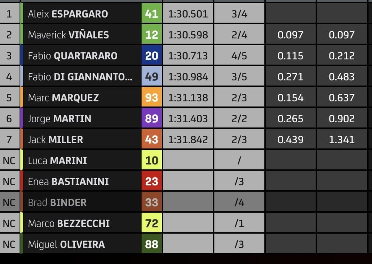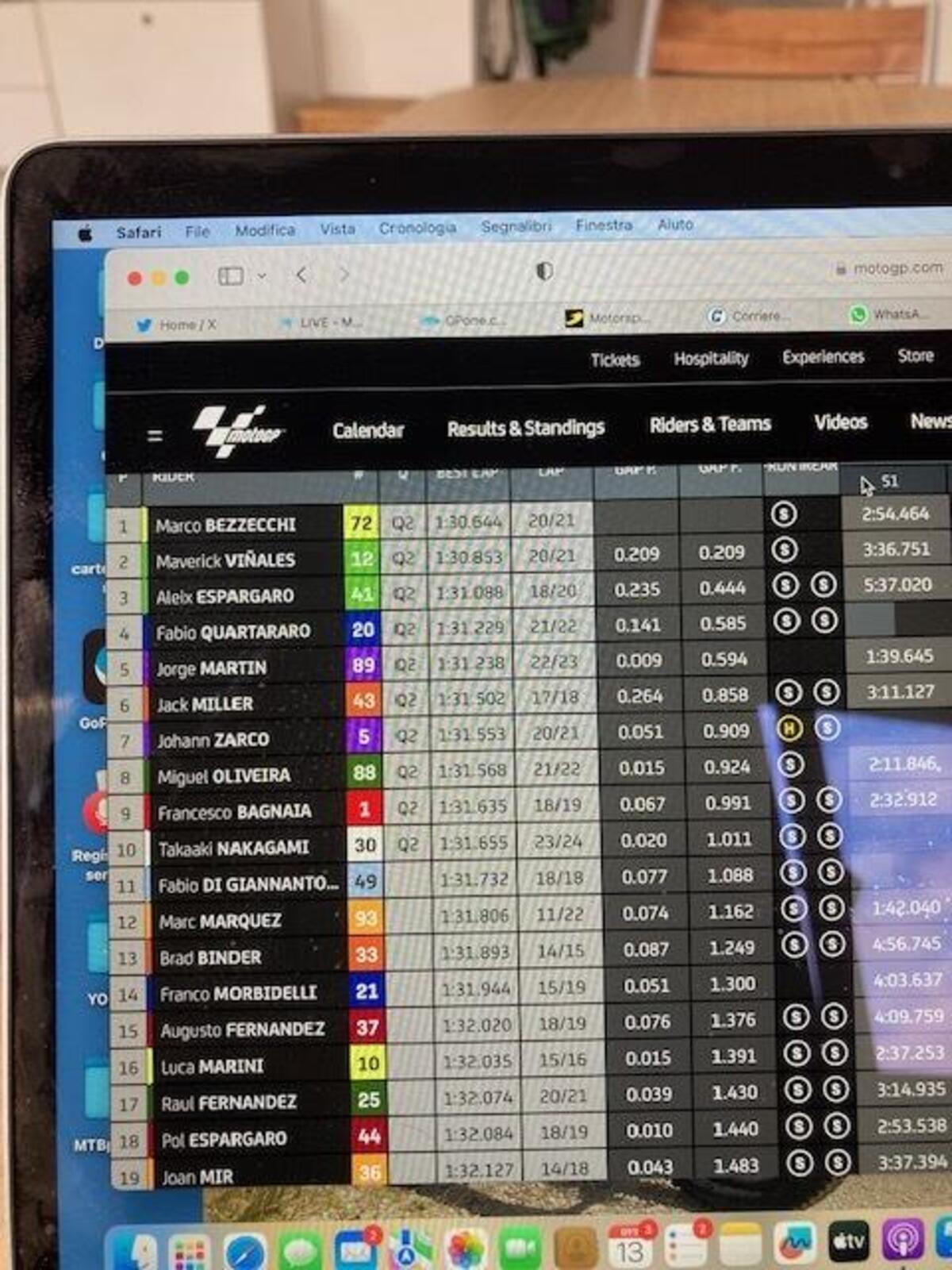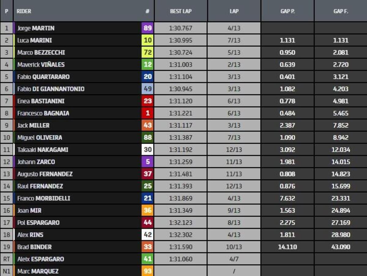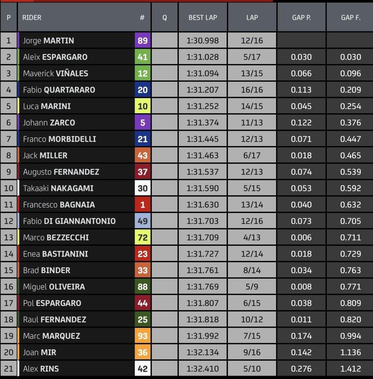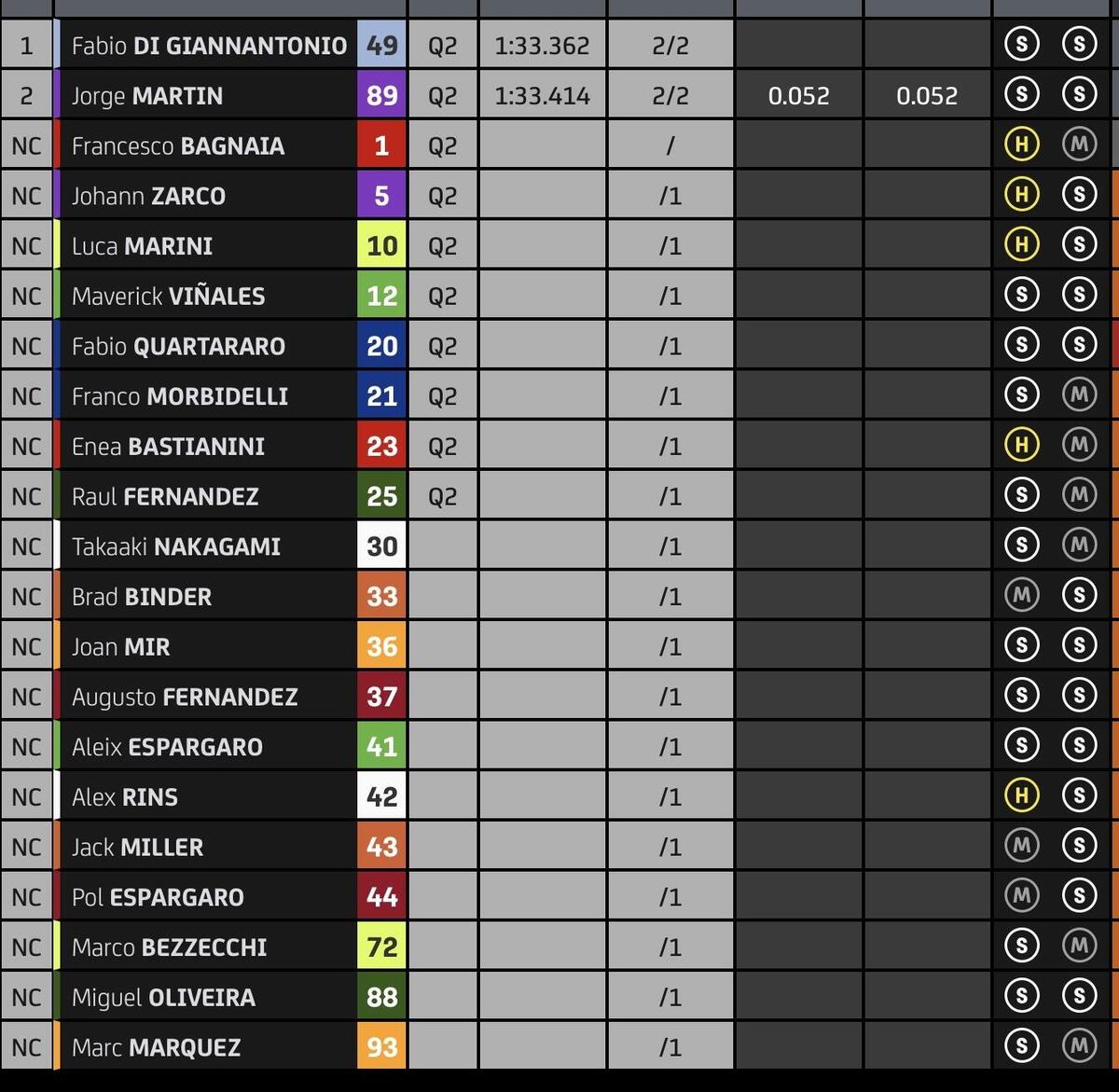Dopo aver conquistato, a sorpresa, il terzo tempo ieri, oggi Marco - operato domenica scorsa, non dimentichiamolo - ha faticato di più, sia nel turno di libere sia in qualifica, quando è caduto subito. Alla fine è nono, dietro a Marc Márquez - che questa volta ha battezzato Martin come pilota da seguire - e a Fabio Di Giannantonio, ottimo settimo. Giusto sottolineare la prova di Fabio: l’impegno non manca nonostante la difficile situazione per il futuro. Per Bastianini un 11esimo posto che rappresenta un piccolo passo in avanti, mentre Miguel Oliveira è 12esimo, forse poco concentrato: è caduto anche oggi.