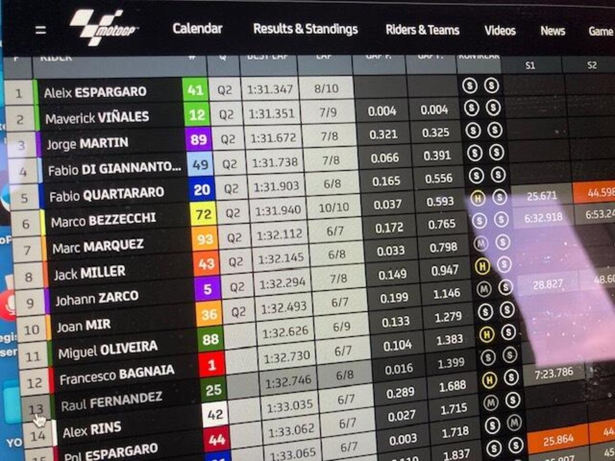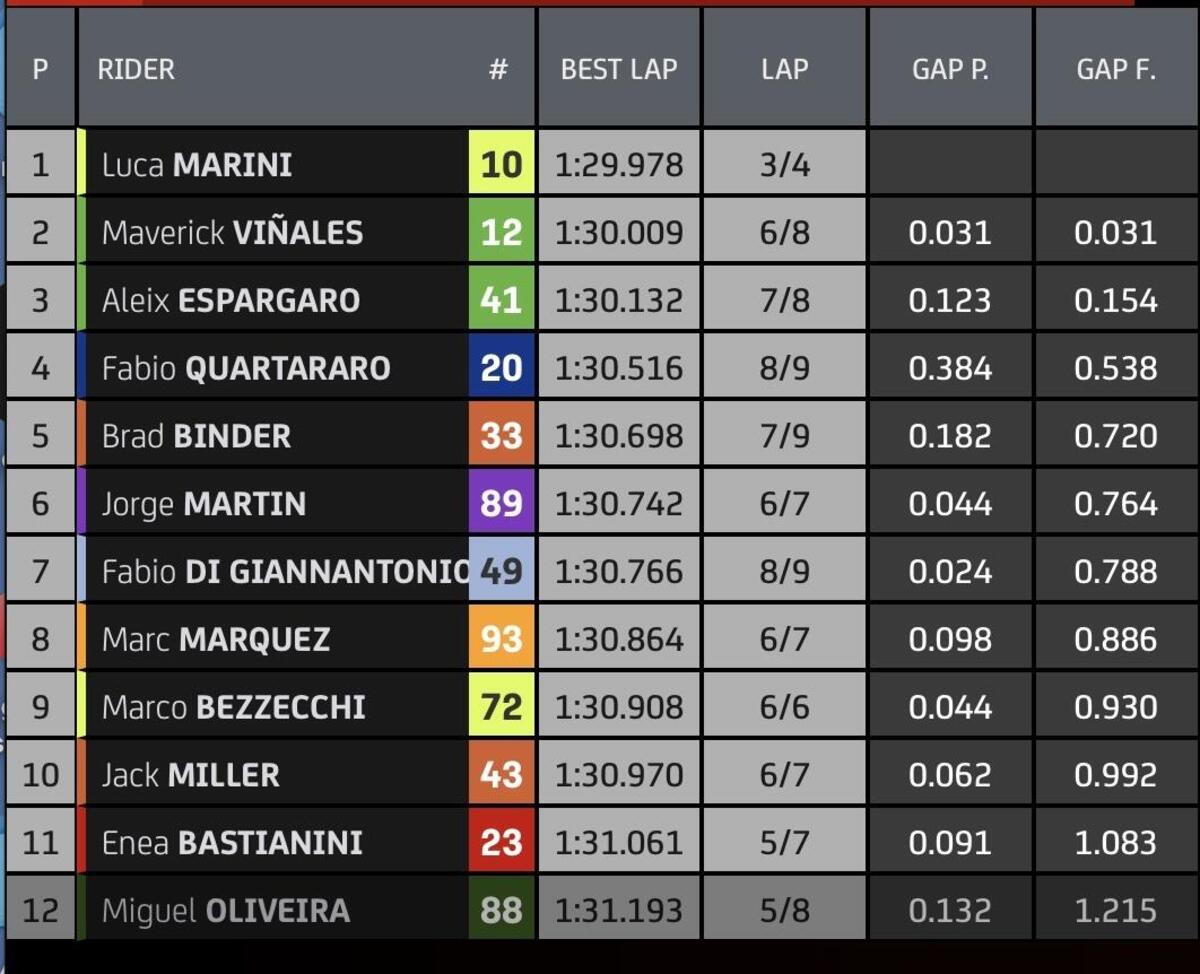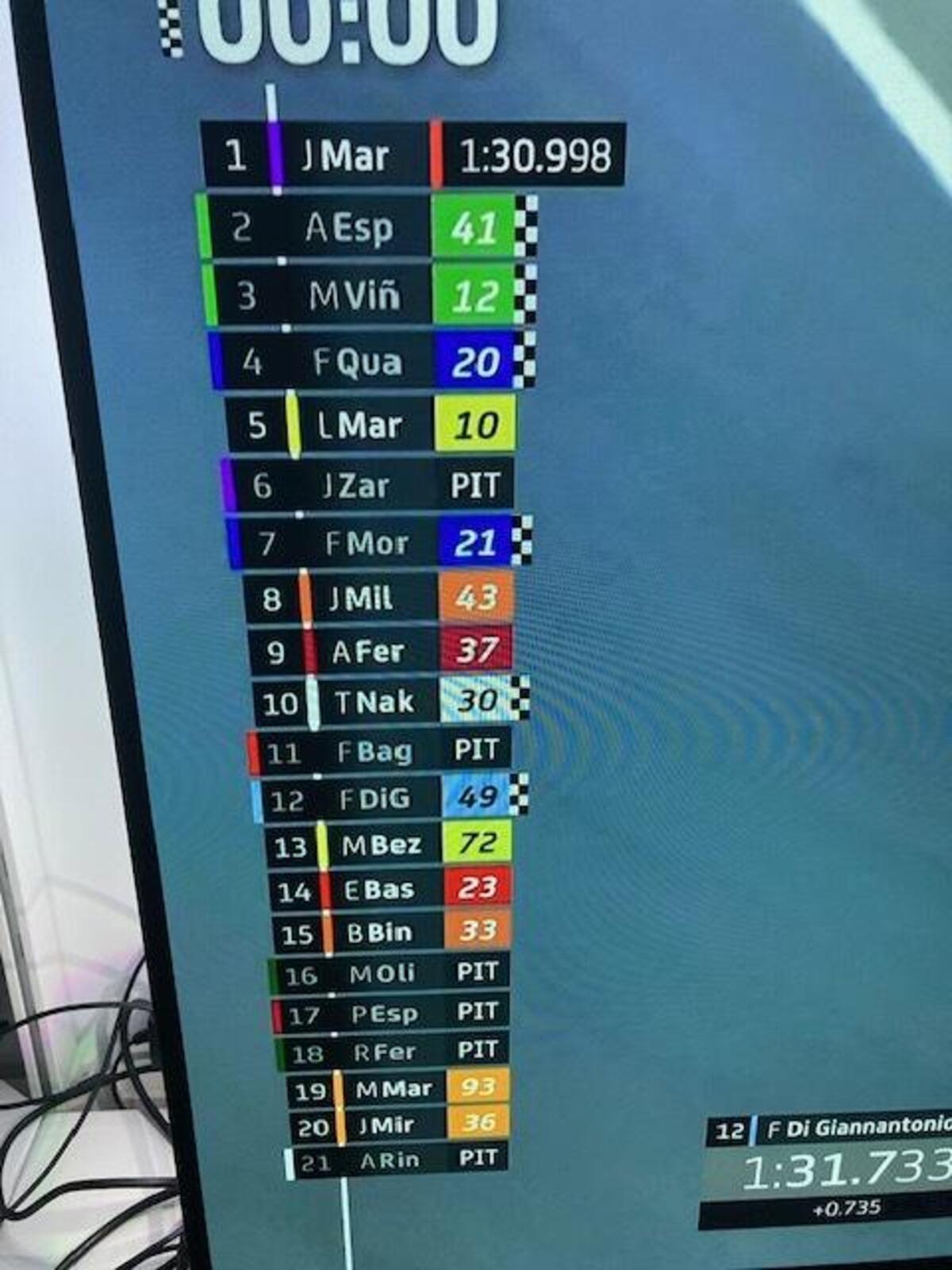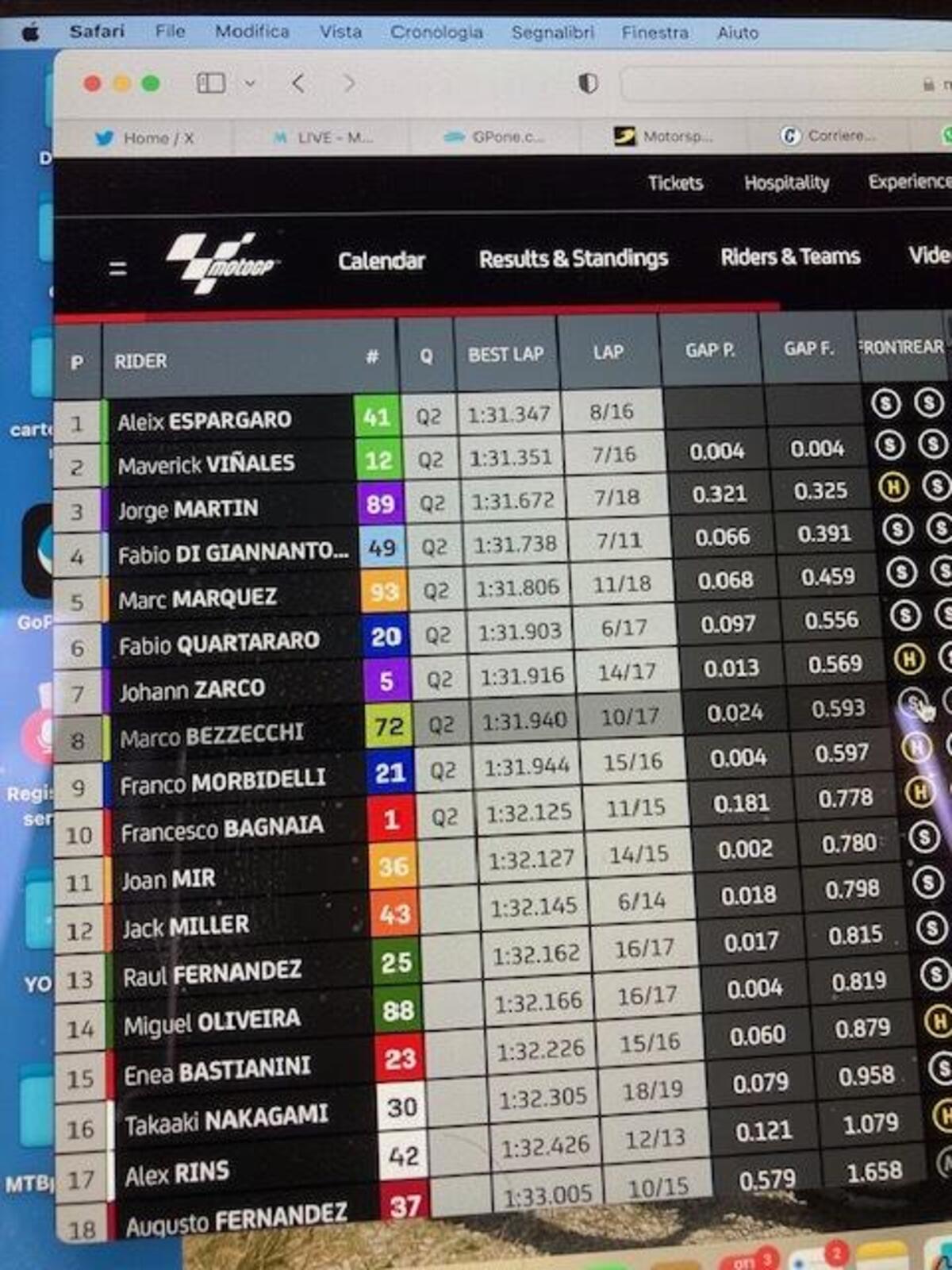 Dopo aver conquistato, a sorpresa, il terzo tempo ieri, oggi Marco - operato domenica scorsa, non dimentichiamolo - ha faticato di più, sia nel turno di libere sia in qualifica, quando è caduto subito. Alla fine è nono, dietro a Marc Márquez - che questa volta ha battezzato Martin come pilota da seguire - e a Fabio Di Giannantonio, ottimo settimo. Giusto sottolineare la prova di Fabio: l’impegno non manca nonostante la difficile situazione per il futuro. Per Bastianini un 11esimo posto che rappresenta un piccolo passo in avanti, mentre Miguel Oliveira è 12esimo, forse poco concentrato: è caduto anche oggi.