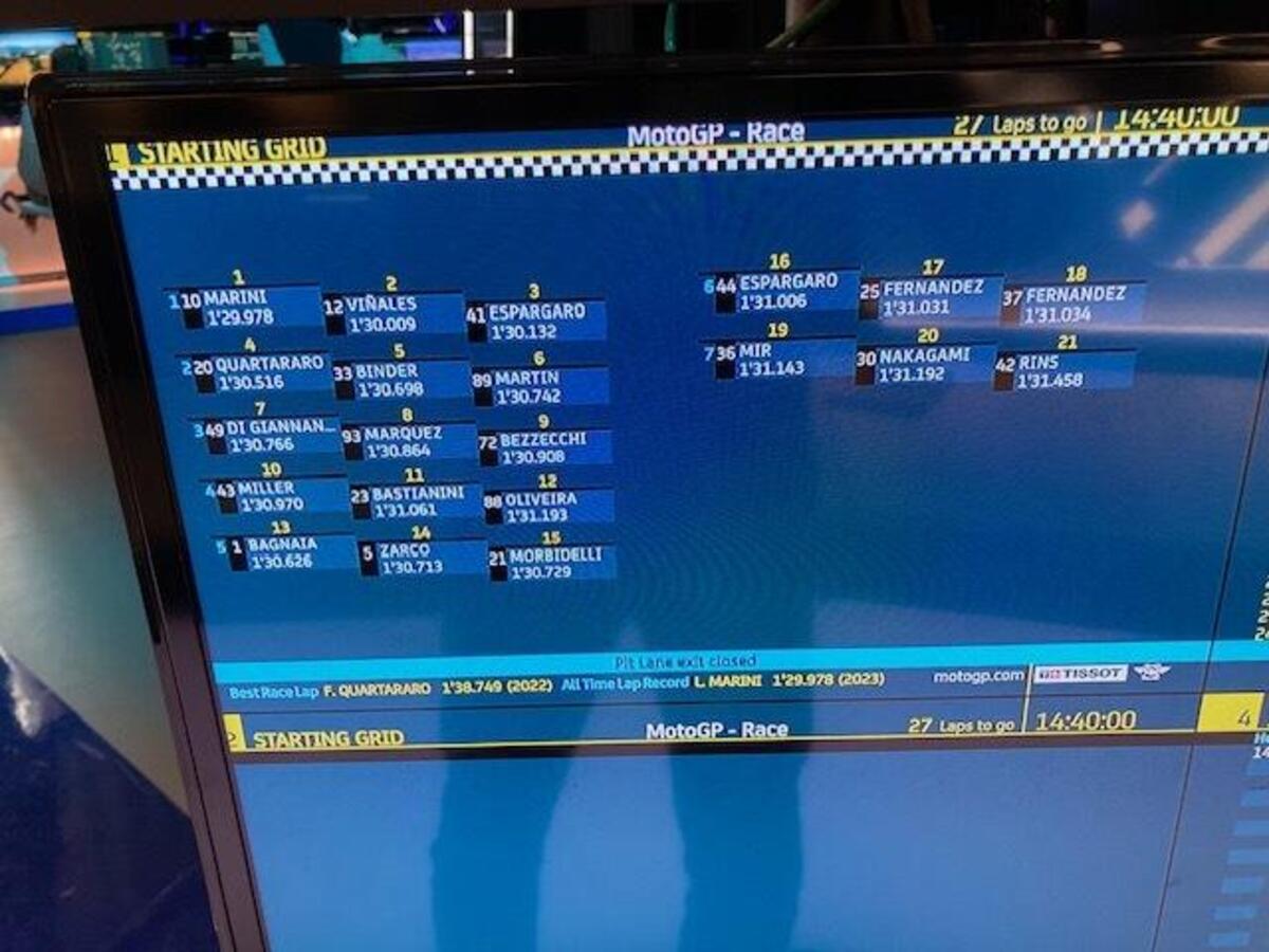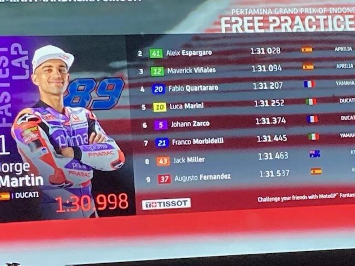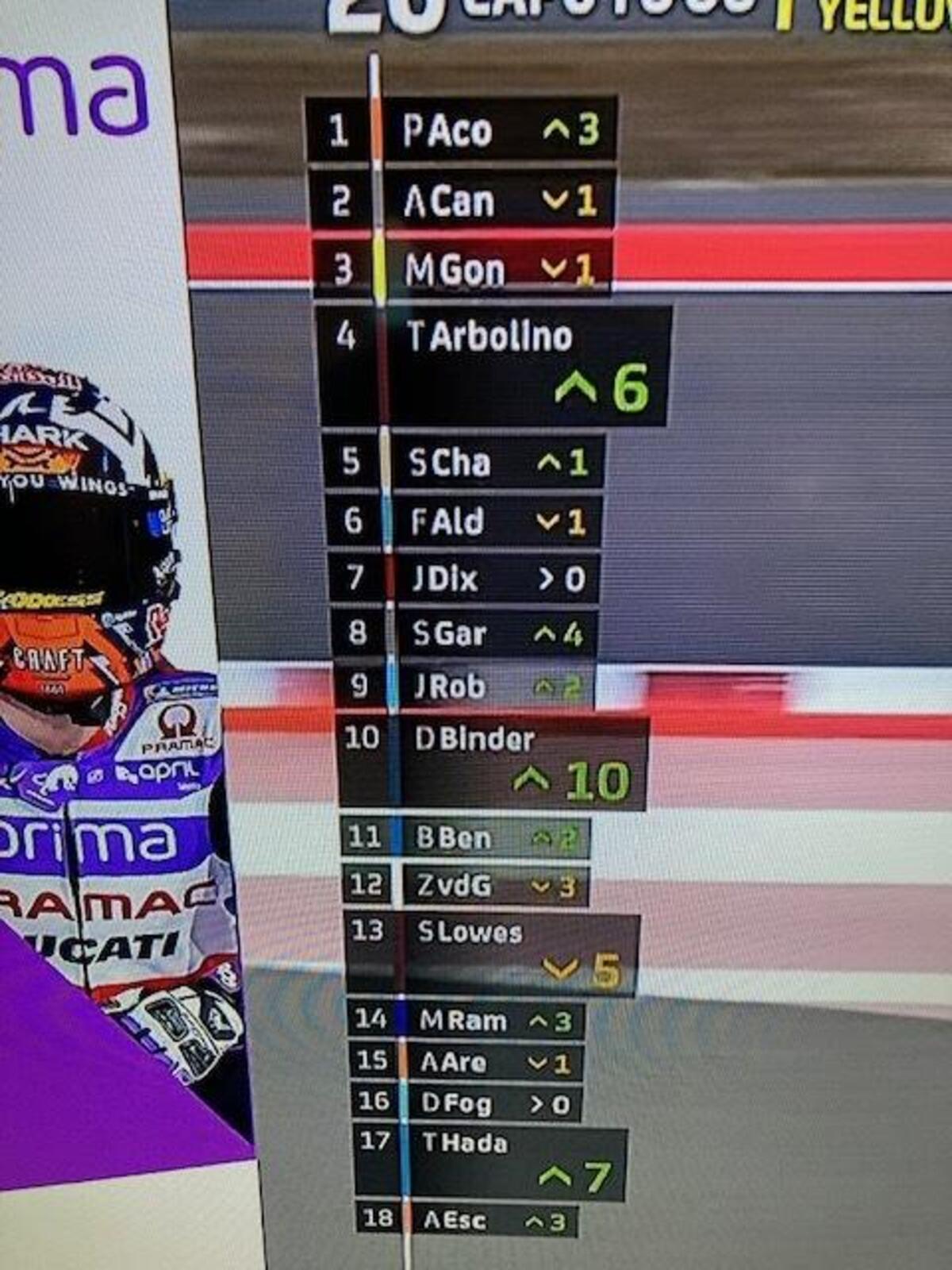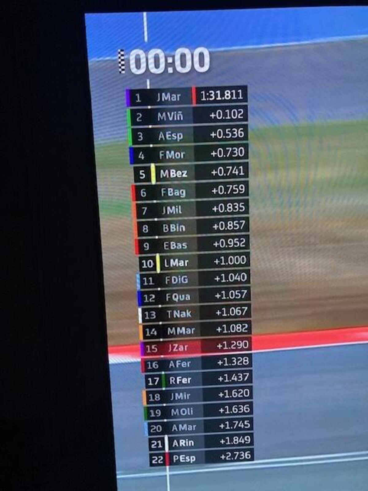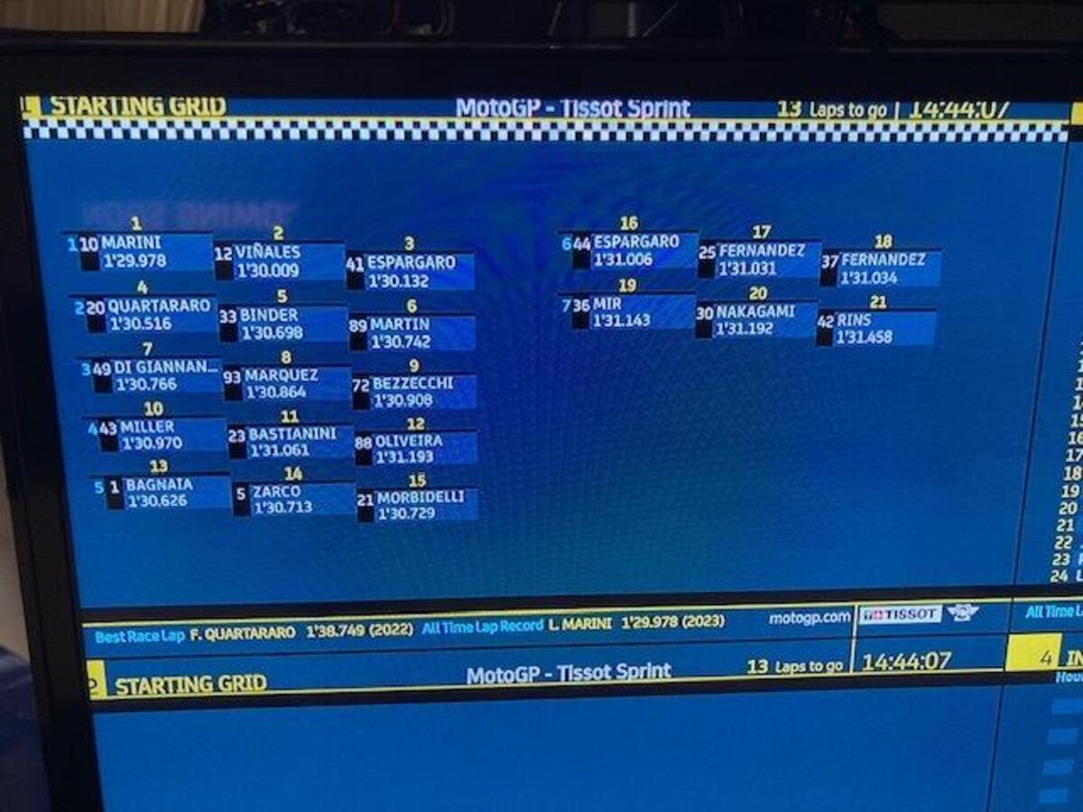 Dopo aver conquistato, a sorpresa, il terzo tempo ieri, oggi Marco - operato domenica scorsa, non dimentichiamolo - ha faticato di più, sia nel turno di libere sia in qualifica, quando è caduto subito. Alla fine è nono, dietro a Marc Márquez - che questa volta ha battezzato Martin come pilota da seguire - e a Fabio Di Giannantonio, ottimo settimo. Giusto sottolineare la prova di Fabio: l’impegno non manca nonostante la difficile situazione per il futuro. Per Bastianini un 11esimo posto che rappresenta un piccolo passo in avanti, mentre Miguel Oliveira è 12esimo, forse poco concentrato: è caduto anche oggi.