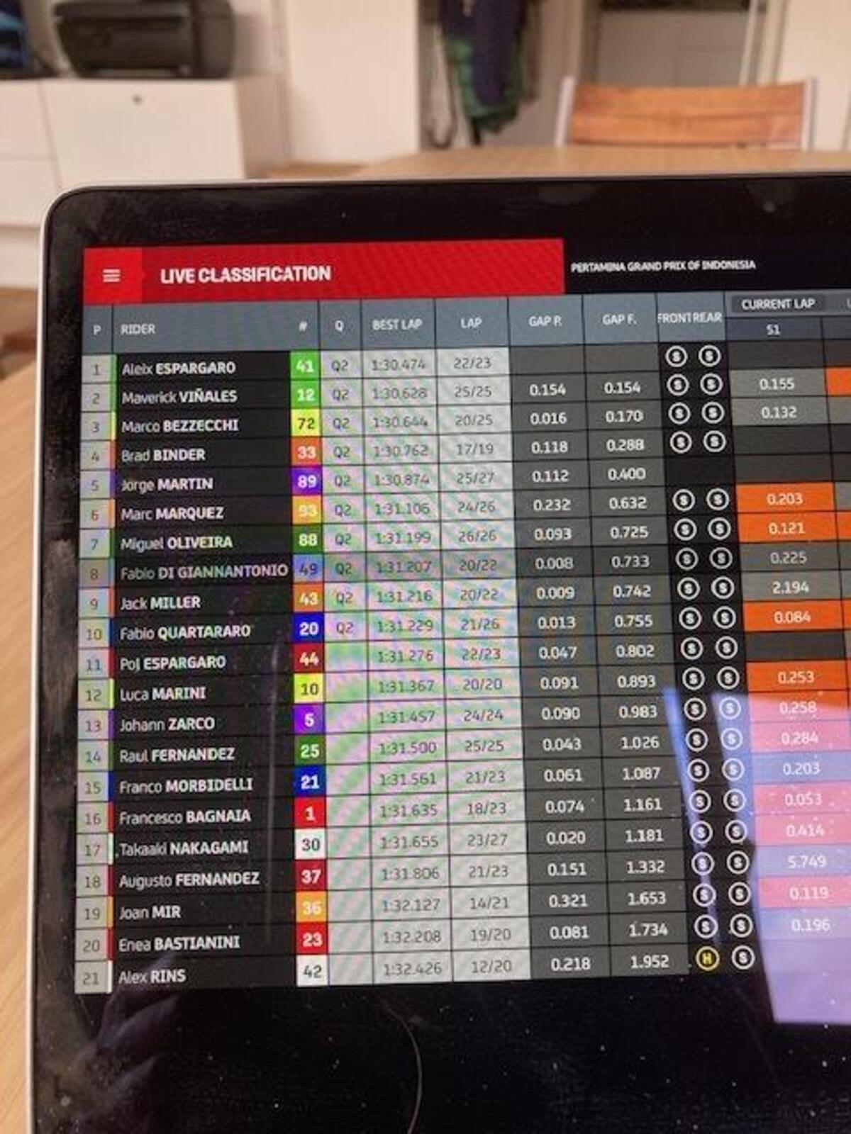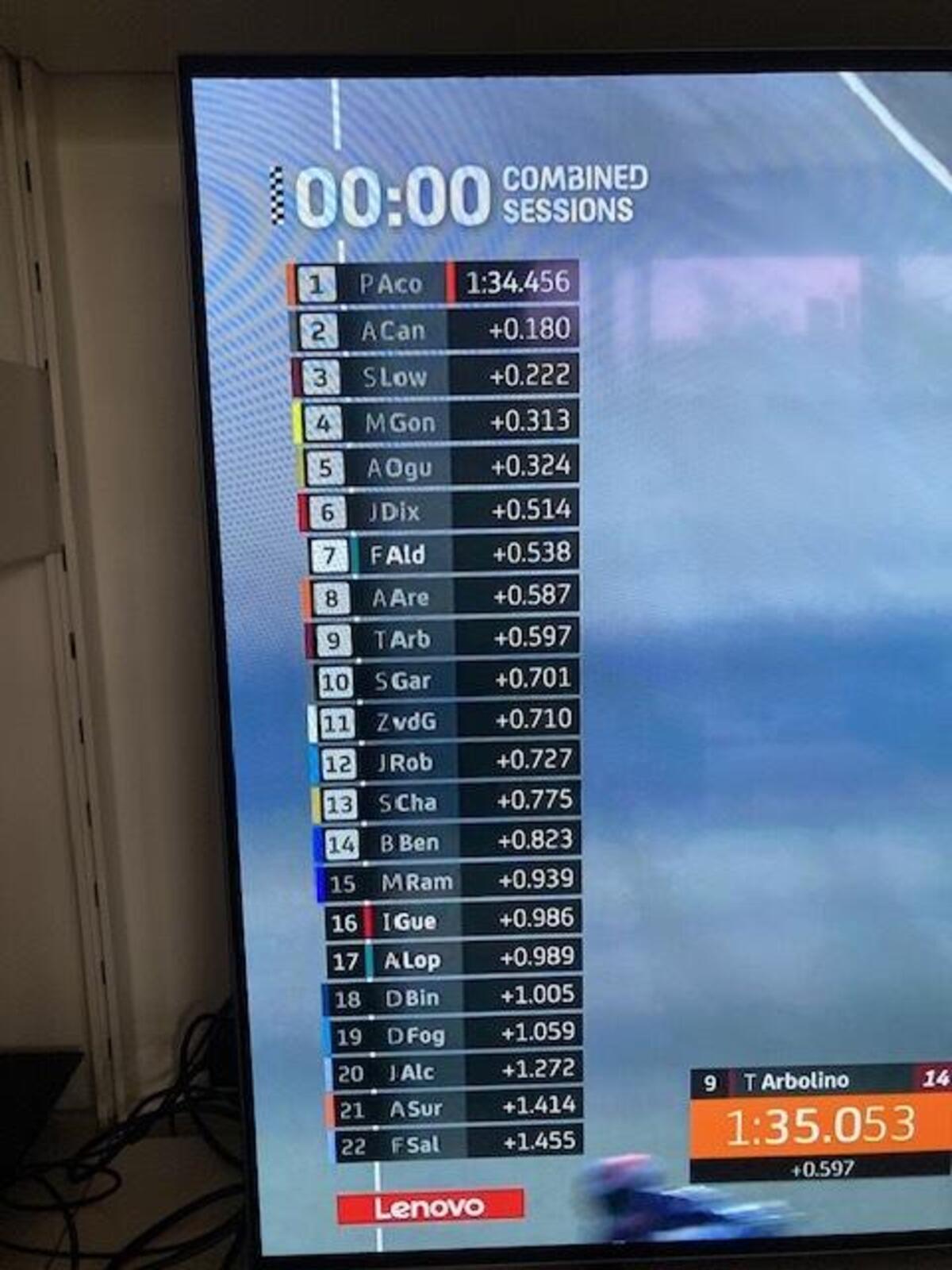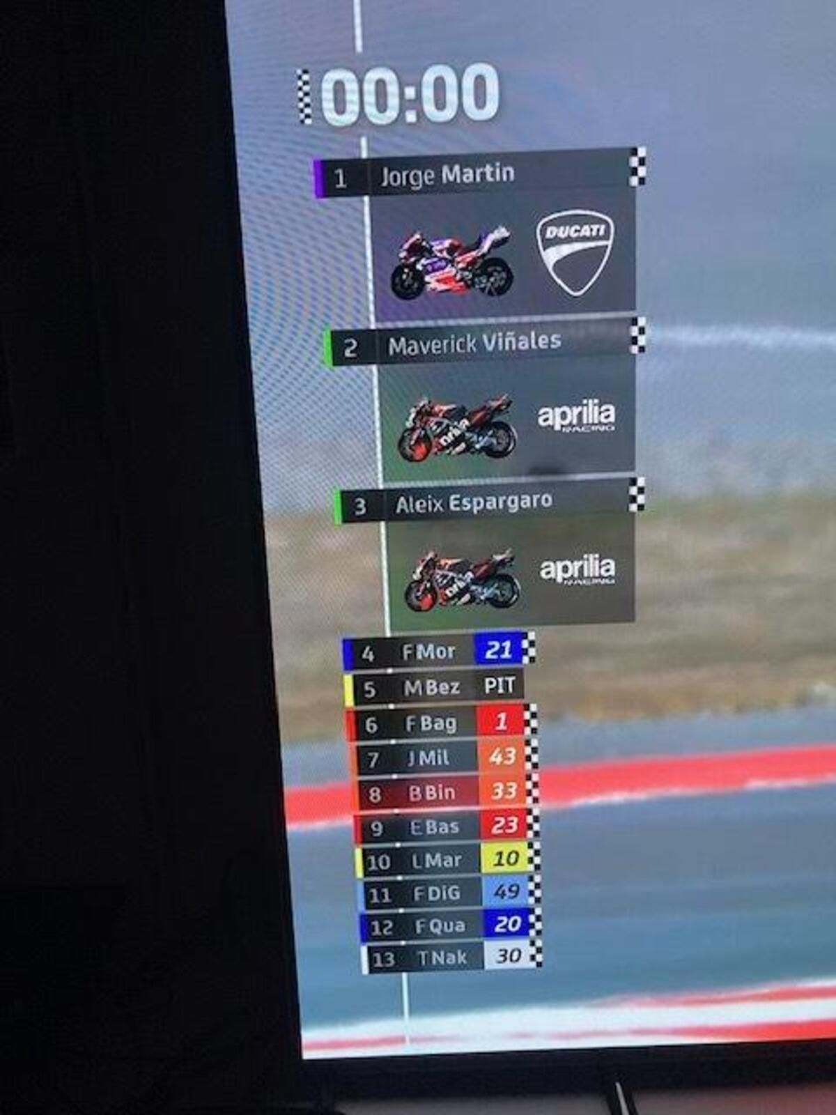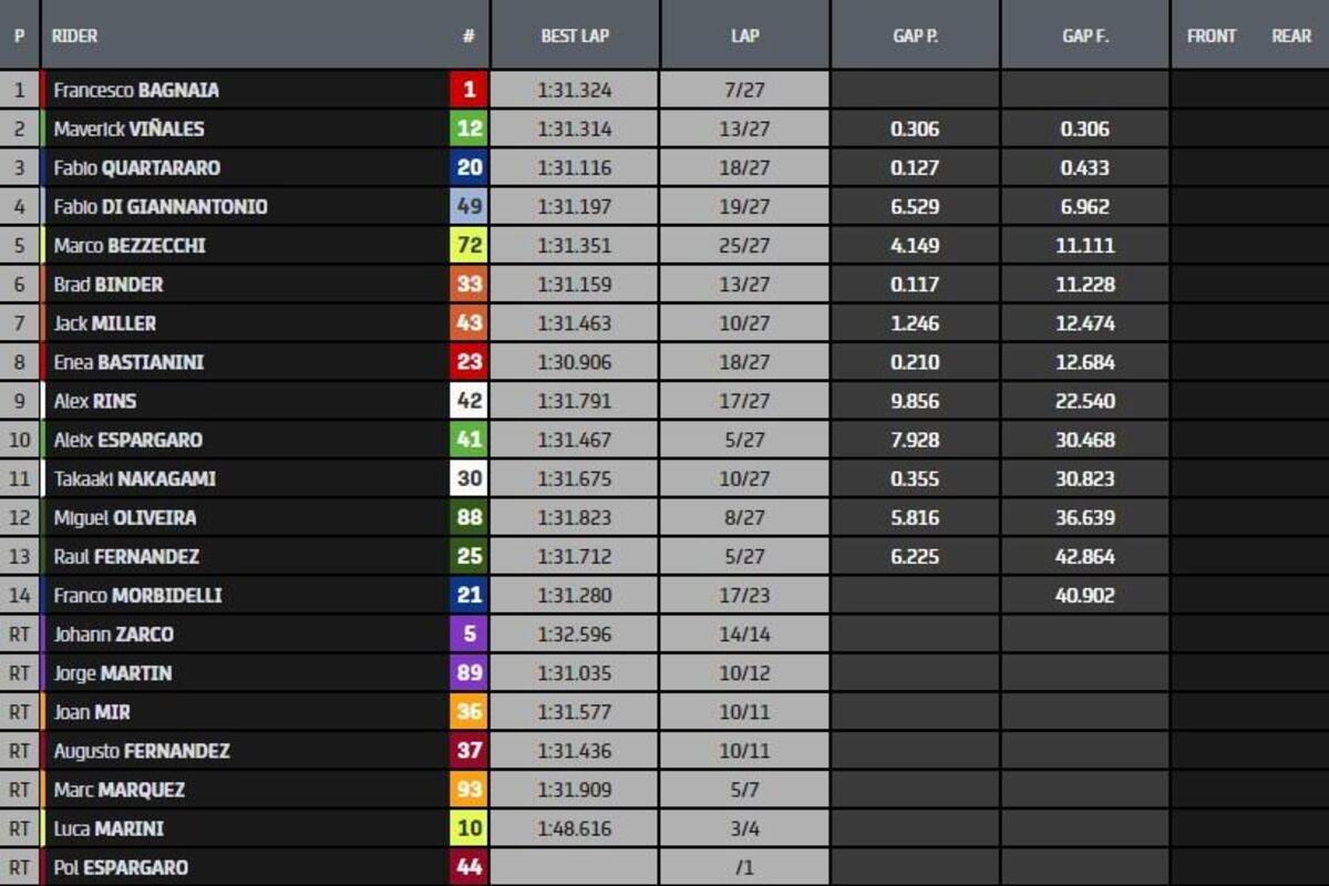 Dopo aver conquistato, a sorpresa, il terzo tempo ieri, oggi Marco - operato domenica scorsa, non dimentichiamolo - ha faticato di più, sia nel turno di libere sia in qualifica, quando è caduto subito. Alla fine è nono, dietro a Marc Márquez - che questa volta ha battezzato Martin come pilota da seguire - e a Fabio Di Giannantonio, ottimo settimo. Giusto sottolineare la prova di Fabio: l’impegno non manca nonostante la difficile situazione per il futuro. Per Bastianini un 11esimo posto che rappresenta un piccolo passo in avanti, mentre Miguel Oliveira è 12esimo, forse poco concentrato: è caduto anche oggi.