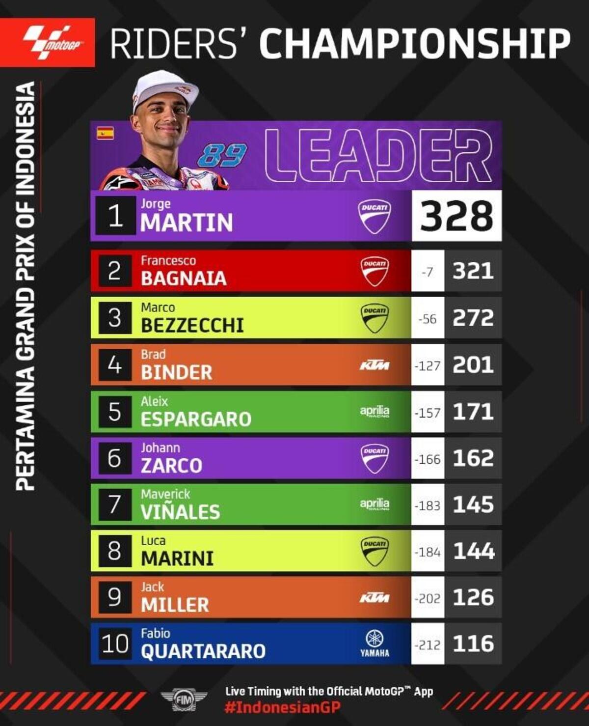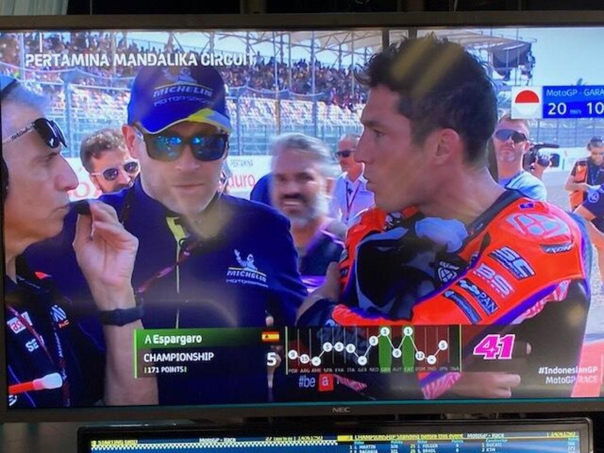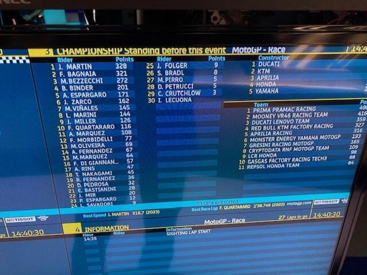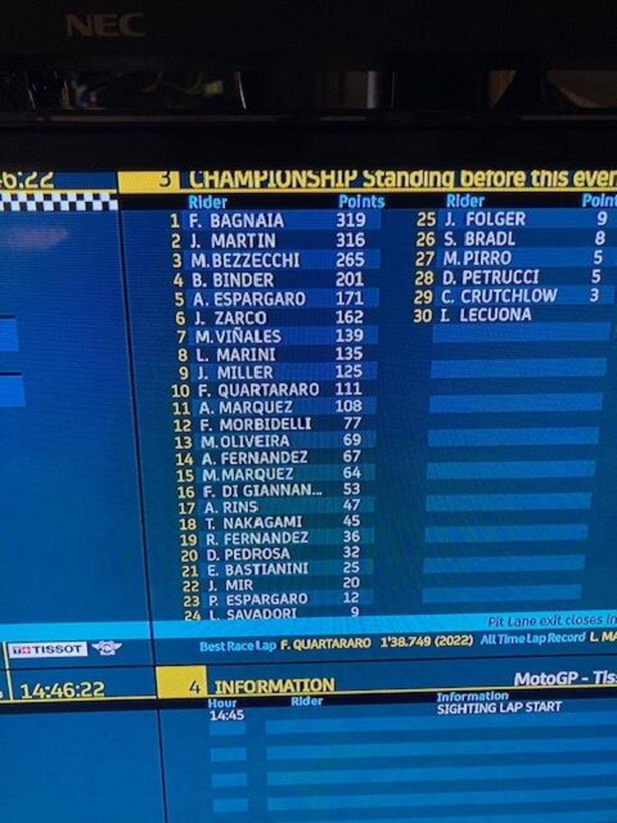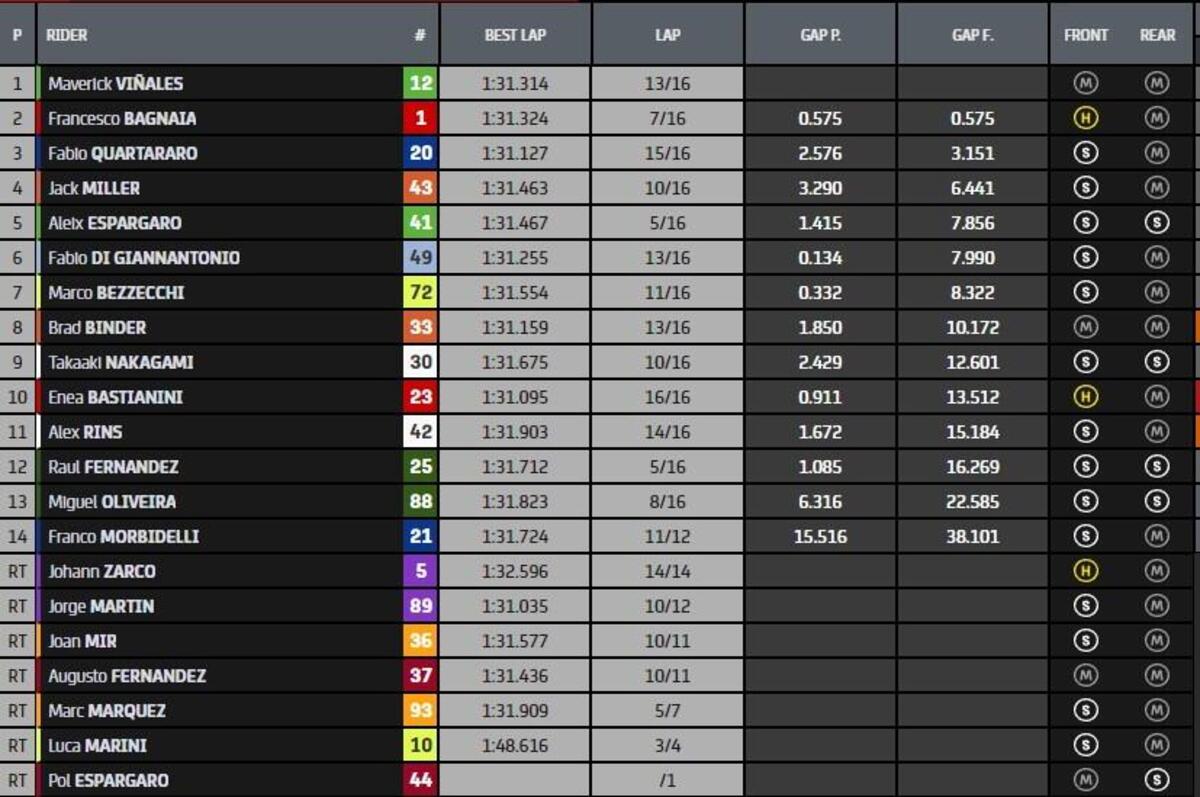 Dopo aver conquistato, a sorpresa, il terzo tempo ieri, oggi Marco - operato domenica scorsa, non dimentichiamolo - ha faticato di più, sia nel turno di libere sia in qualifica, quando è caduto subito. Alla fine è nono, dietro a Marc Márquez - che questa volta ha battezzato Martin come pilota da seguire - e a Fabio Di Giannantonio, ottimo settimo. Giusto sottolineare la prova di Fabio: l’impegno non manca nonostante la difficile situazione per il futuro. Per Bastianini un 11esimo posto che rappresenta un piccolo passo in avanti, mentre Miguel Oliveira è 12esimo, forse poco concentrato: è caduto anche oggi.