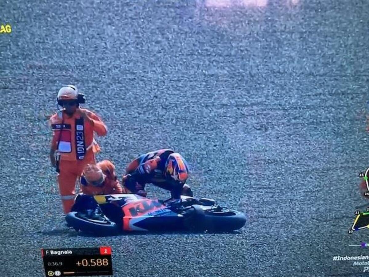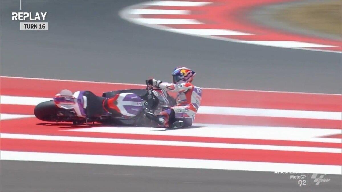 Francesco Bagnaia in Q1: una anomalia che non accadeva dal GP di Spagna. “Anche lì ero n difficoltà, poi ho vinto…” aveva sottolineato ieri il campione del mondo. Questa volta, però, è diverso: Pecco non riesce a passare in Q2, beffato, ironia della sorte, nel finale dal compagno di squadra Enea Bastianini, fino a quel momento in difficoltà. Assieme a Bastianini passa in Q2 un velocissimo Luca Marini: altra beffa, un’altra Ducati davanti a Pecco. Che è delusissimo: torna al box, lascia la moto ai meccanici e abbandona subito il box con il casco in testa, seguito dalla sorella Carla. Mai visto così. Per Jorge Martin una grande occasione, che però sfrutta solo in parte: arriva al T4 con casco rosso, con un buon vantaggio, a va lungo alla 16. Sembra poter controllare la moto, invece non ce la fa, cade. Torna al box riparte appena può. Si migliora, sale al sesto posto, ma si ferma lì: per lui seconda fila. Poteva fare meglio.