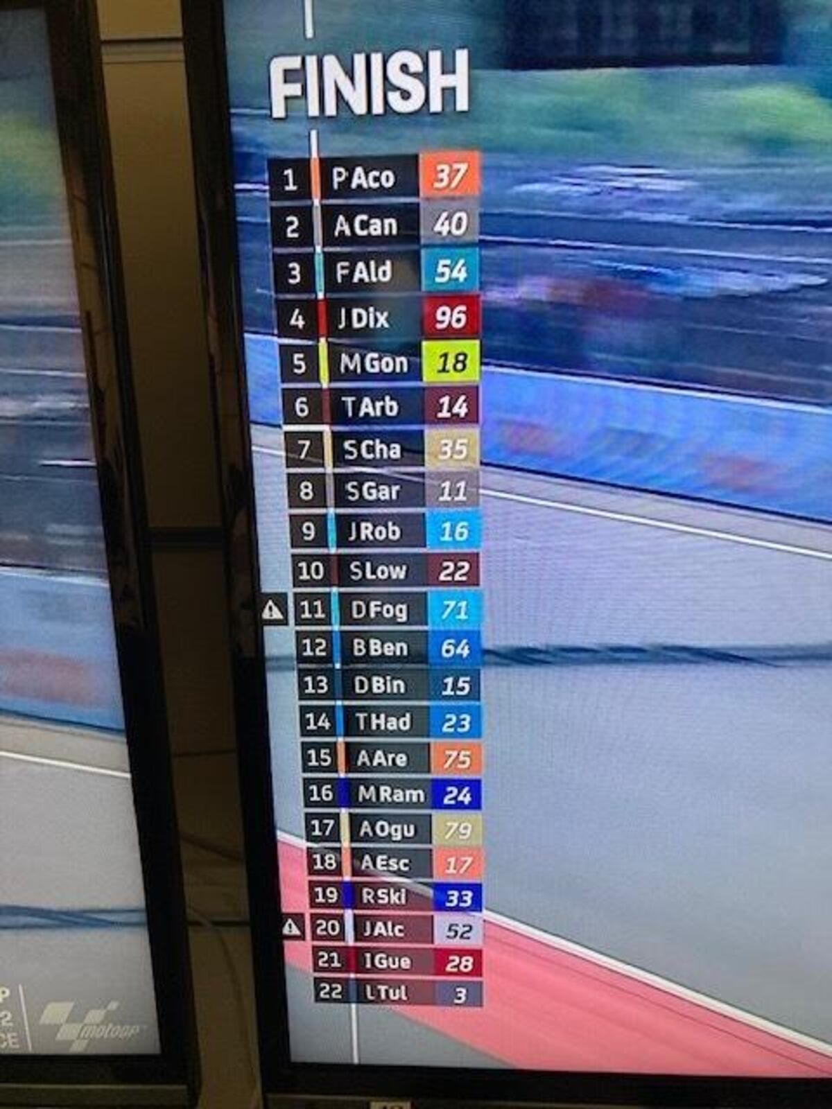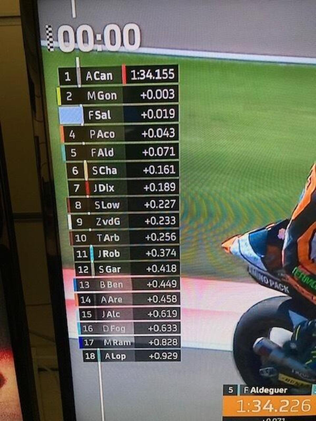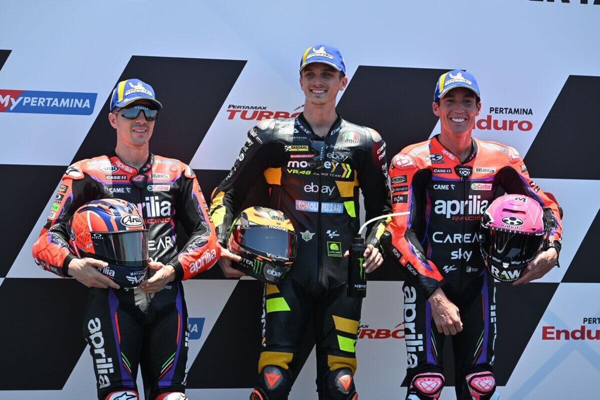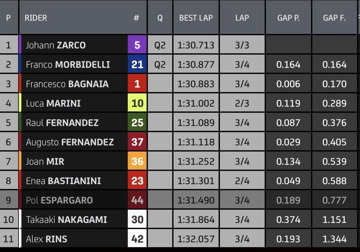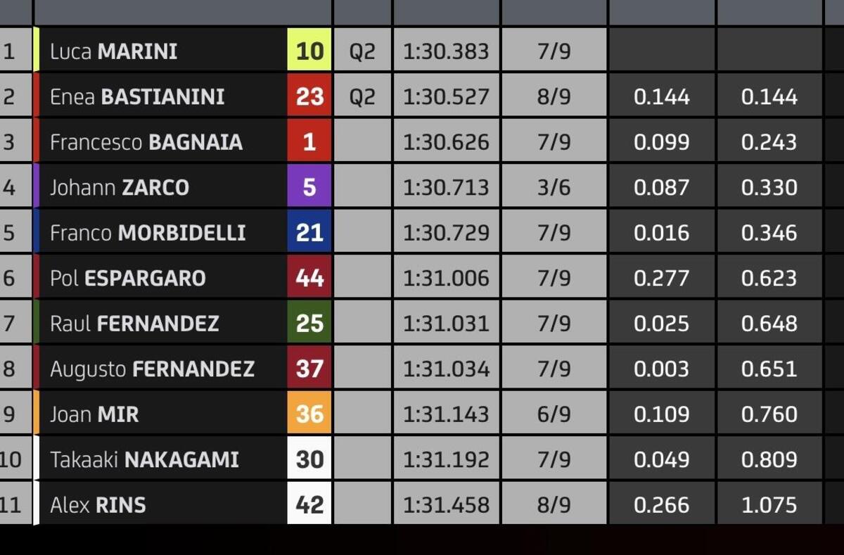 Marini, passato dalla Q1, fa una sola uscita, ma gli basta: 1’29”978 gli vale la prima pole. Non dimentichiamo che Luca è al rientro dopo l’infortunio: bravo davvero. Ha il passo per stare davanti? Solo in parte, ma scattando davanti, su una pista che ha una sola traiettoria pulita, può puntare in alto. Come i due piloti Aprilia che, a differenza di Marini, hanno anche un gran ritmo: questa volta, è Maverick Viñales davanti, con Aleix Espargaro alle sue spalle: tra i due, 123 millesimi, mentre i primi tergono racchiusi in 154 millesimi. Aprilia qui va molto bene, la moto è competitiva, i piloti sono in forma: l’obiettivo, è ovvio, è vincere.