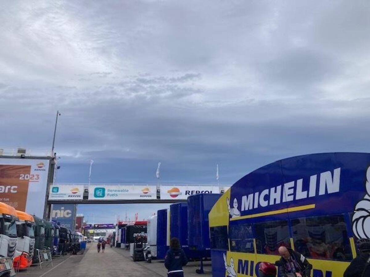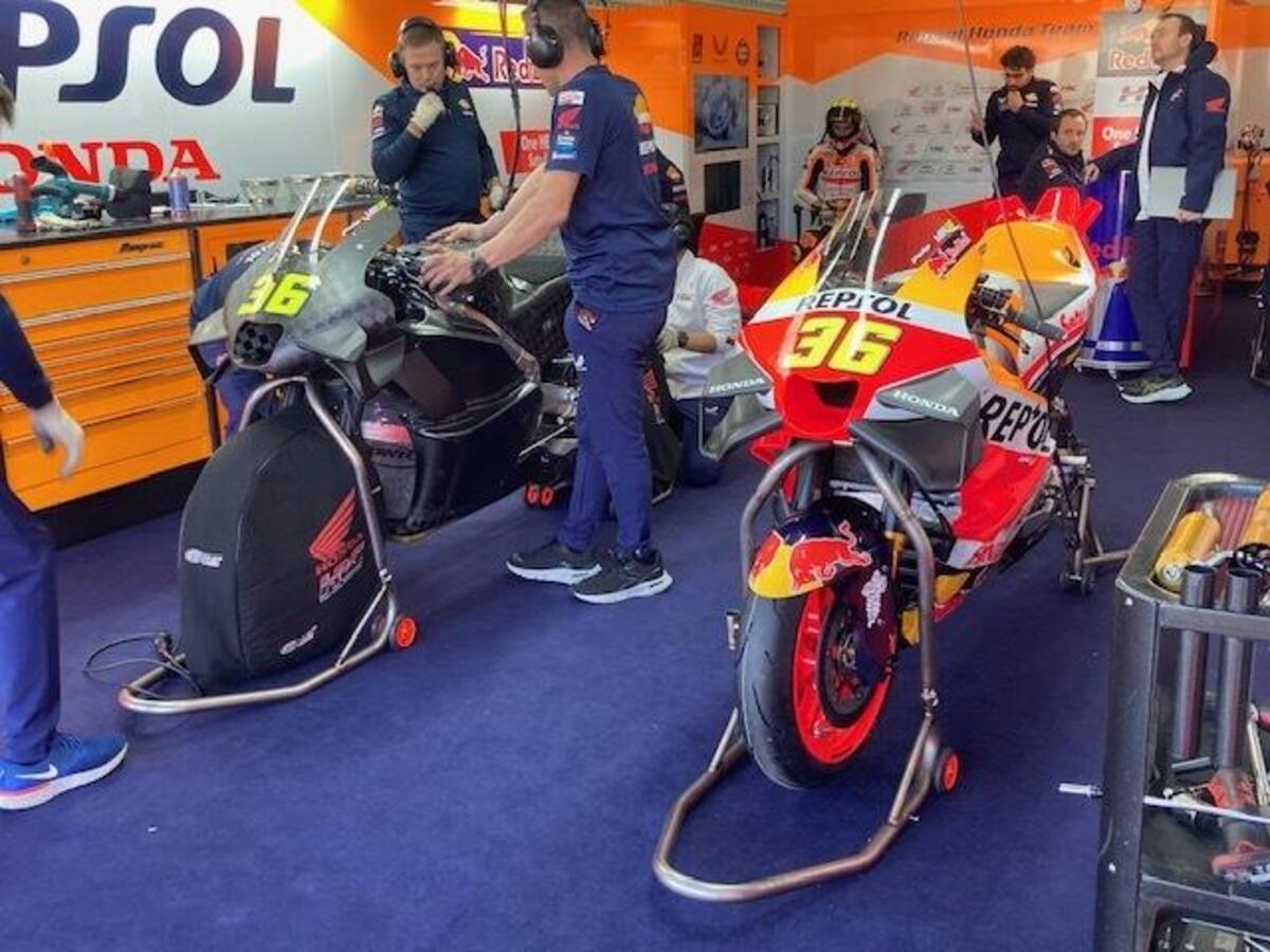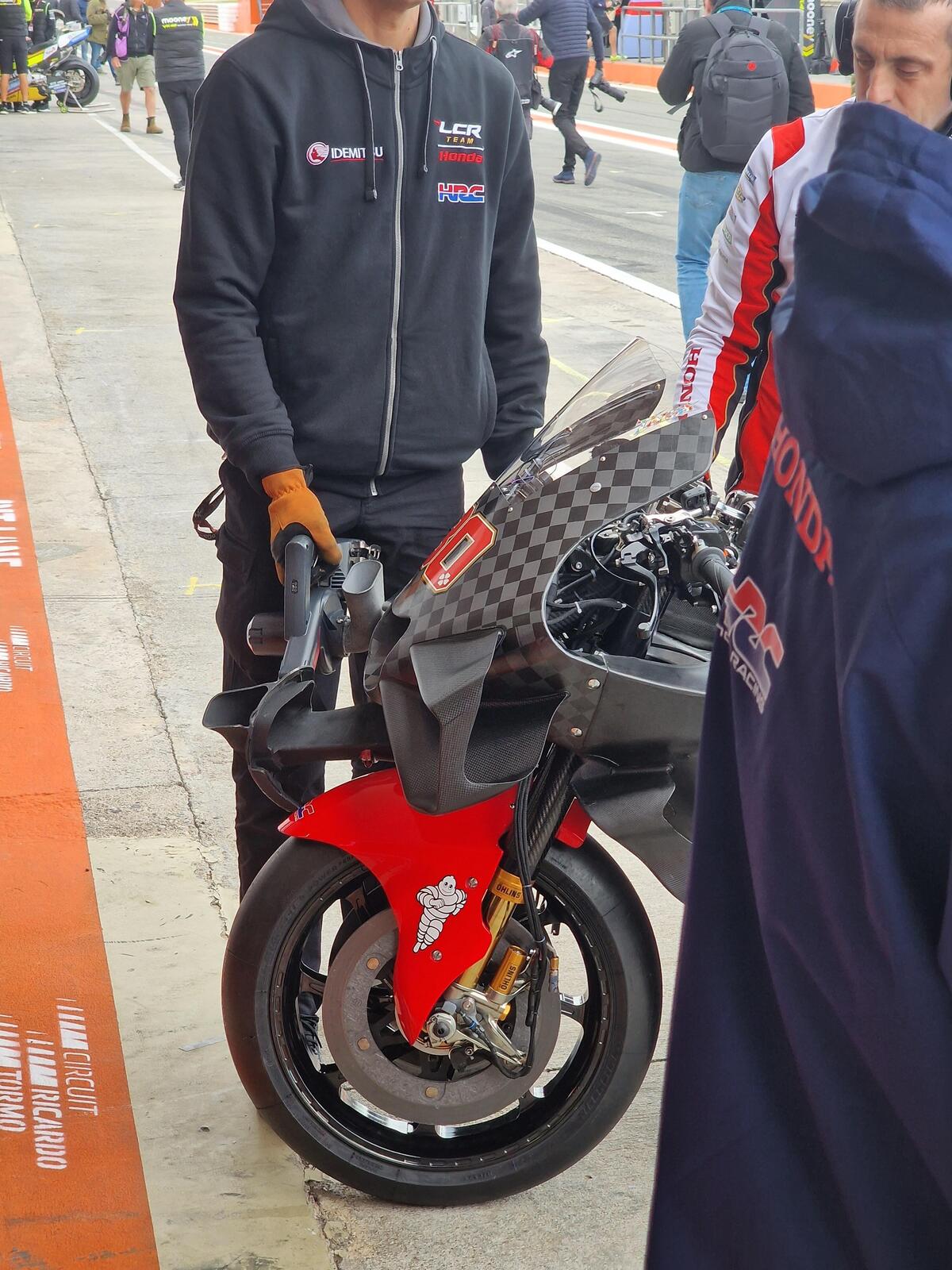 Fa un gran freddo e c’è vento, non si girerà tanto presto. I tecnici cominciano a scaldare le moto. Ecco i primissimi commenti del nostro Giulio Bernardelle: “Honda: moto completamente nuova, rifatto il telaio, nuova aerodinamica nella parte bassa della carenatura. Aggiunto volume nella zona del codone, nuovi scarichi. Yamaha: anche la M1 è cambiata tanto, scarichi nuovi, nuovo codone e nuovo telaio”.