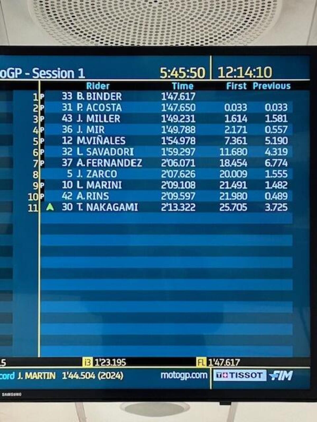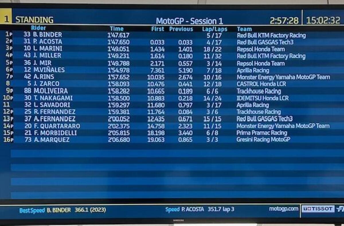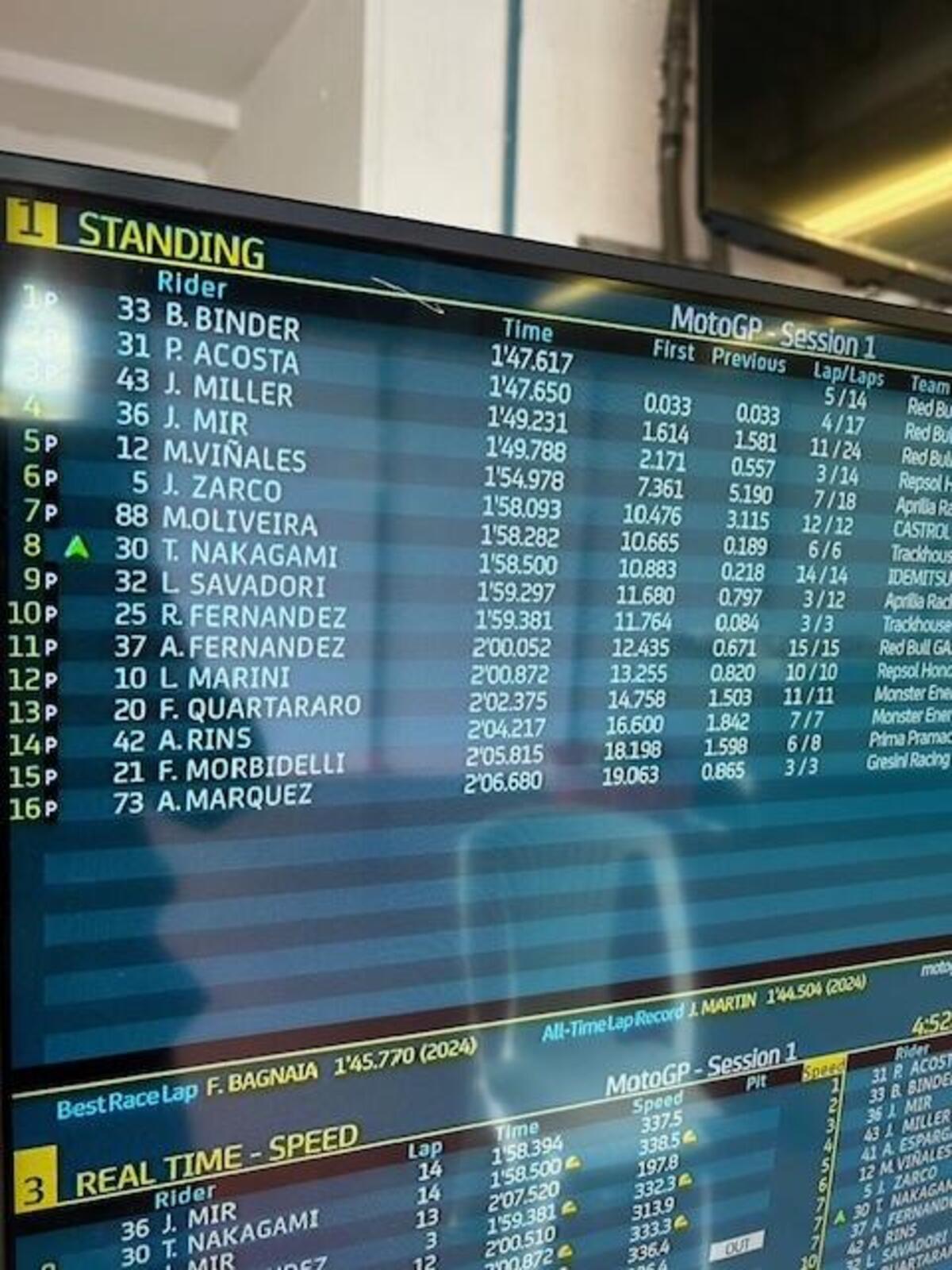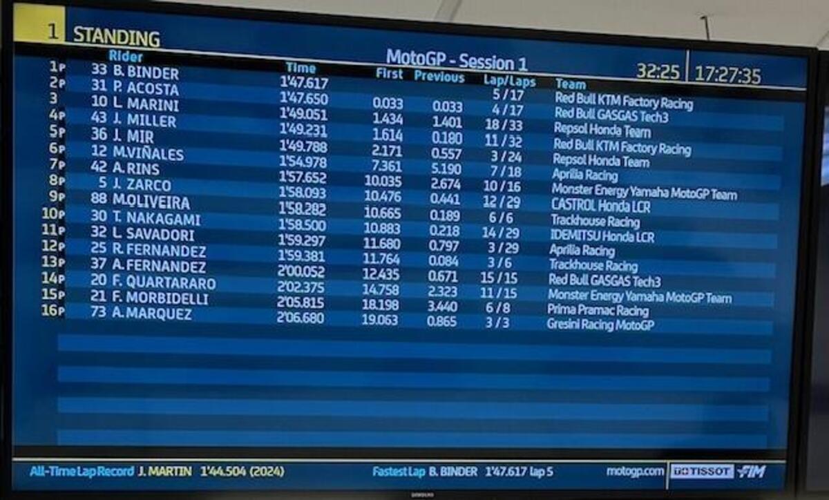 intanto sono scesi in pista anche Binder e Mir. Nella prima ora solo 5