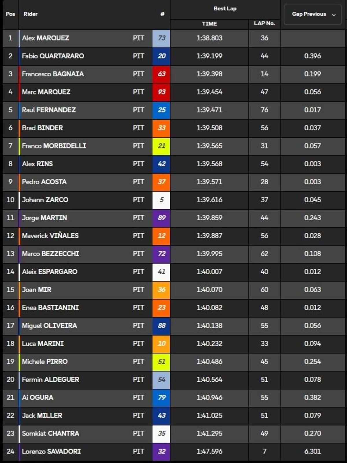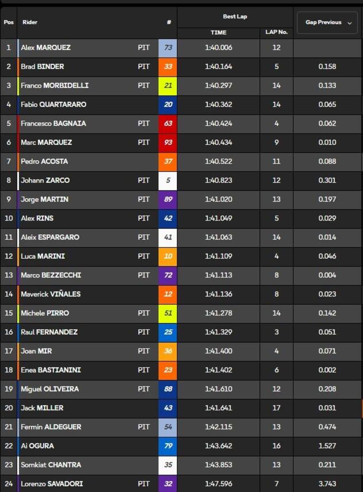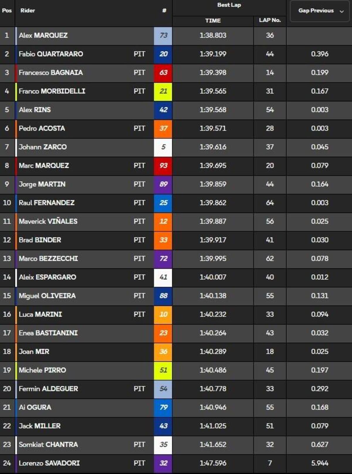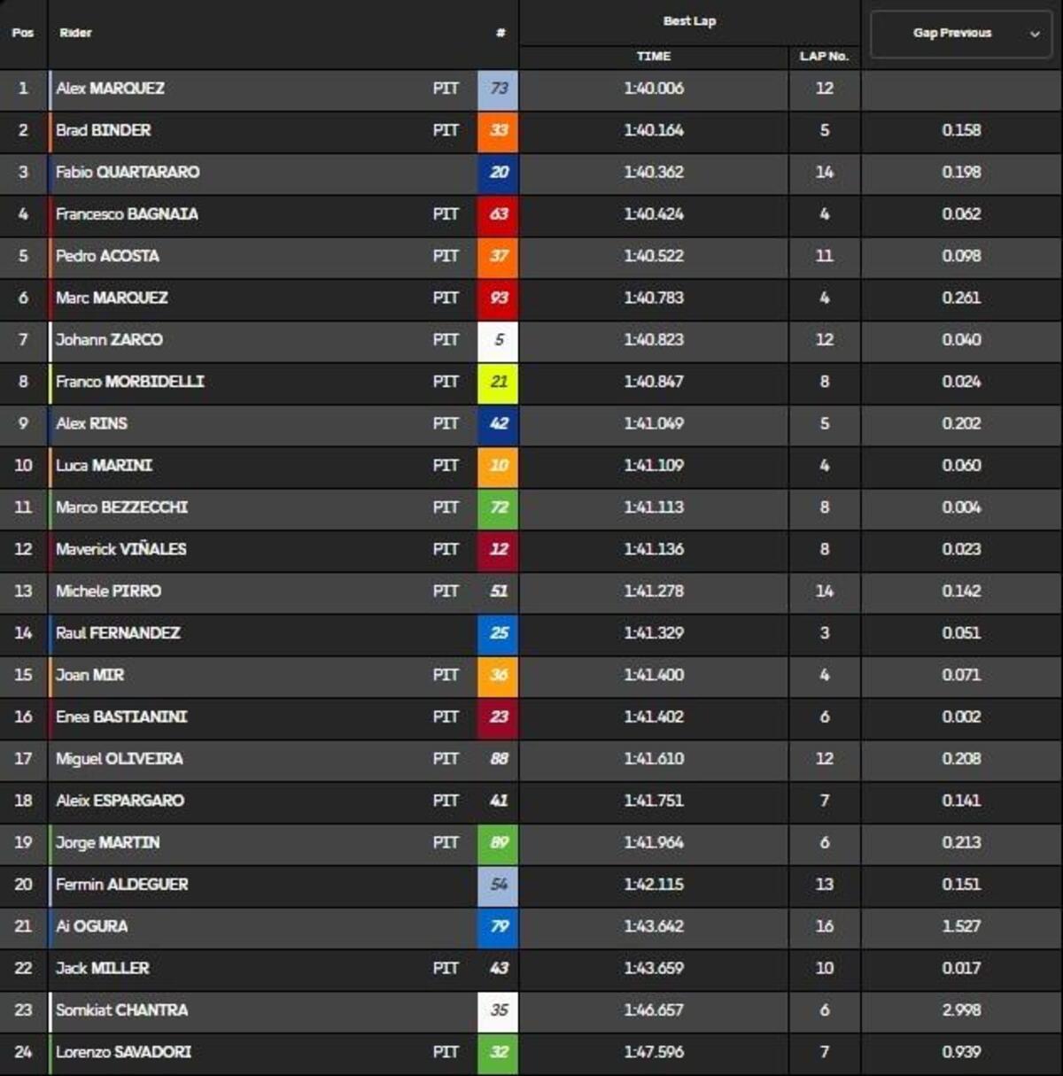 fine turno - alex marquez davanti a tutti, poi quartarao, bagnaia e marc marquez