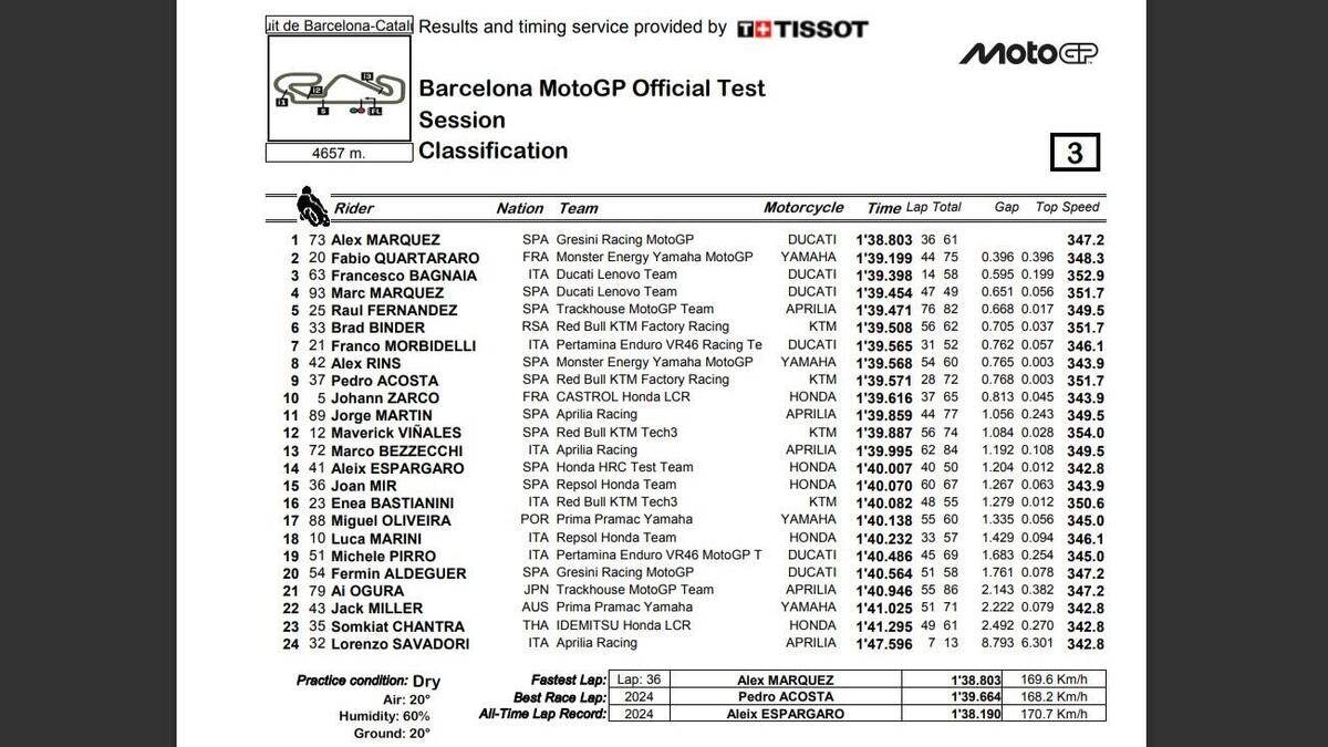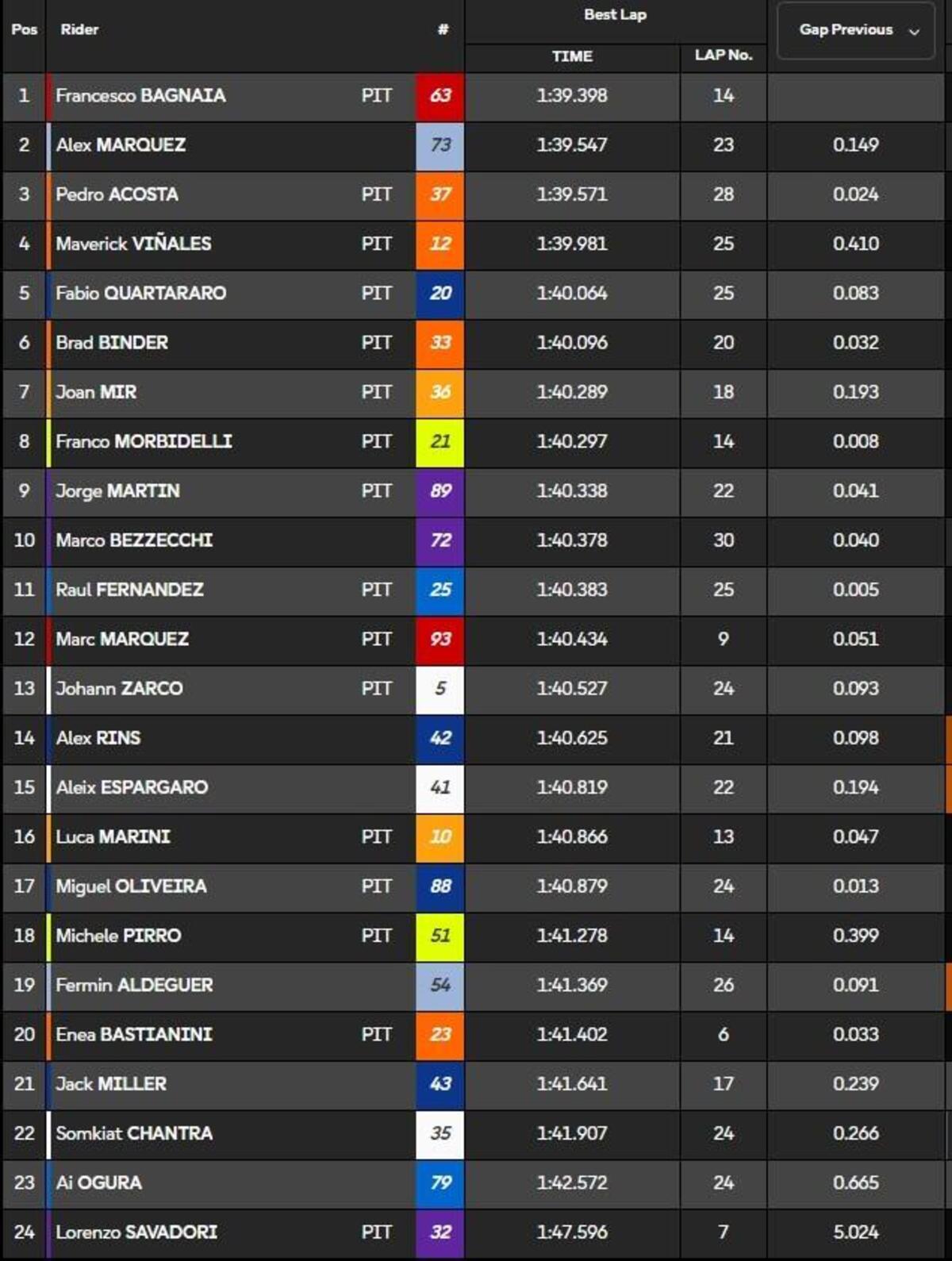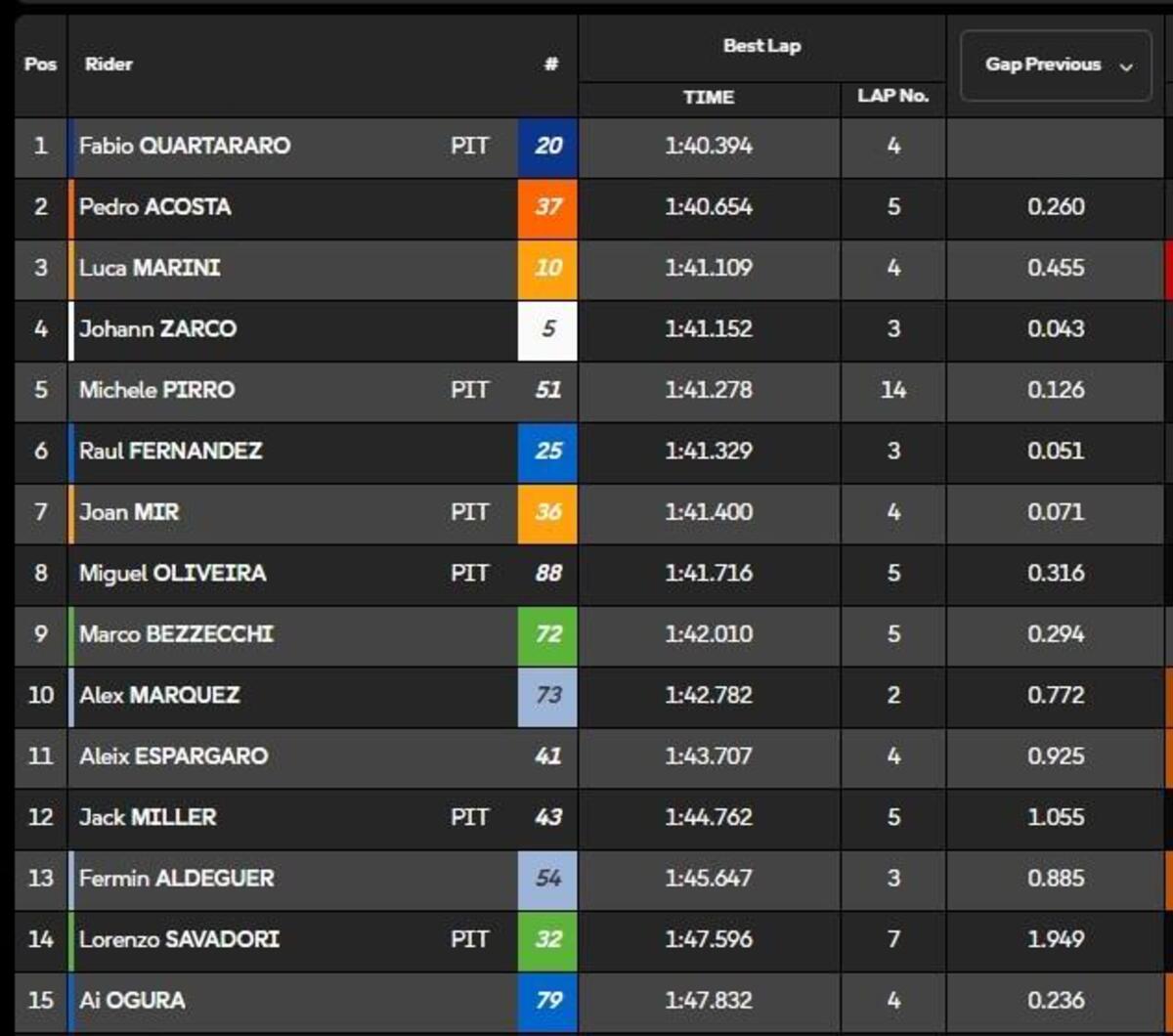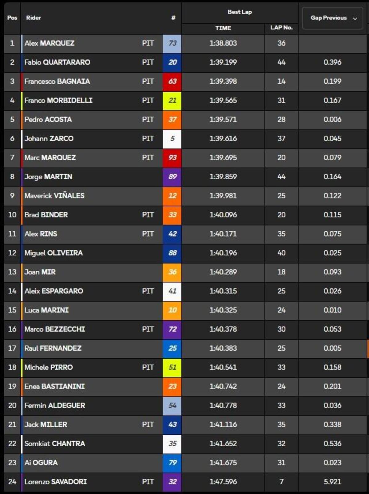 fine turno - alex marquez davanti a tutti, poi quartarao, bagnaia e marc marquez
