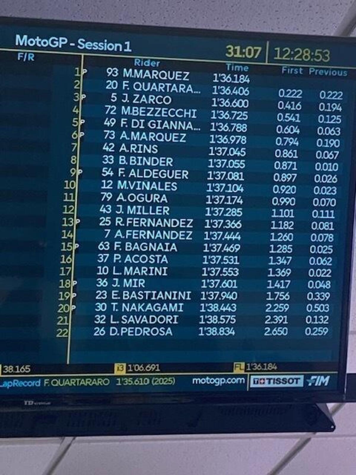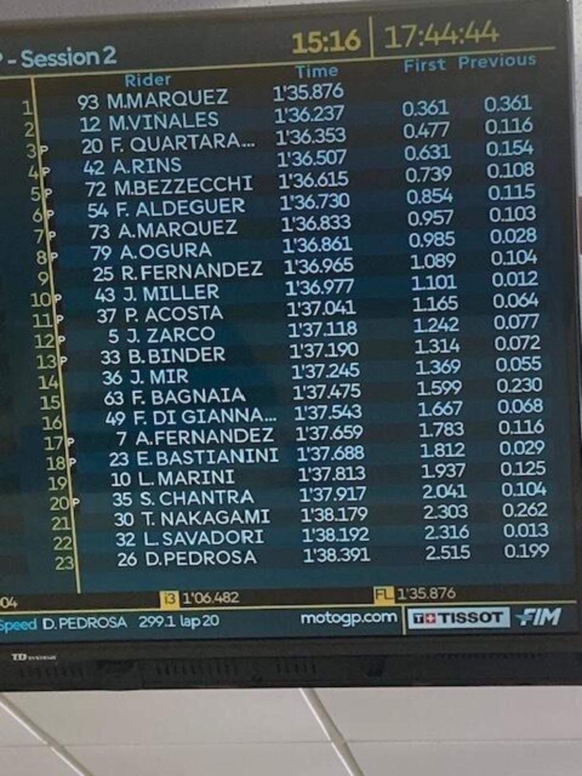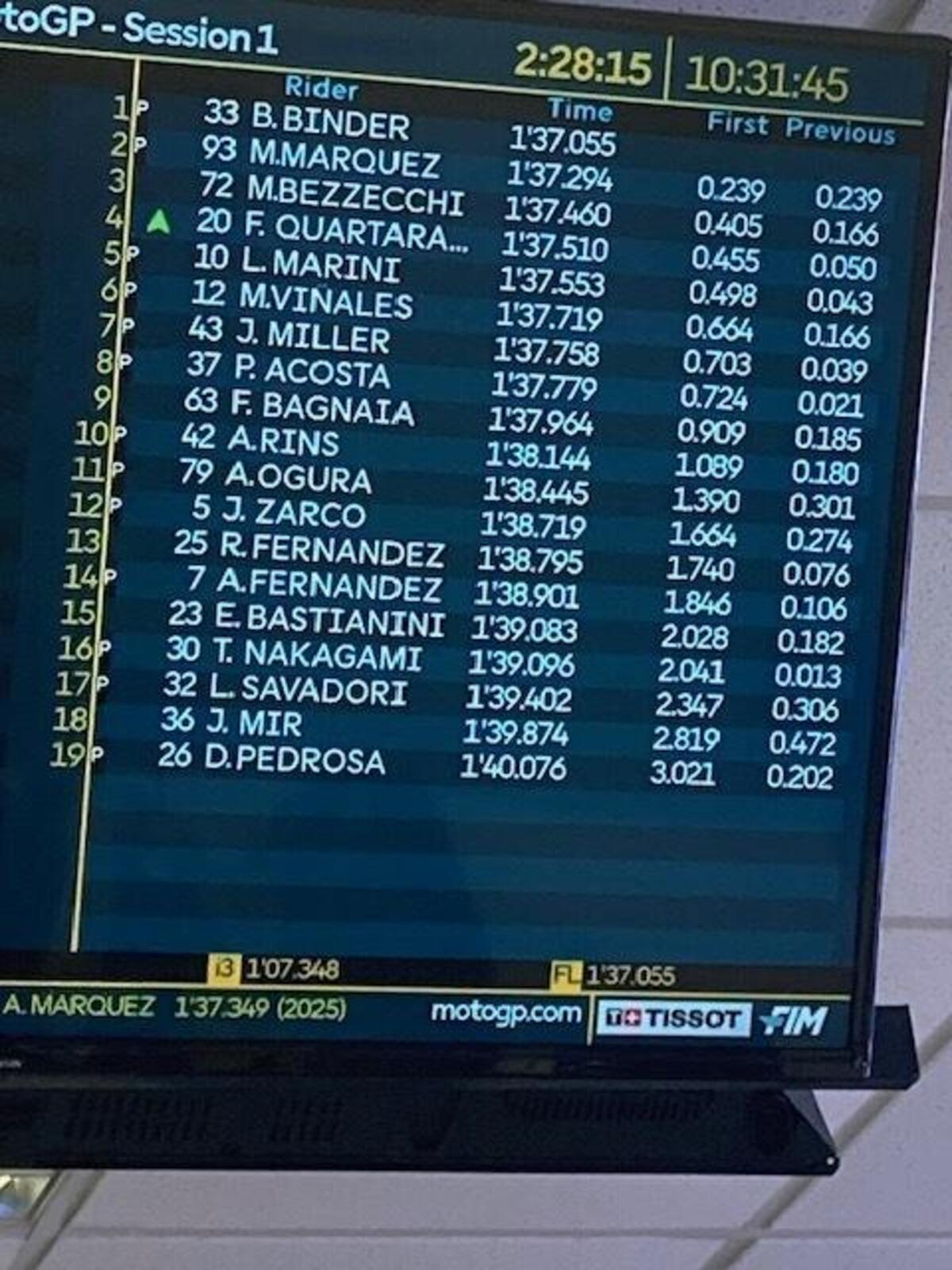 E’ iniziata la giornata di test. Si va avanti fino alle 13, poi 13.05 13.15 prove di partenza, 13.20-18.00 test, poi altri 10 minuti di prove di partenza. In pista già Bezzecchi, Binder e Bagnaia.