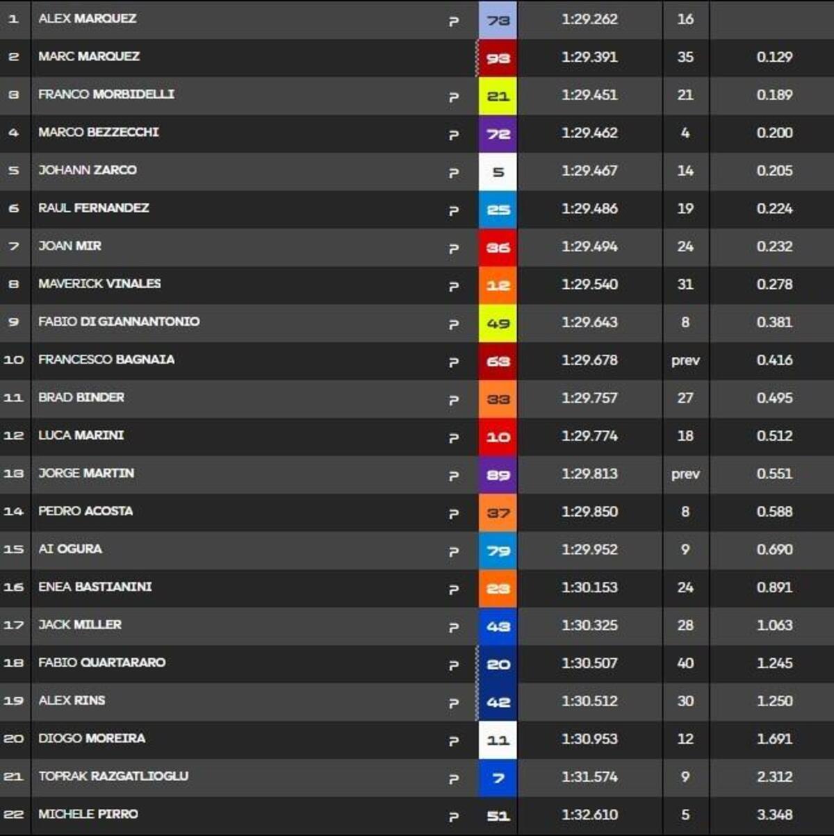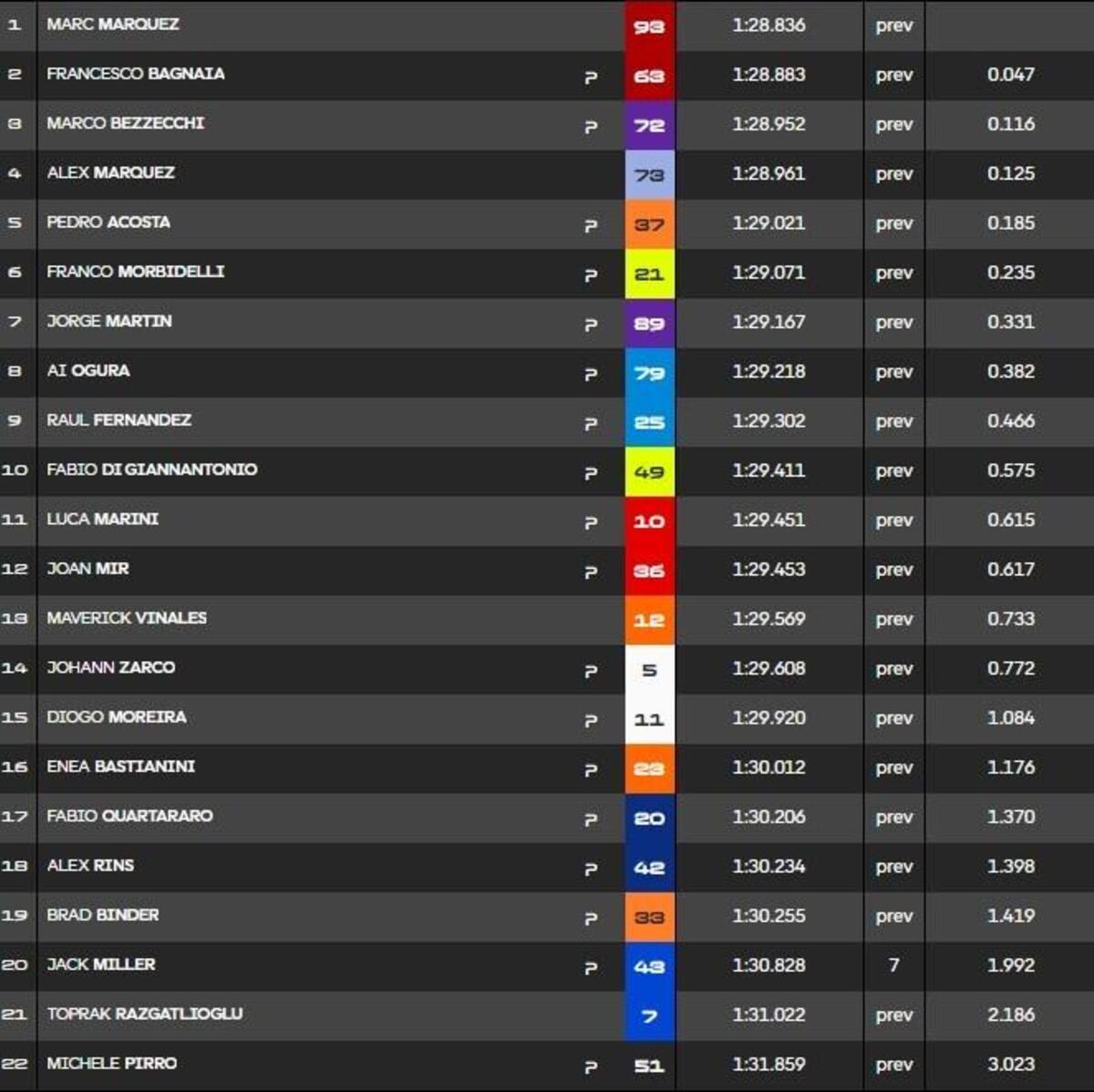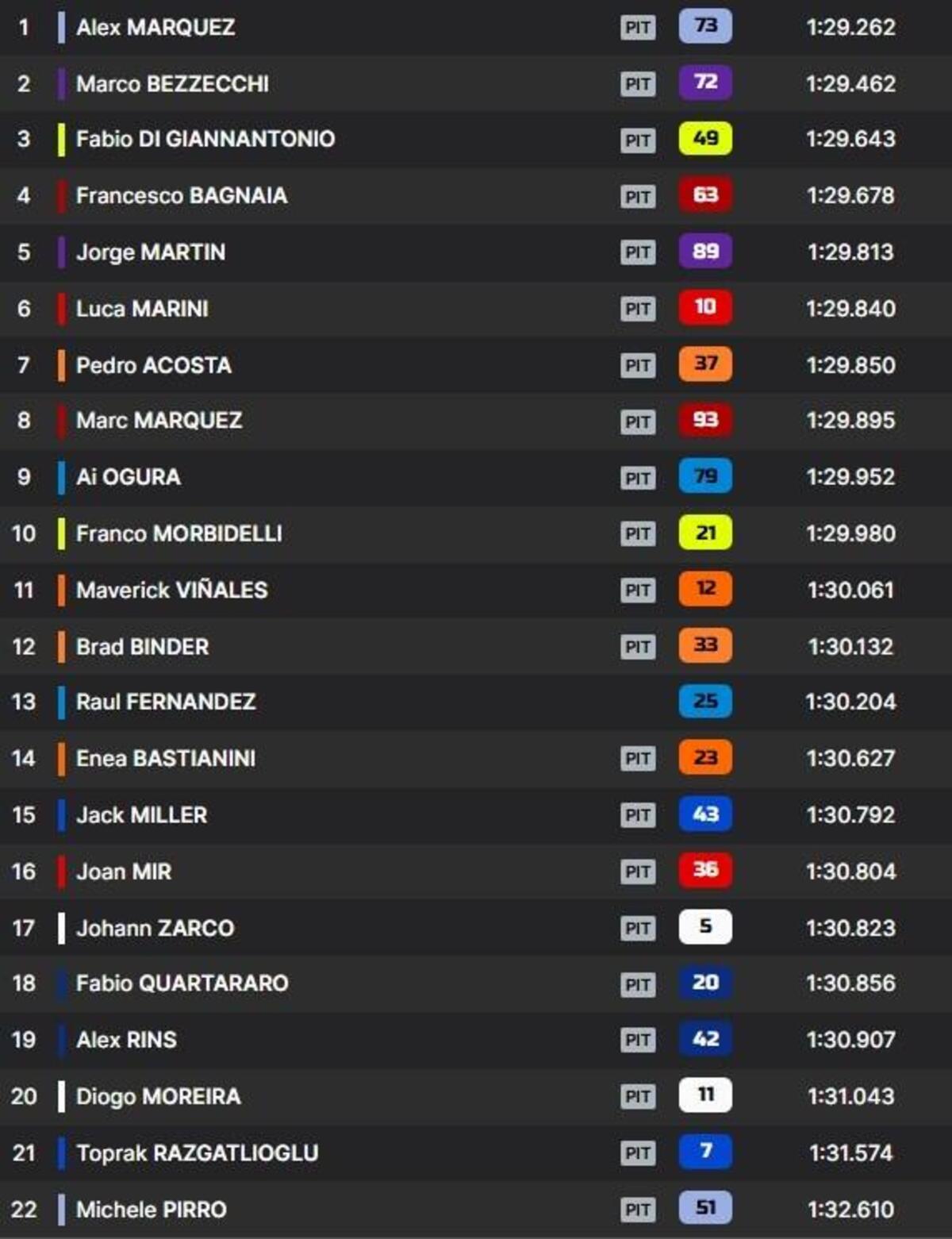 in 1'29.678, seguito da Jorge Martin che, al ritorno in sella, si piazza in