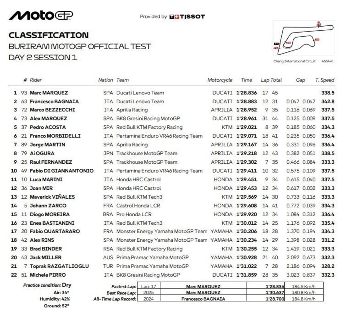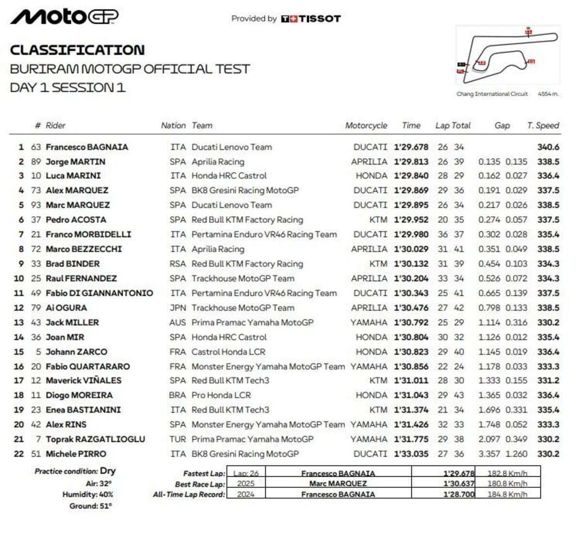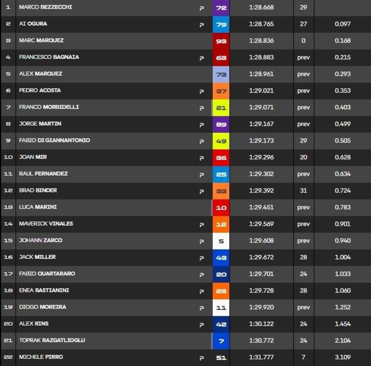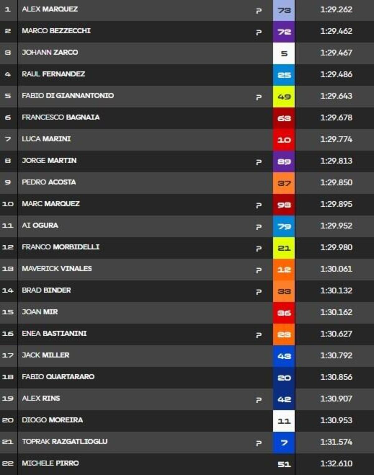 in 1'29.678, seguito da Jorge Martin che, al ritorno in sella, si piazza in