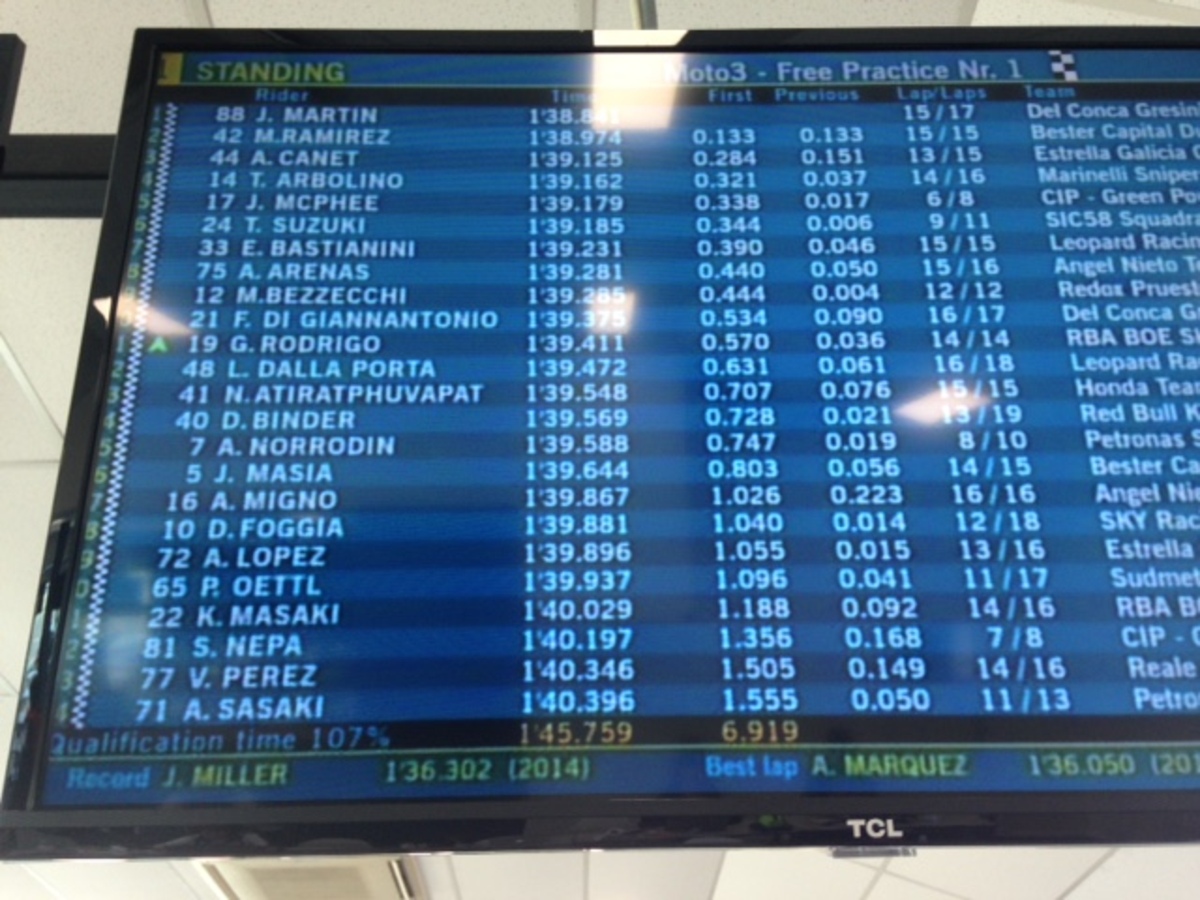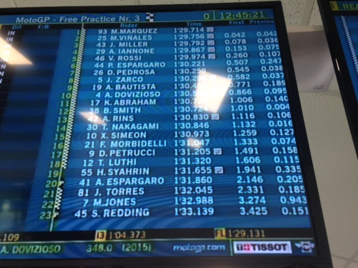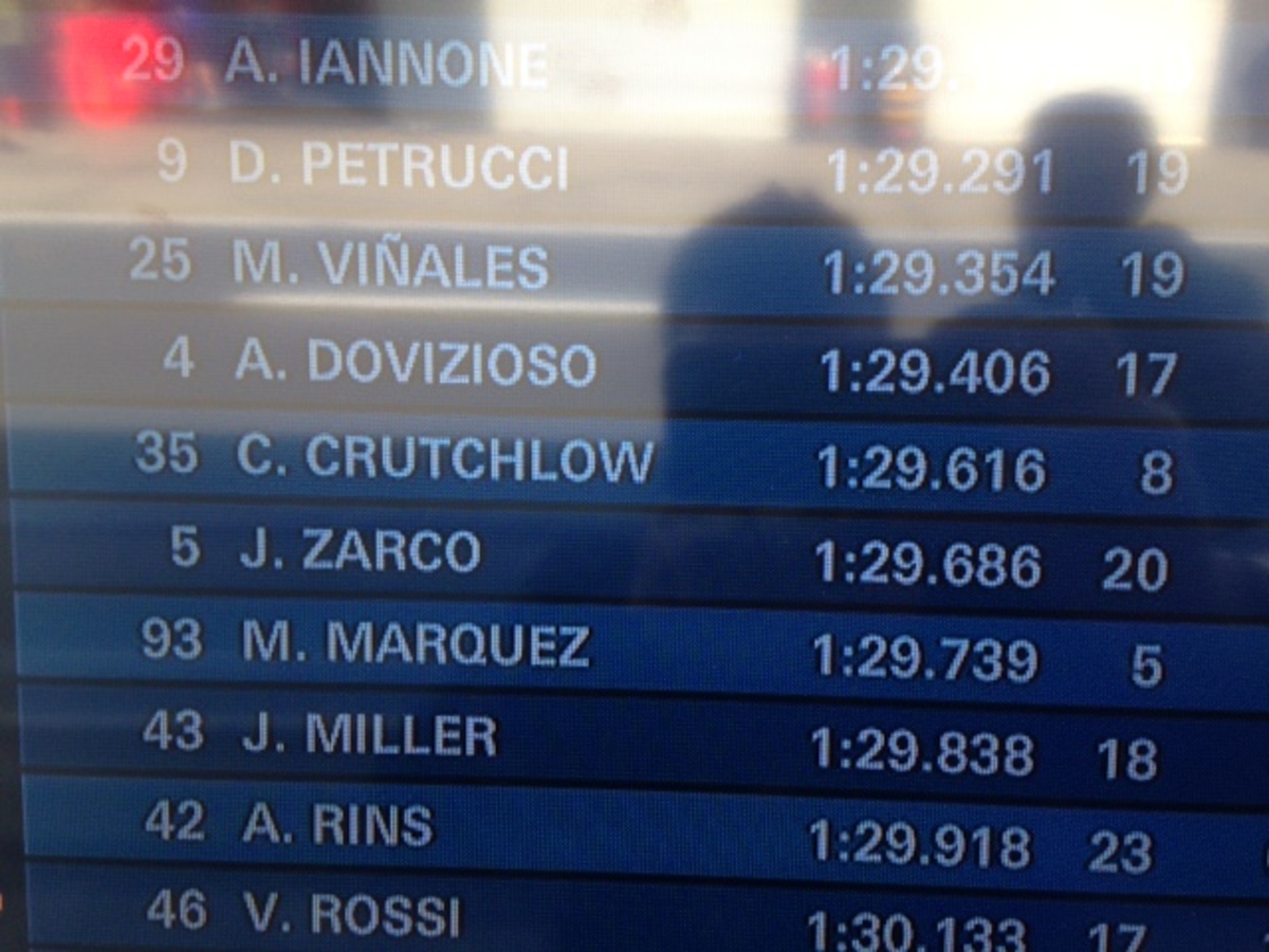 Andrea Iannone chiude al comando, davanti a Danilo Petrucci e Maverick Vinales. Quarto Andrea Dovizioso, quinto Cal Crutchlow (trasportato al centro medico per una fortissima botta a un piede), settimo Marc Marquez, decimo Valentino Rossi, 17esimo Franco Morbidelli.