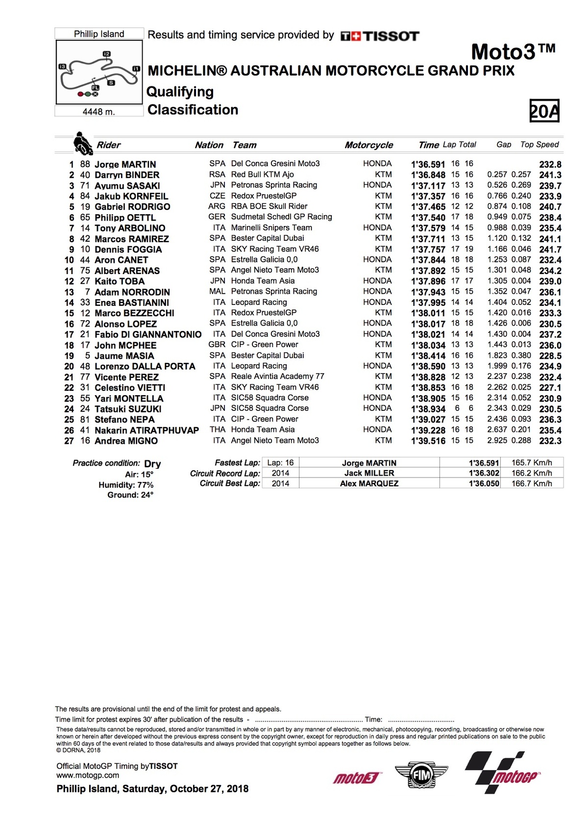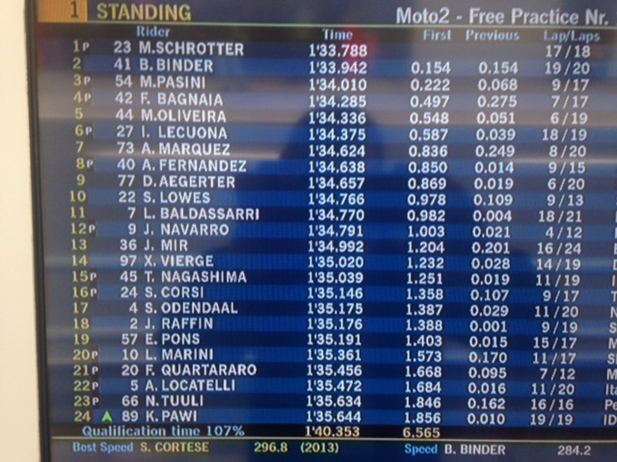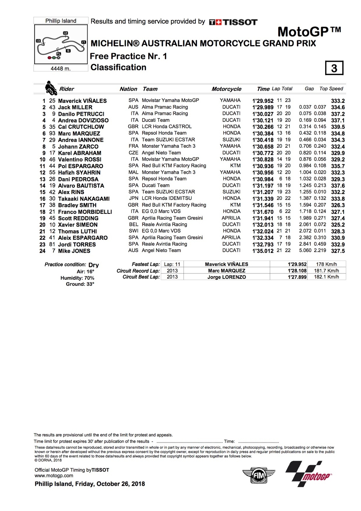 Andrea Iannone chiude al comando, davanti a Danilo Petrucci e Maverick Vinales. Quarto Andrea Dovizioso, quinto Cal Crutchlow (trasportato al centro medico per una fortissima botta a un piede), settimo Marc Marquez, decimo Valentino Rossi, 17esimo Franco Morbidelli.
