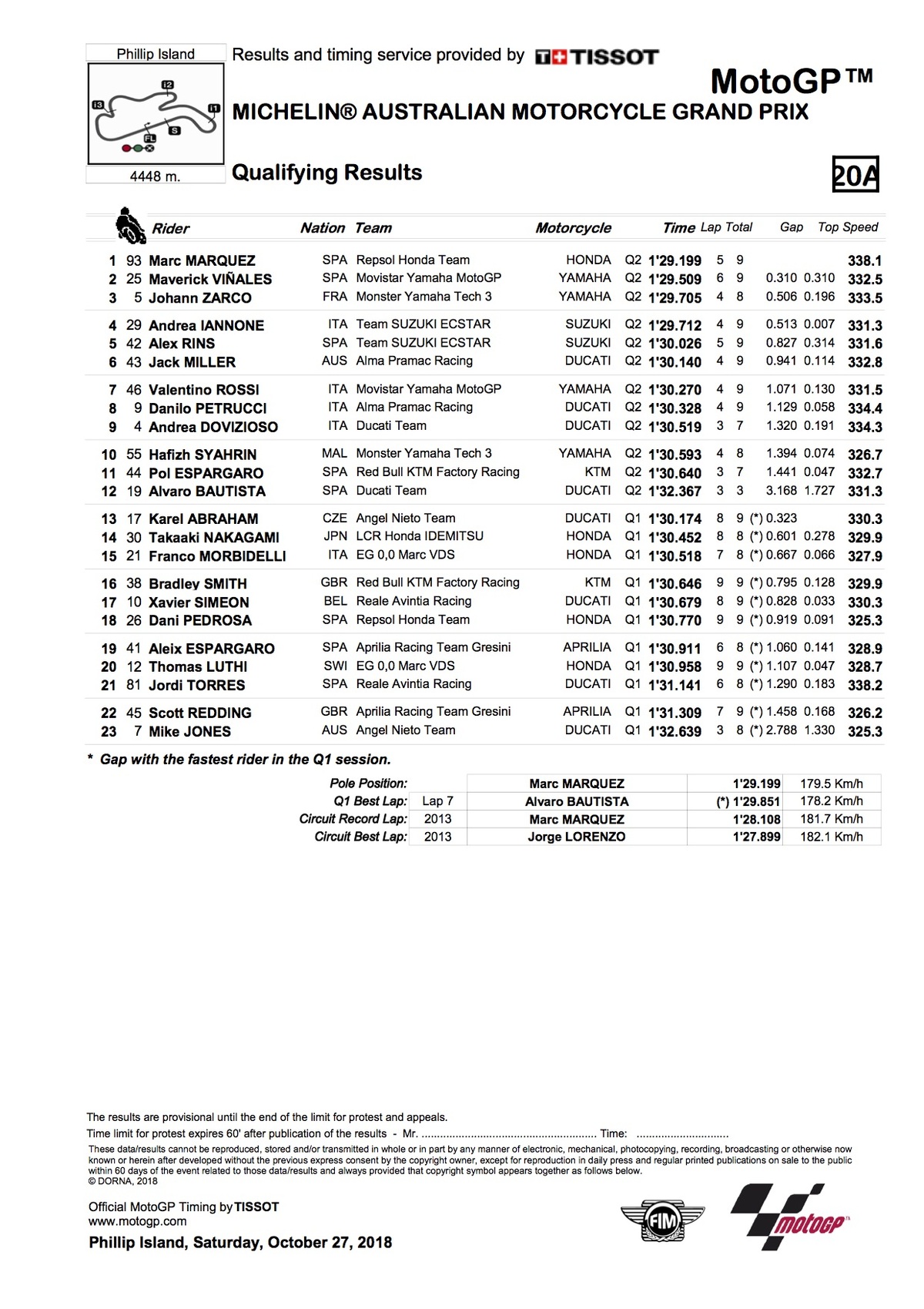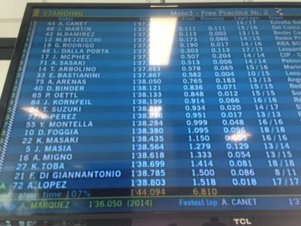 Per la Honda è stata invece una giornata un po’ difficile: sono caduti tutti i piloti “ufficiali”, con Marquez e Pedrosa a terra, senza conseguenze, nelle FP1. Marquez ha chiuso settimo: la posizione non è tanto preoccupante, perché Marc non dovrebbe aver cambiato gomma nel finale, ma lo è di più l’instabilità della sua RC213V, in difficoltà in inserimento e visibilmente “ballerina”. Nei dieci anche Alex Rins con la seconda Suzuki, solo 16esimo Aleix Espargaro con l’Aprilia, che ha anche provato una soluzione “mista” con alcuni particolari ciclistici del 2017 assemblati con parti del 2018.