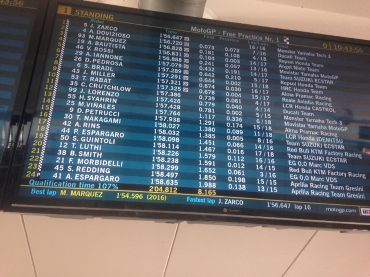 T1 Dovizioso 29”604, T2 Zarco 35”215, T3 Rossi 32”115, T4 Zarco 19”440