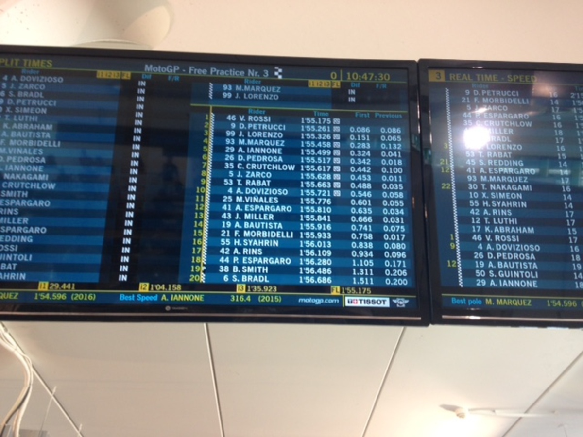 Dovizioso 314 (312,5 la media delle 5 migliori velocità); Bradl 311,8 (308,9); Petrucci 311,5 (308,8); Crutchlow 310,8 (309,4); Rabat 310,7 (309); P.Espargaro 309,6 (308,3); Vinales 308,3 (307,3); Marquez 307,5 (307,3); Lorenzo 307,2 (306,7); Rossi 306,9 (305,8).