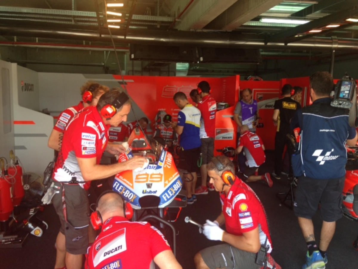 Lorenzo di nuovo ai box, spiega ai tecnici le criticità emerse. Sembra comunque tranquillo