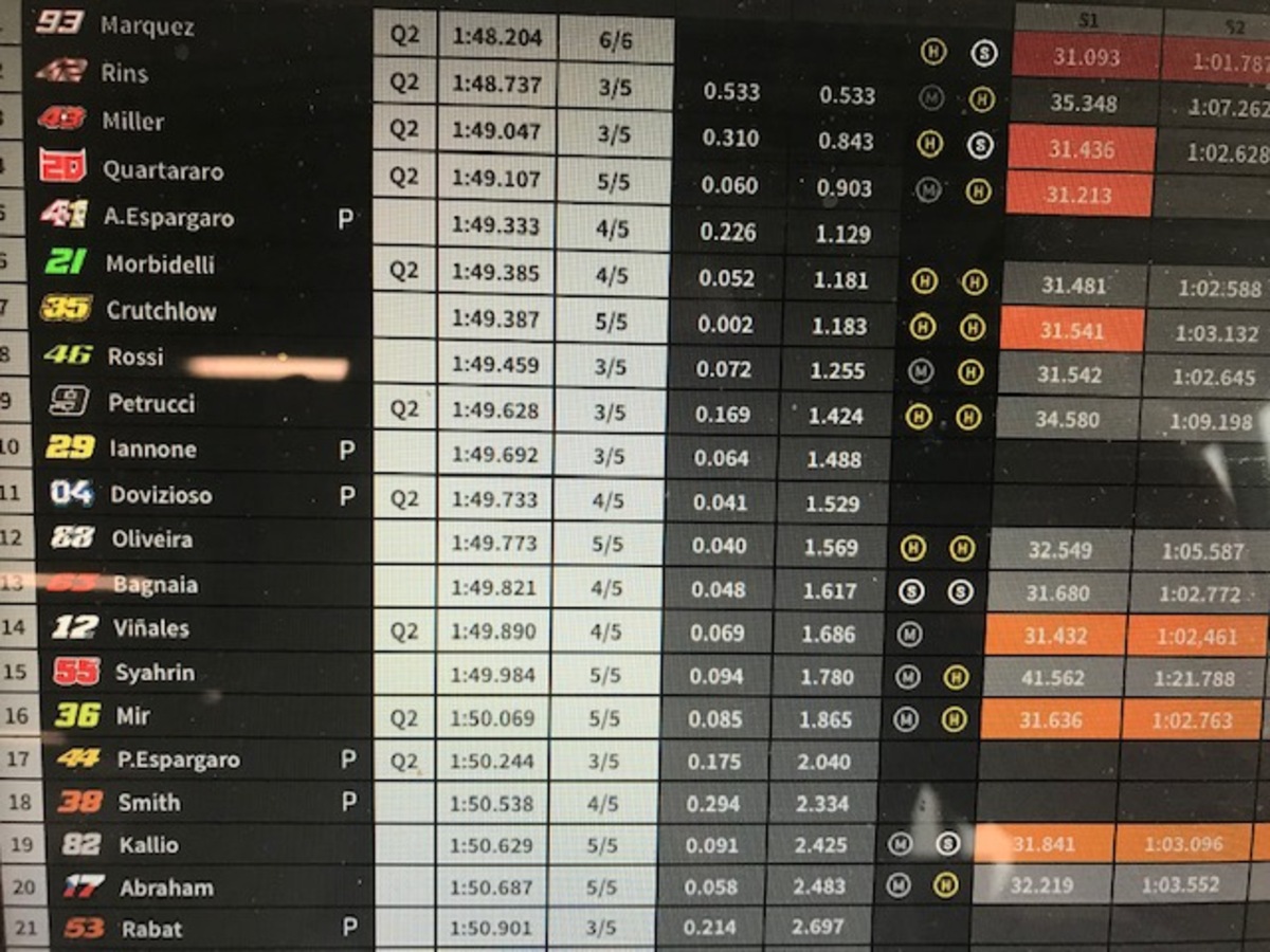 Soffice posteriore per marquez e le ducati, dura posteriore per le Yamaha. Mir dura posteriore, Rins dura posteriore, all’anteriore tutti la media (tranne Kallio con la dura)=