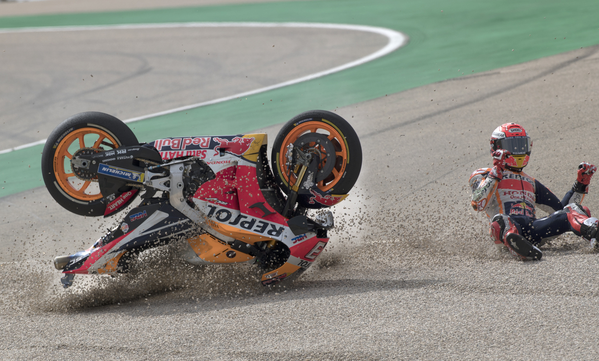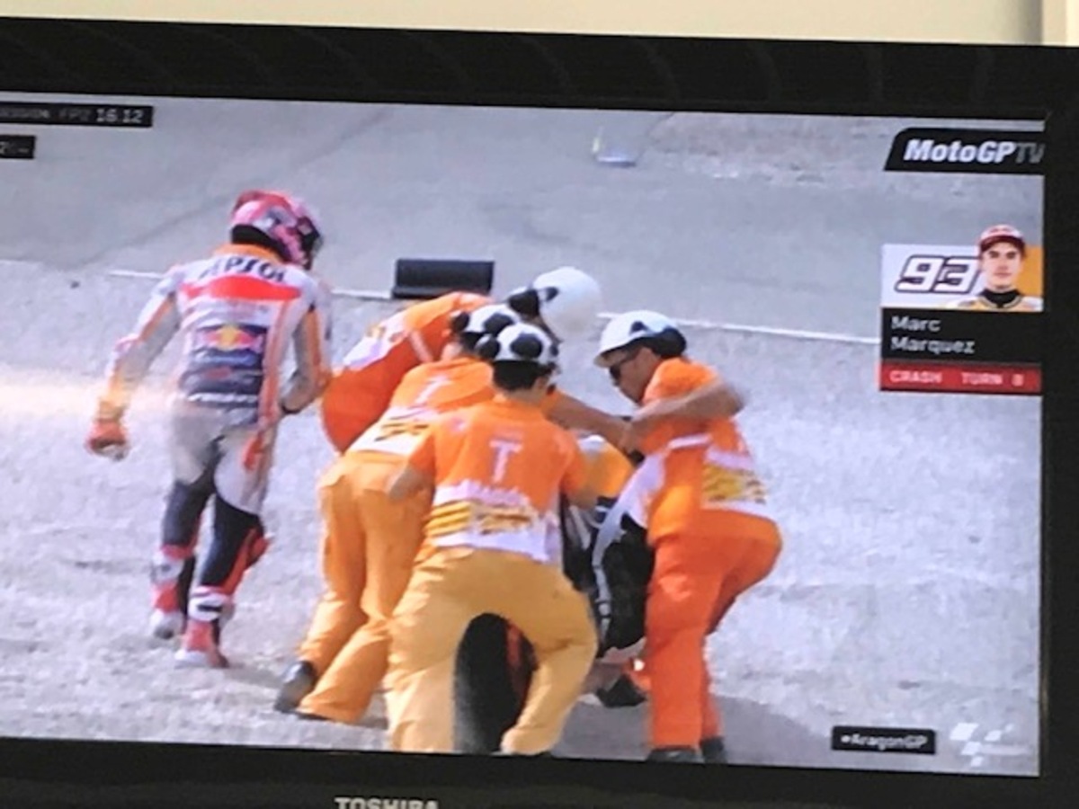 Dopo la caduta, marquez torna ai box e riparte subito con la seconda moto. Non si è nemmeno pulito la tuta…