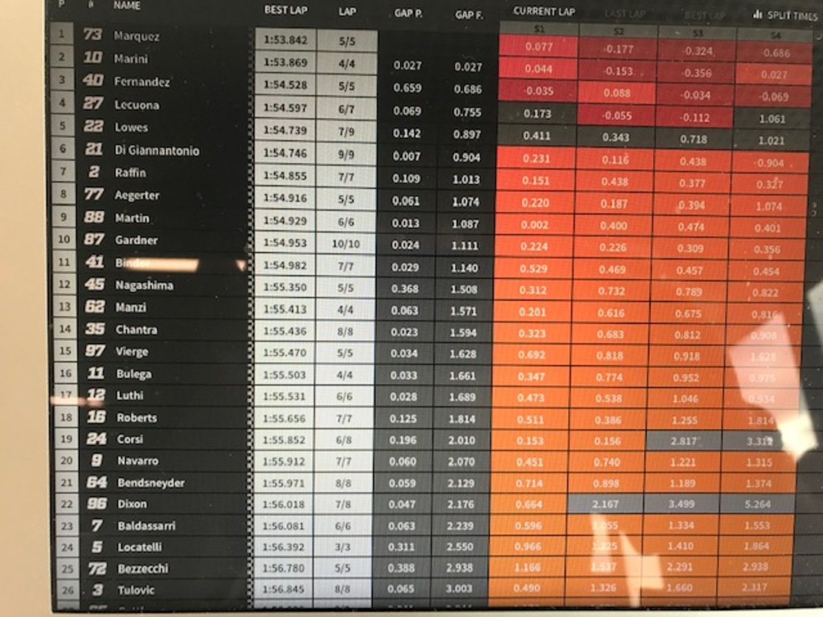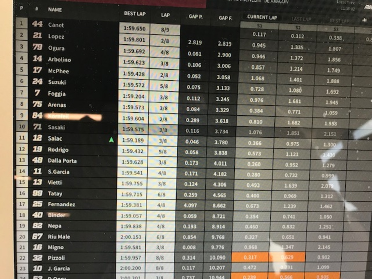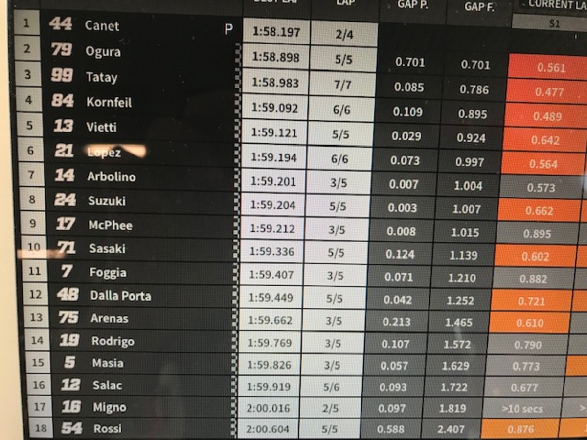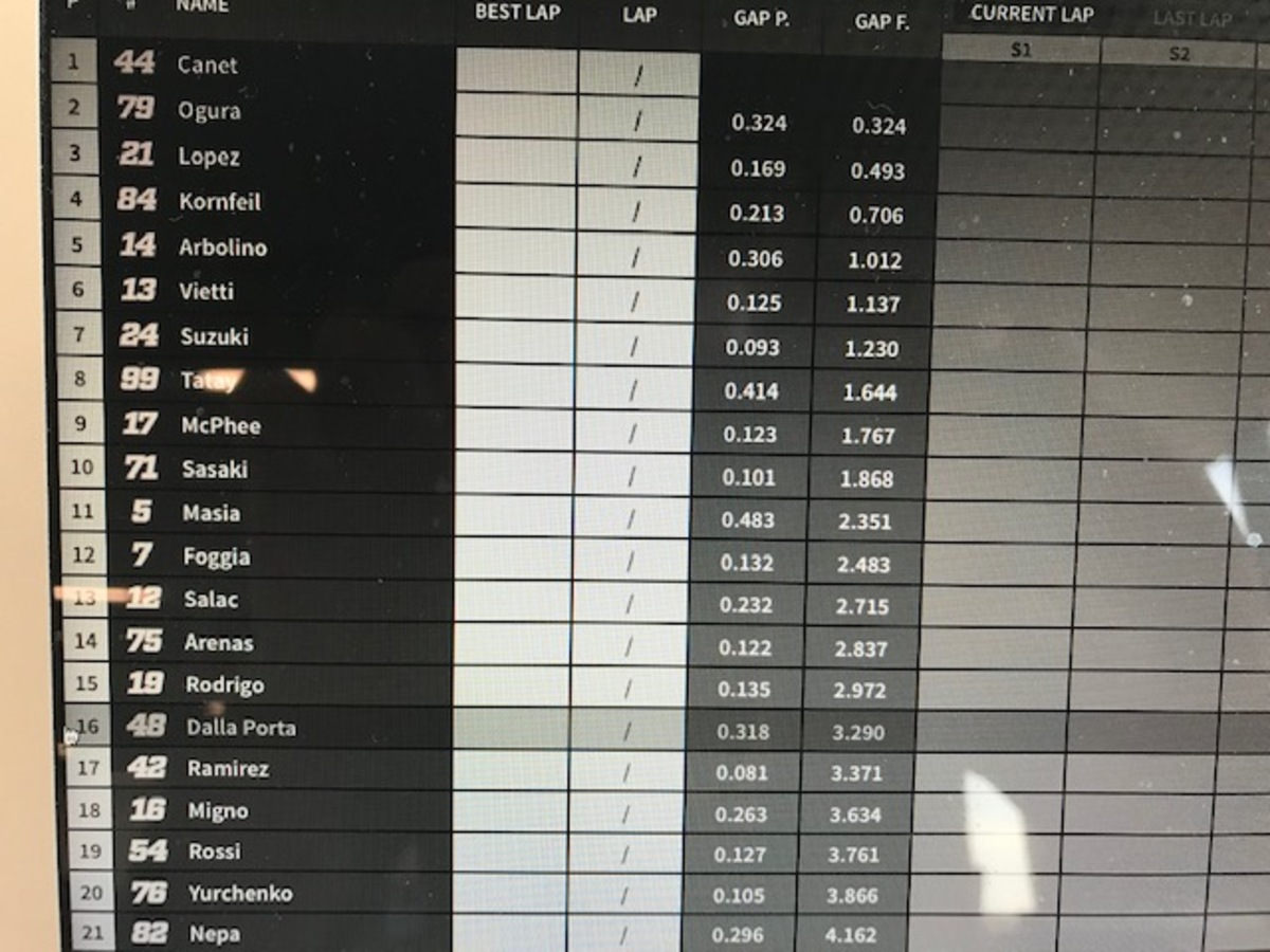 Canet, poi un gruppo di 10 piloti a 3”7, poi un altro 1”2 per trovare dalla porta