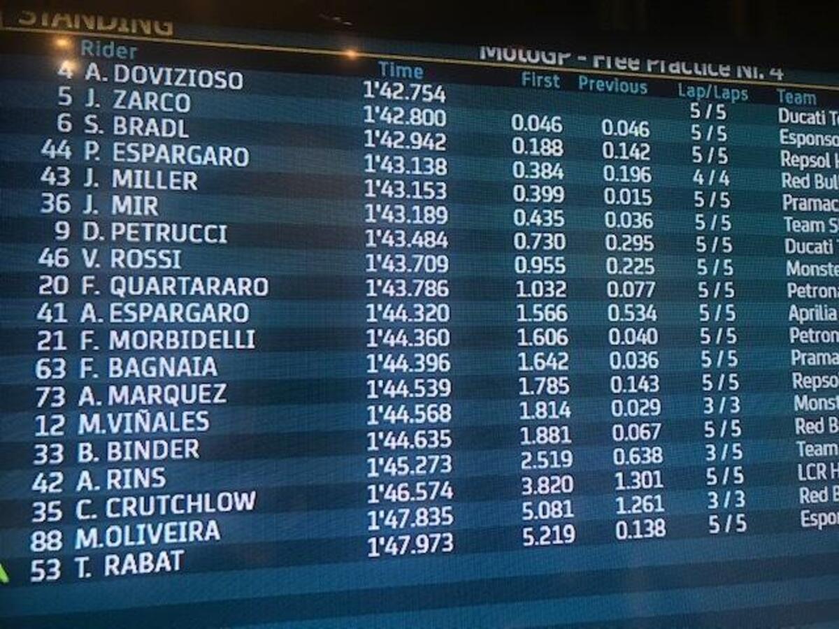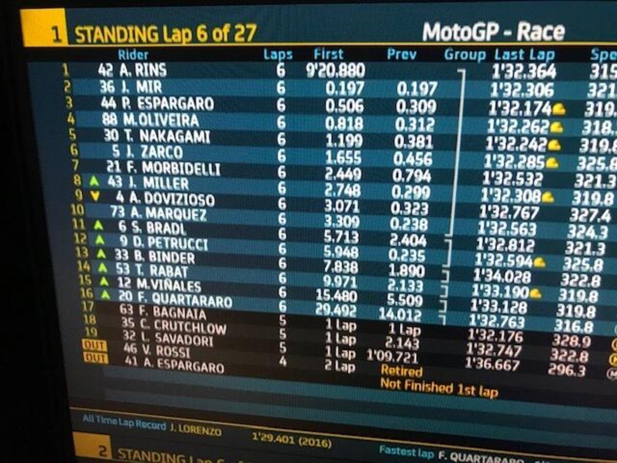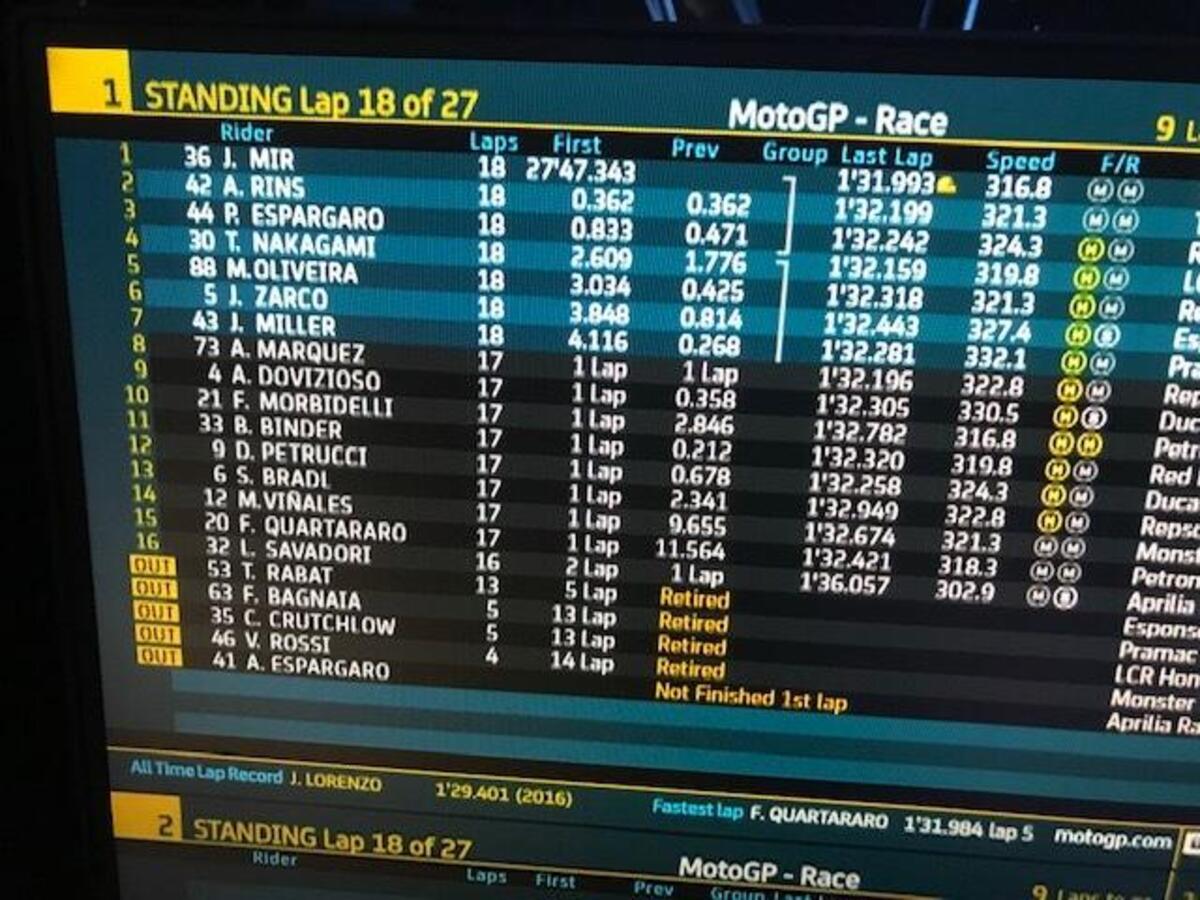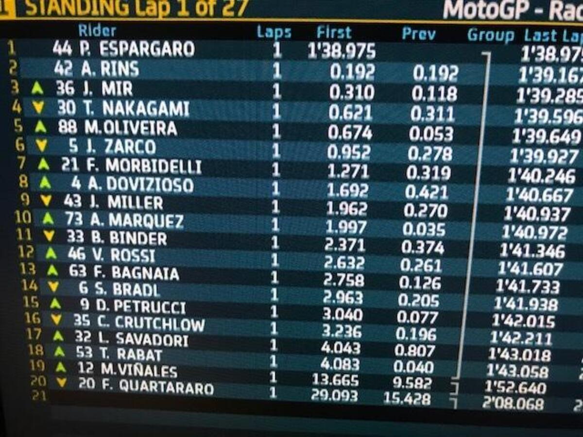 Fabio Quartararo: “Non avevo un gran feeling, ma avevamo fatto dei cambiamenti per la gara. Purtroppo sono caduto subito: Espargaro è caduto davanti a me e ho frenato più forte. Poi ho fatto tanti giri con la moto bassa, bloccata, quindi la moto era molto carica dietro e scarica davanti. Peccato, oggi poteva essere comunque difficile, ma sarebbe andata meglio. Il campionato non è chiuso, ma quasi, non si può fare niente.
