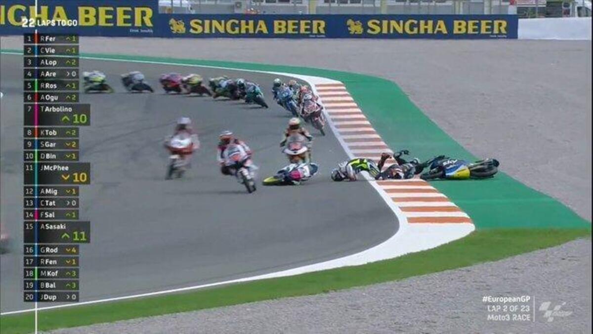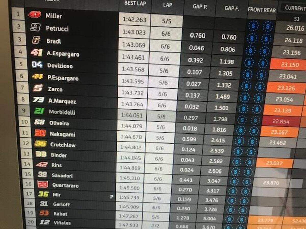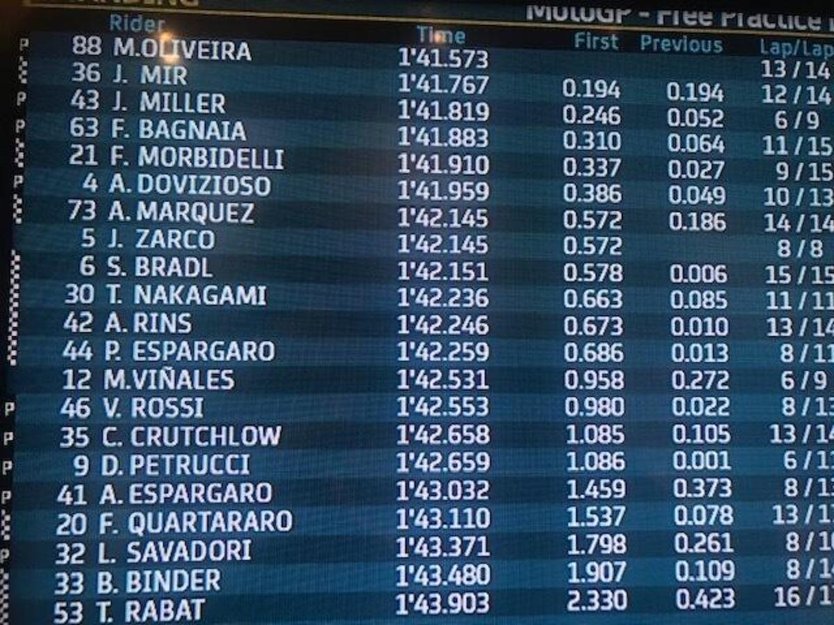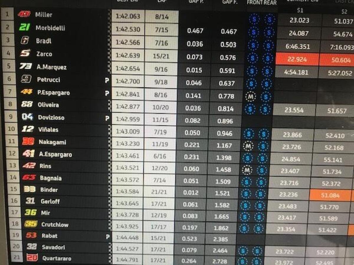Fabio Quartararo: “Non avevo un gran feeling, ma avevamo fatto dei cambiamenti per la gara. Purtroppo sono caduto subito: Espargaro è caduto davanti a me e ho frenato più forte. Poi ho fatto tanti giri con la moto bassa, bloccata, quindi la moto era molto carica dietro e scarica davanti. Peccato, oggi poteva essere comunque difficile, ma sarebbe andata meglio. Il campionato non è chiuso, ma quasi, non si può fare niente.