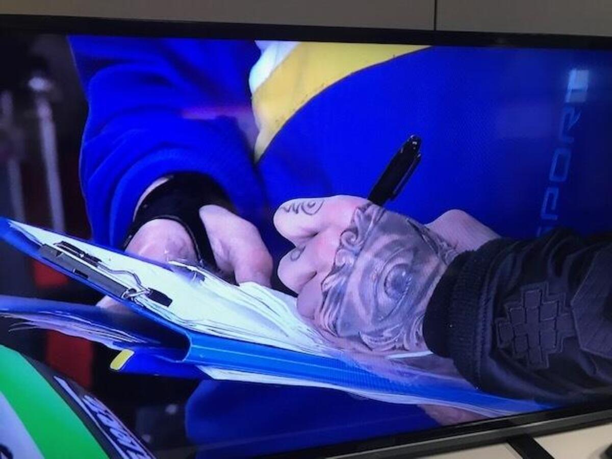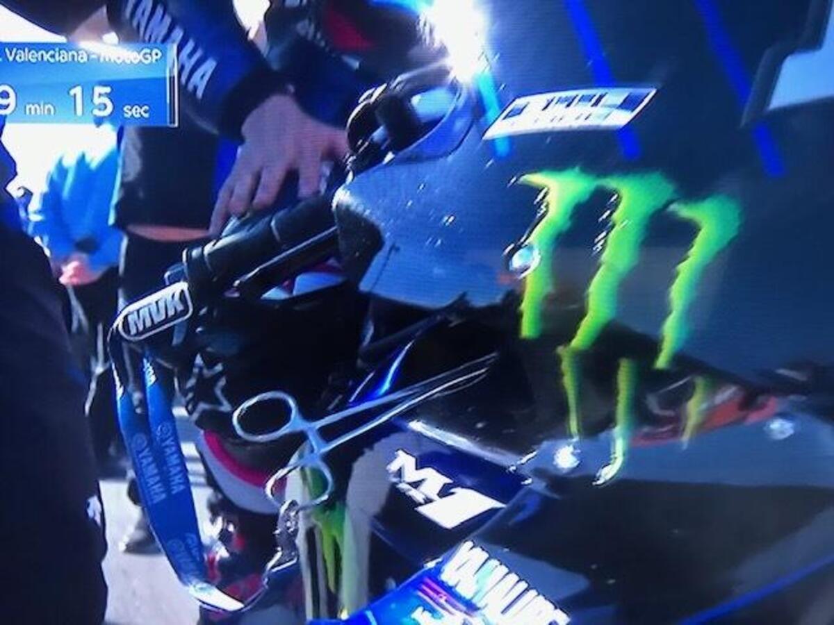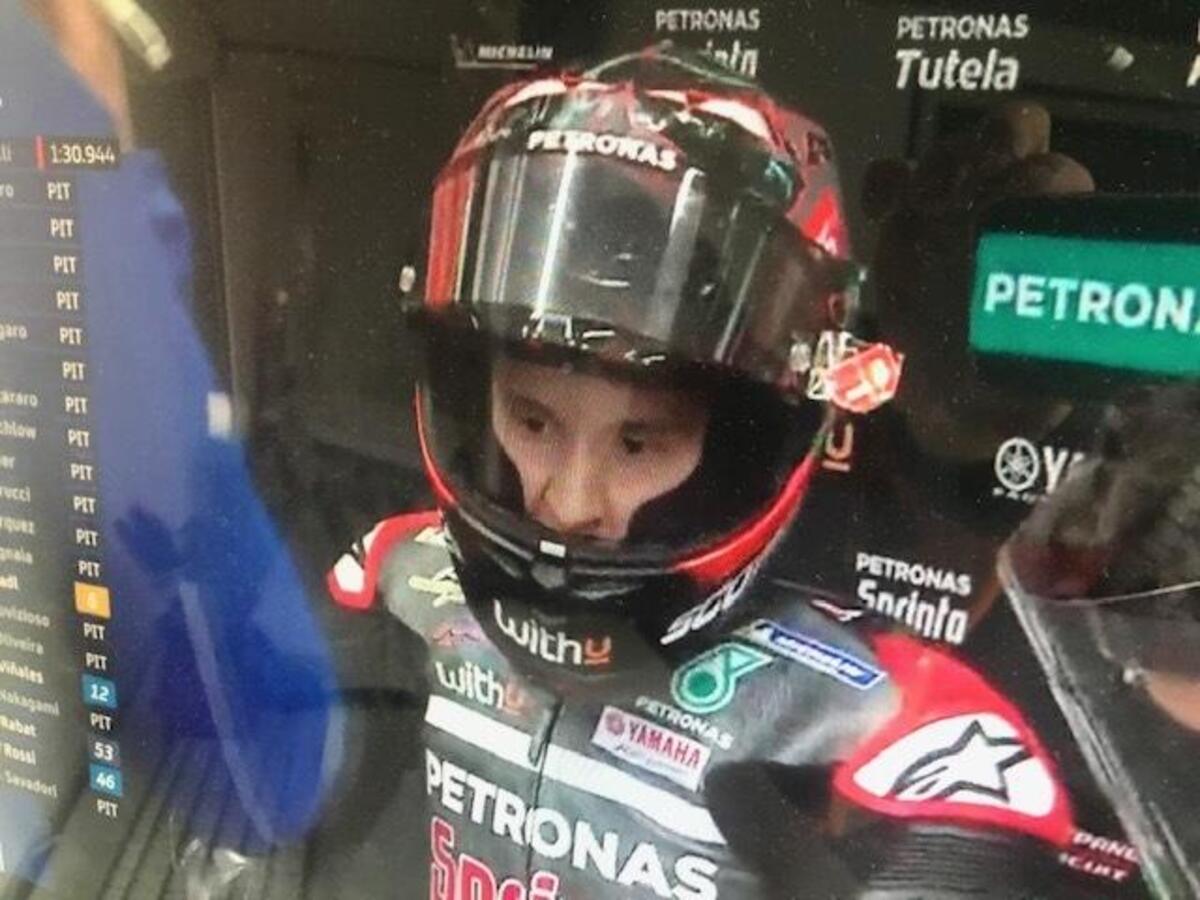 Quartararo ai box mima con le mani grossi movimenti dell’anteriore della sua yamaha