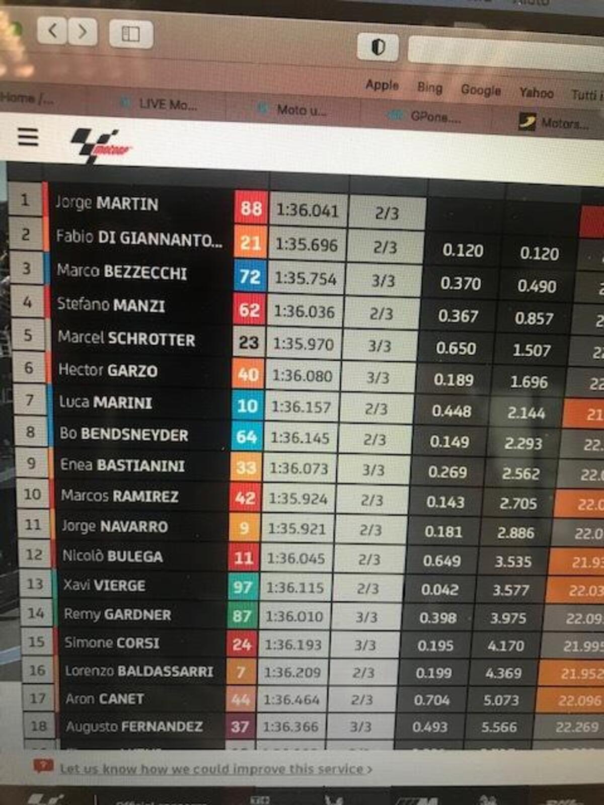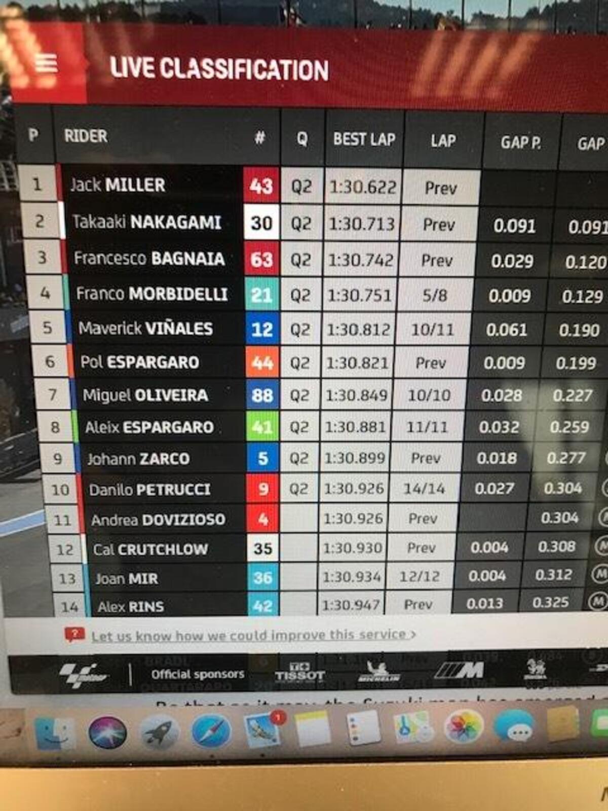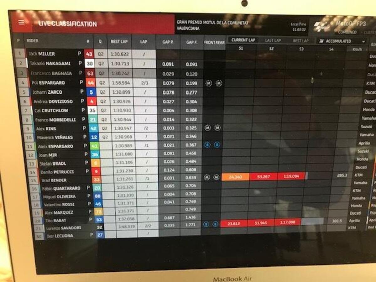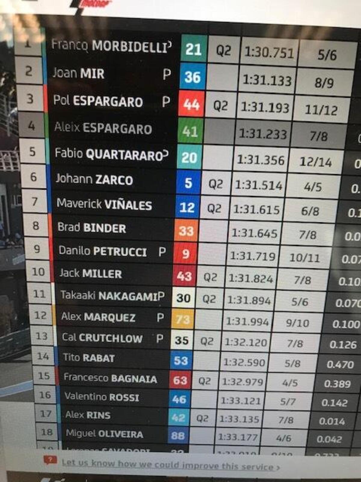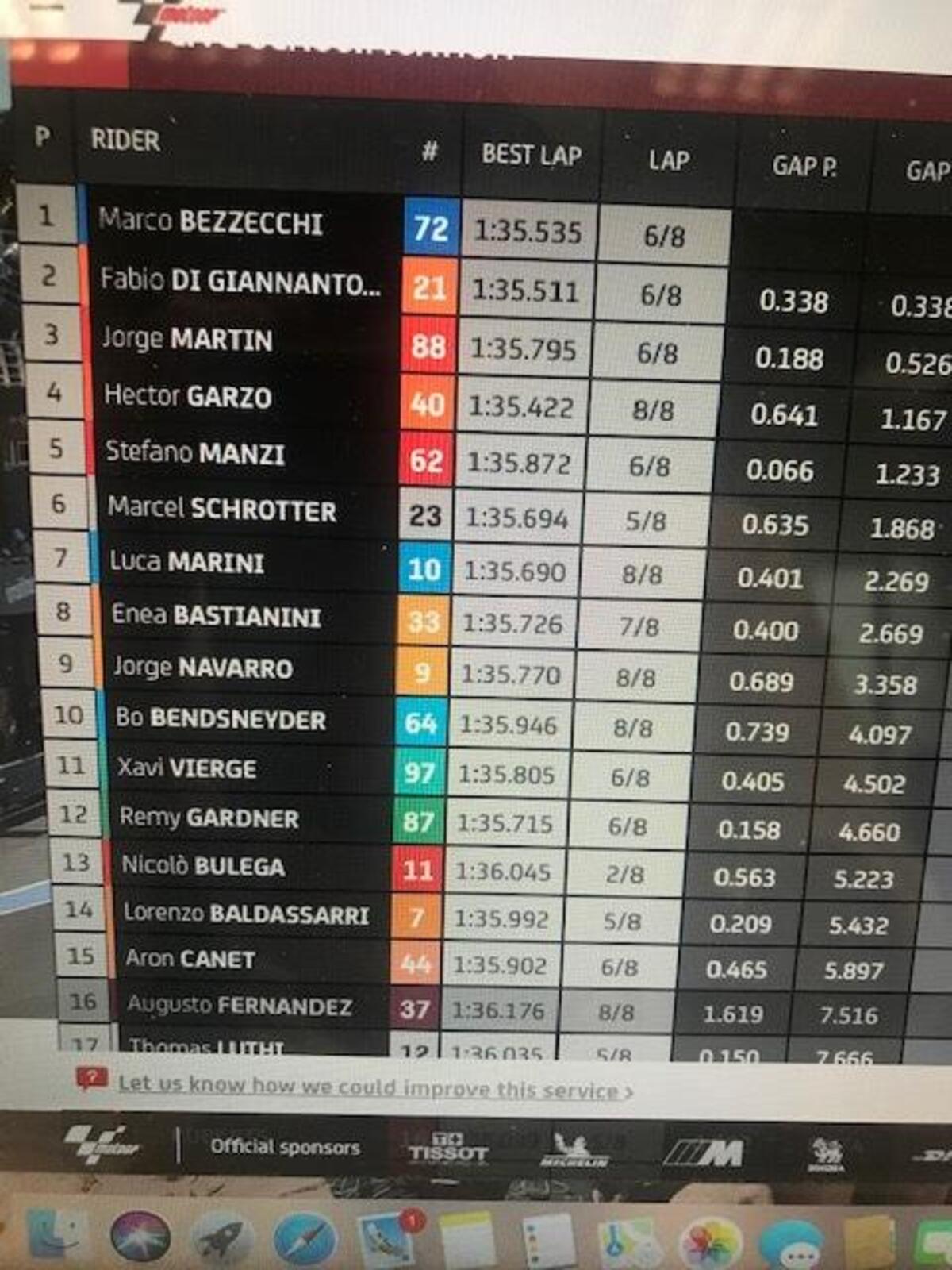 Michelin fa sapere che nei primi commenti, il grip dell’asfalto è migliore rispetto a settimana scorsa. I tempi confermano, già più veloci rispetto a domenica