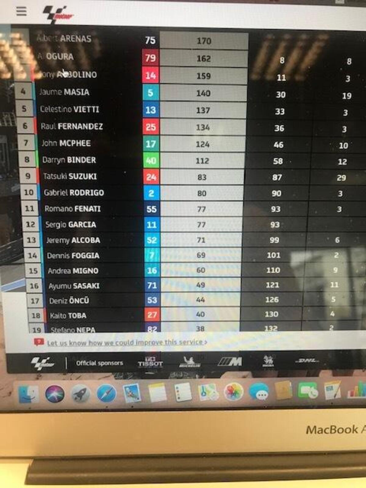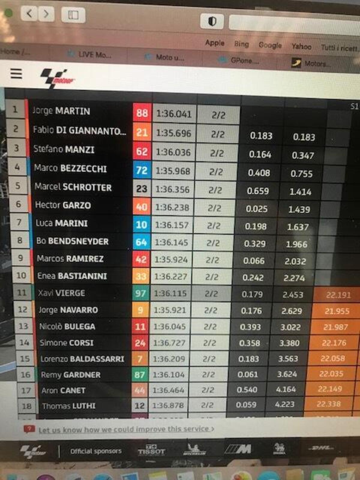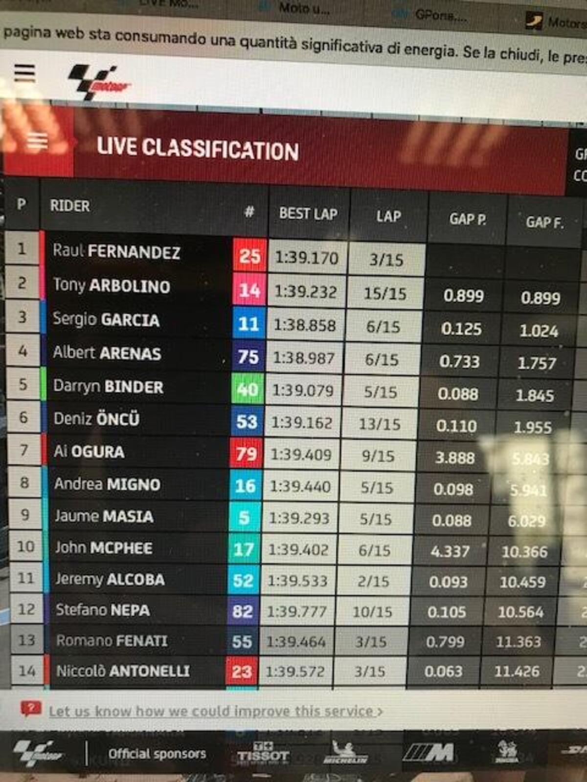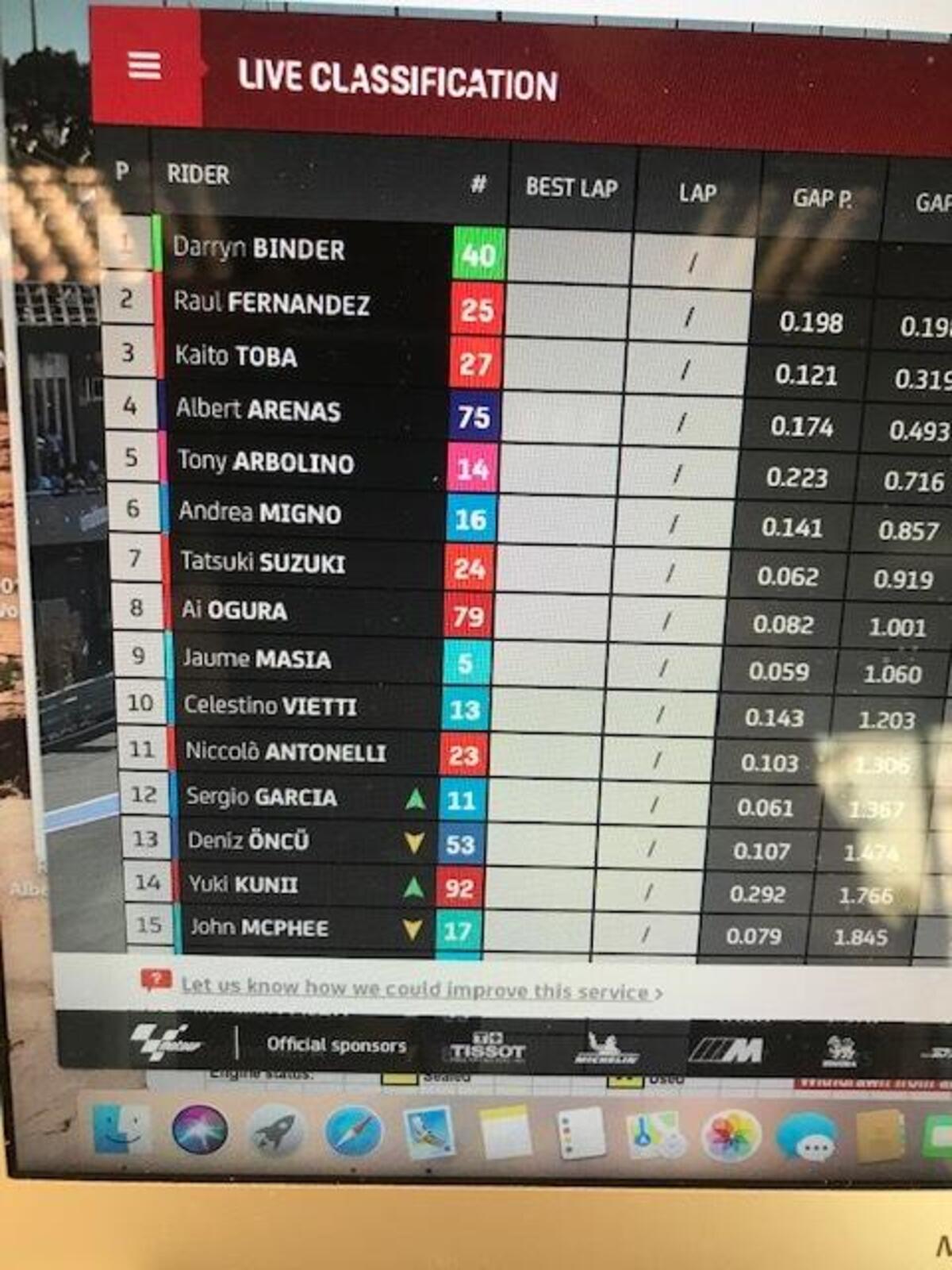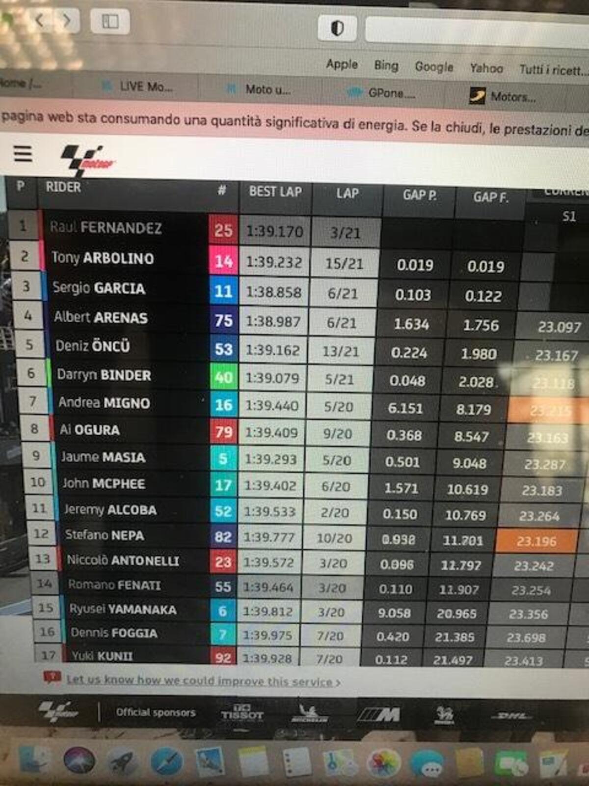 Michelin fa sapere che nei primi commenti, il grip dell’asfalto è migliore rispetto a settimana scorsa. I tempi confermano, già più veloci rispetto a domenica
