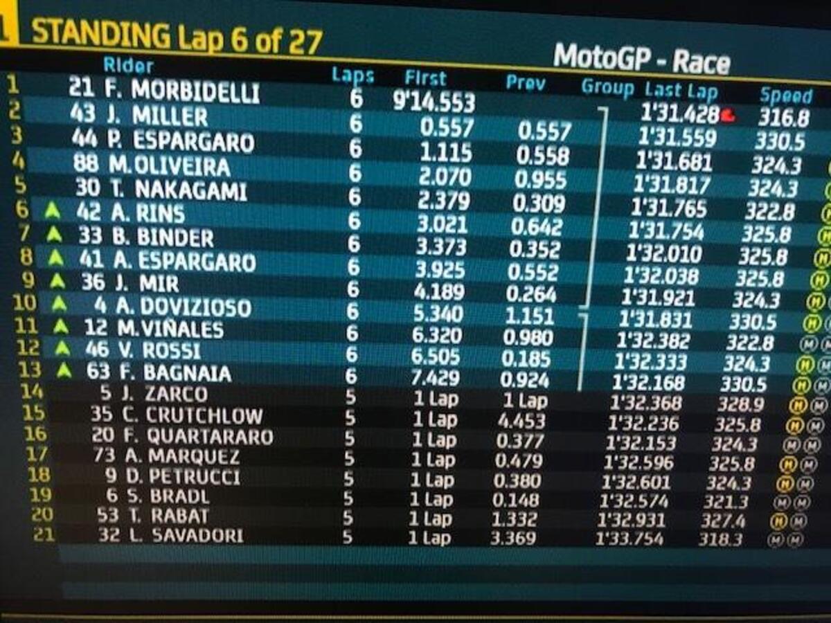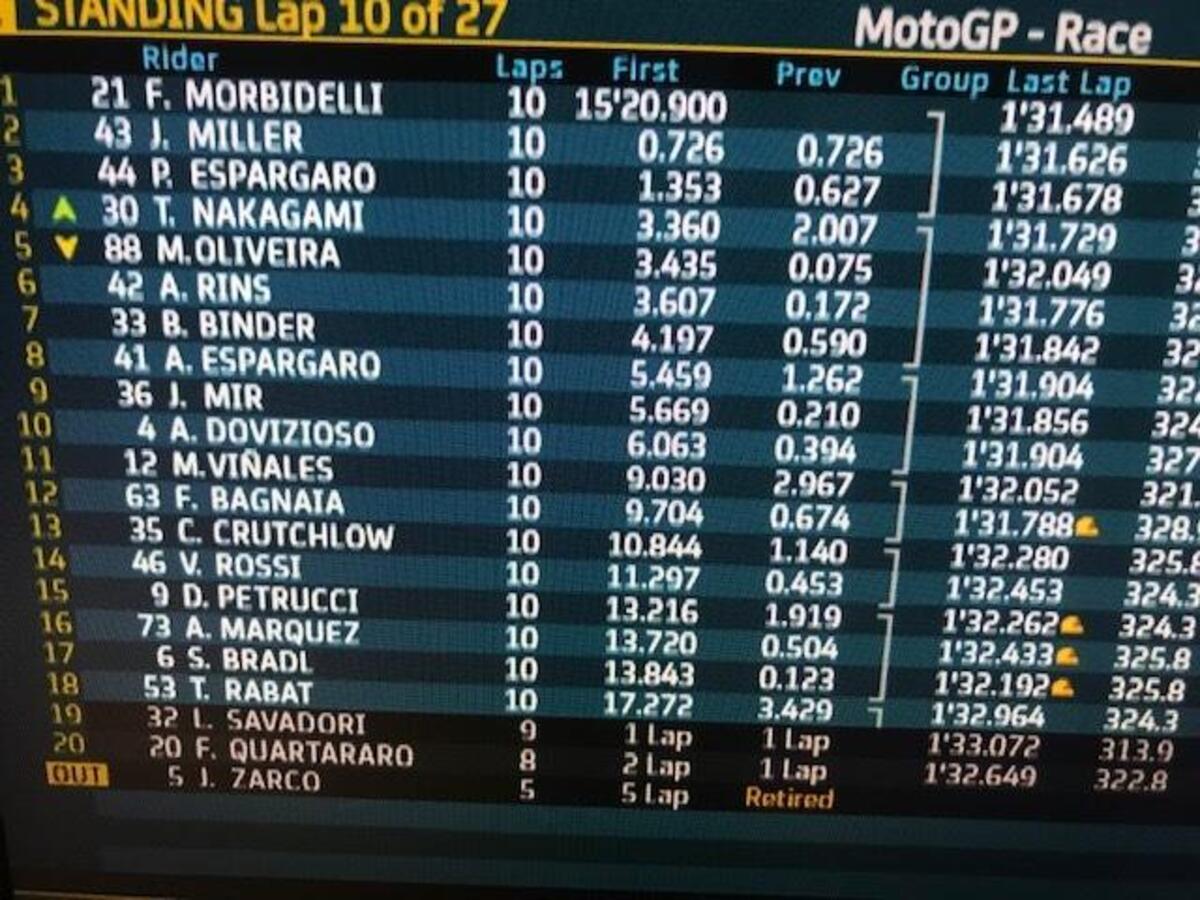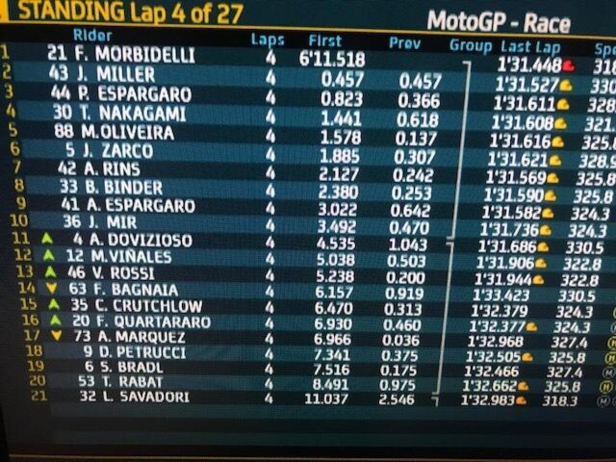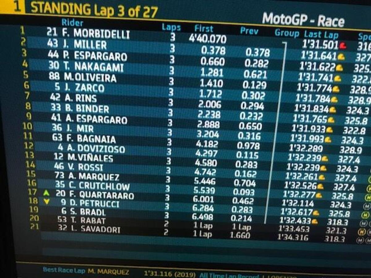 Miller attacca alla uno, va largo, dentro Morbidelli, poi dentro Miller alla 4, Morbidelli alla 5 è di nuovo primo