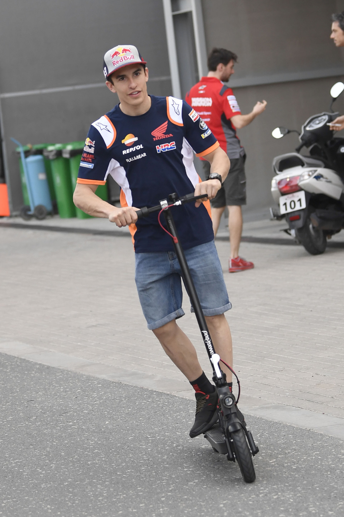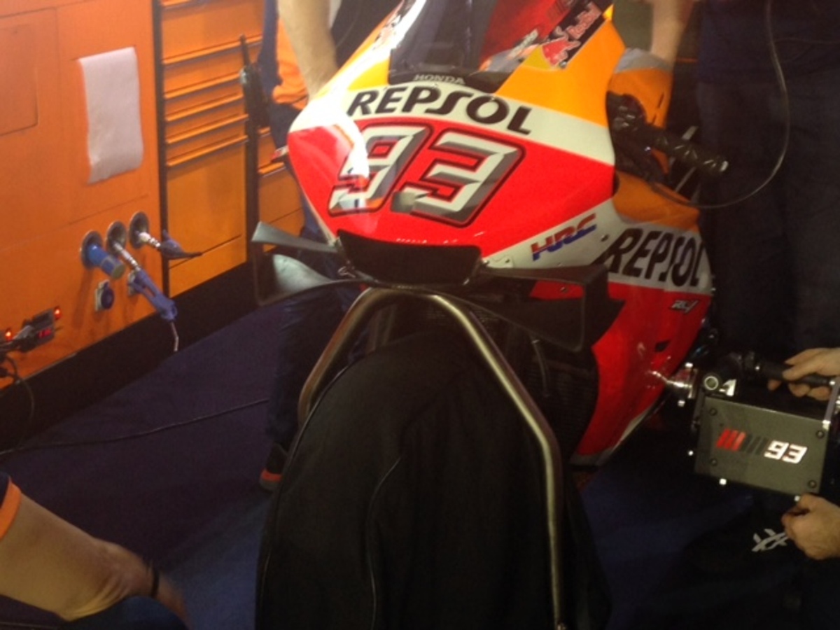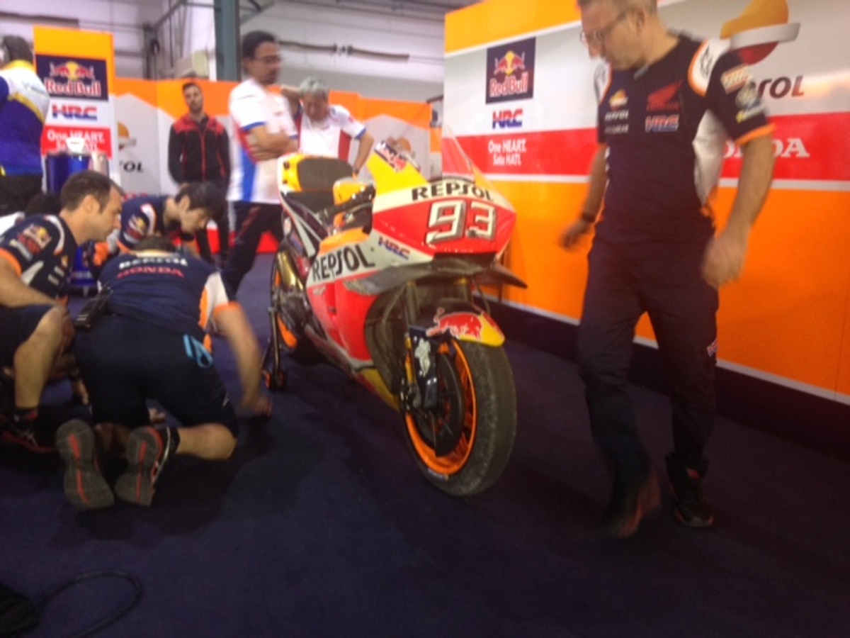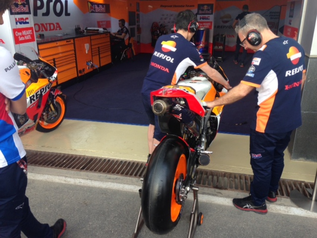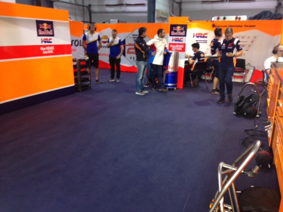 Vengono scaldate anche le Honda di marc marquez, ancora in borghese nel box