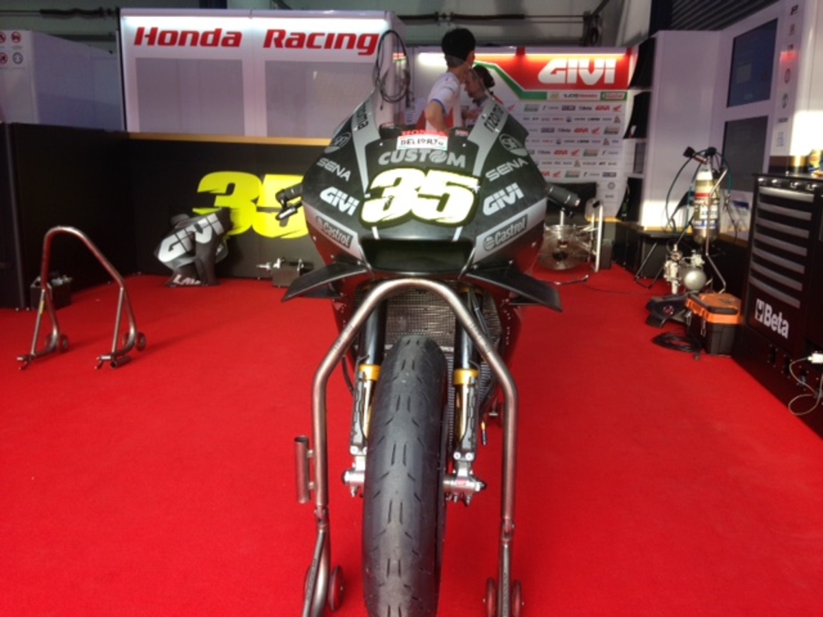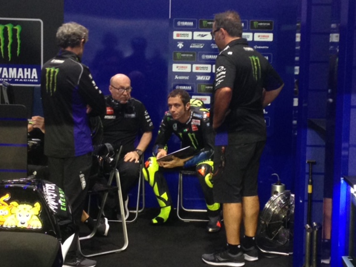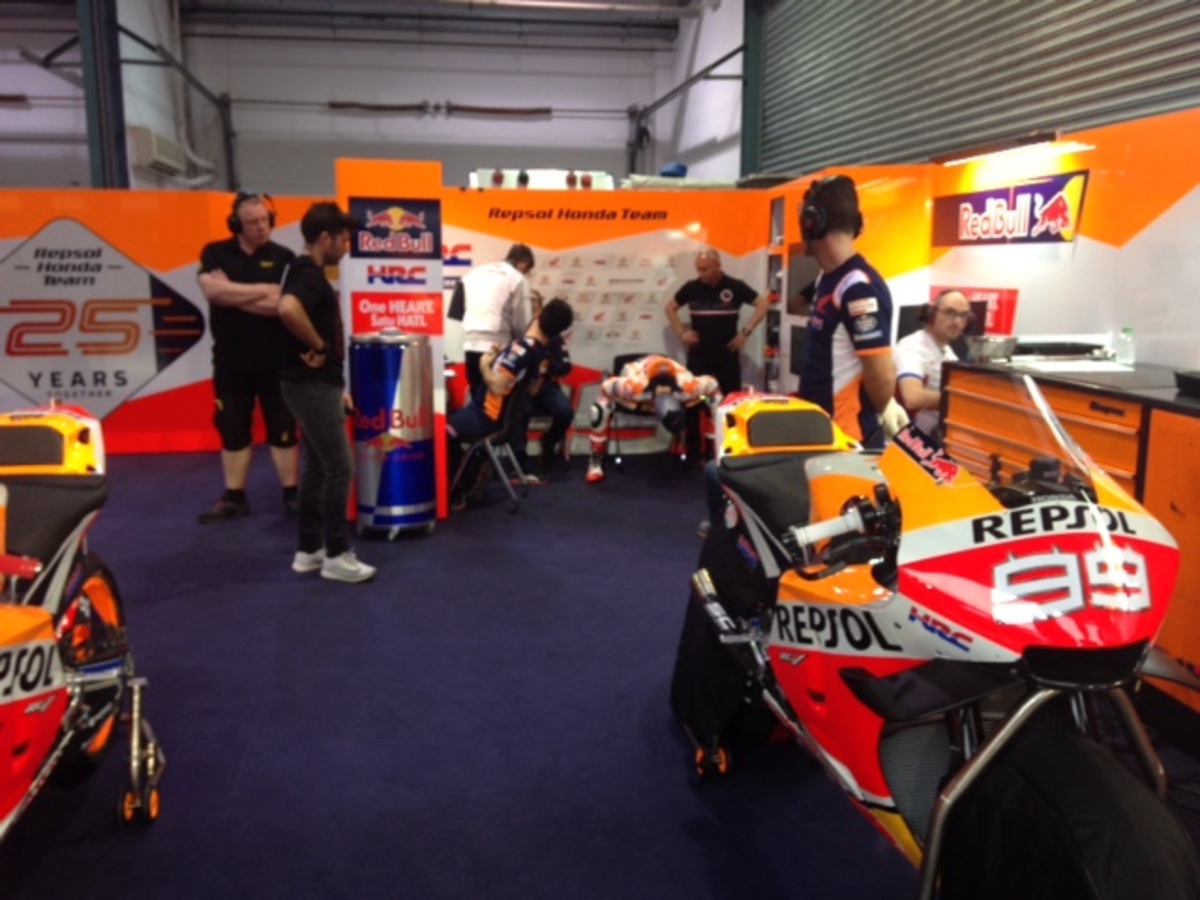Lorenzo dentro al box sta prendendo le misure sulla moto, probabile che fra poco entro in pista. Comincia a fare freschino, da felpa