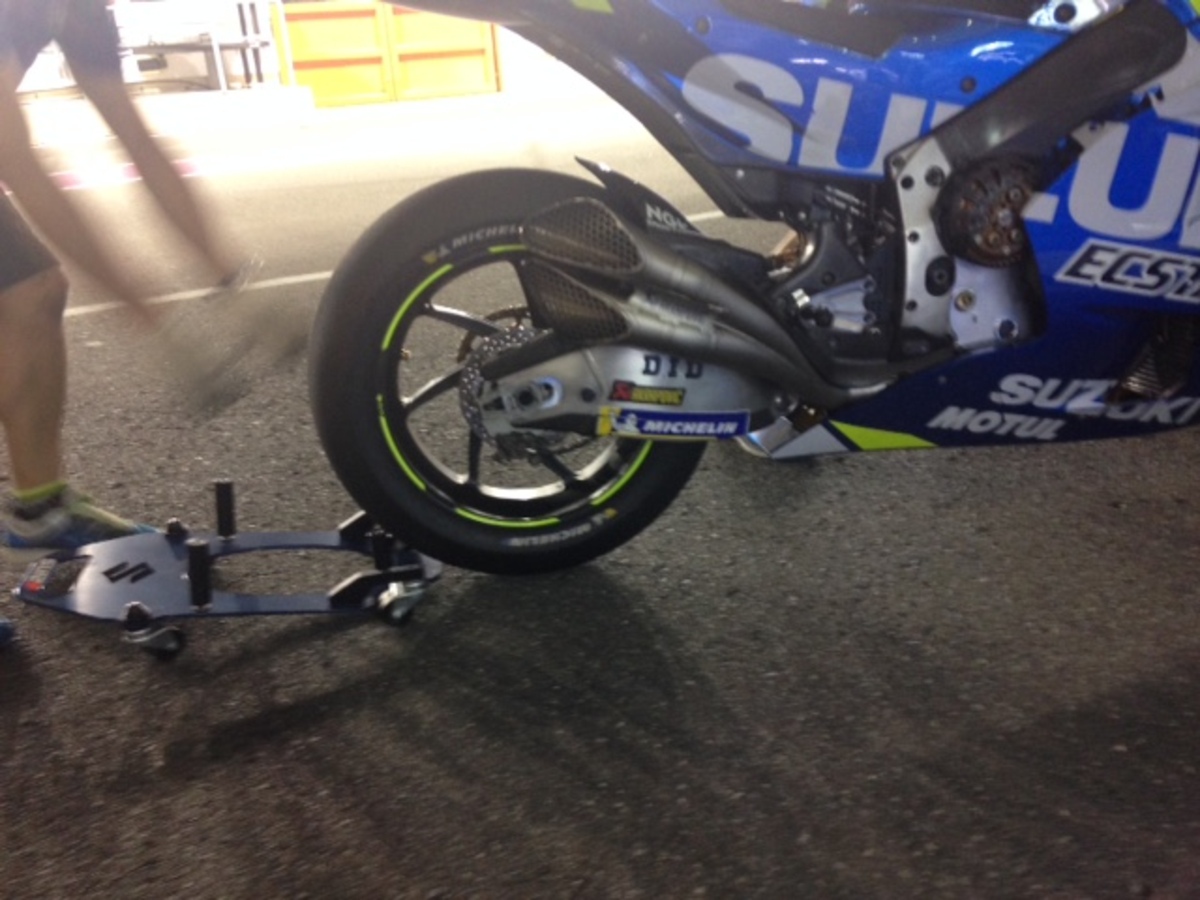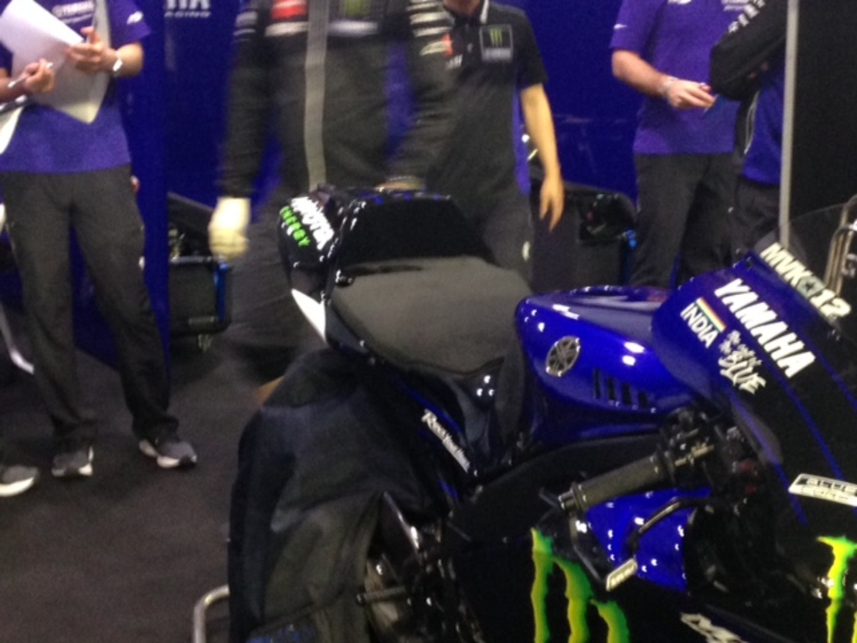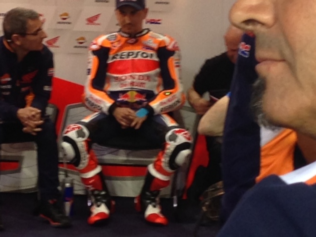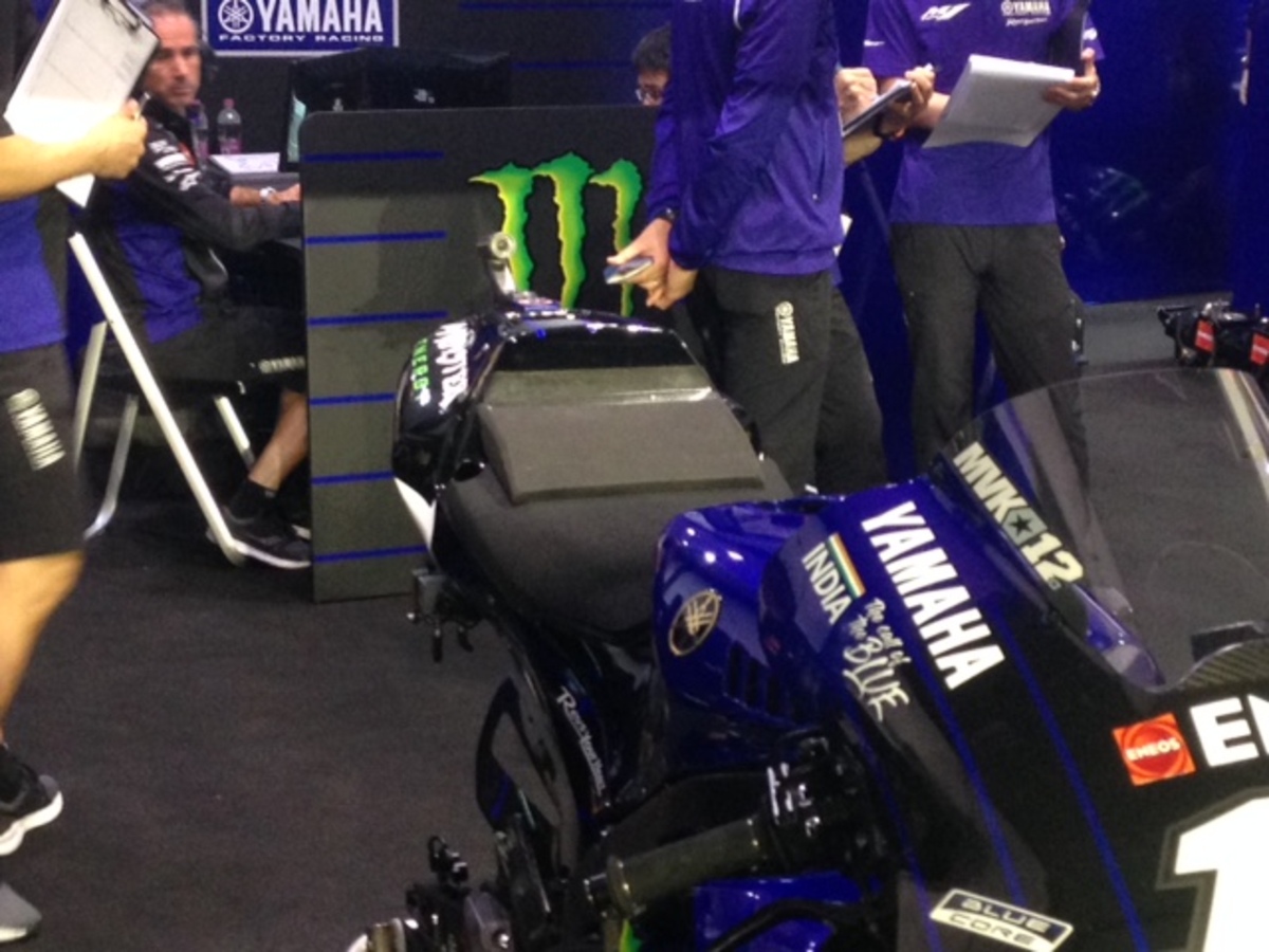 Lorenzo dentro al box sta prendendo le misure sulla moto, probabile che fra poco entro in pista. Comincia a fare freschino, da felpa