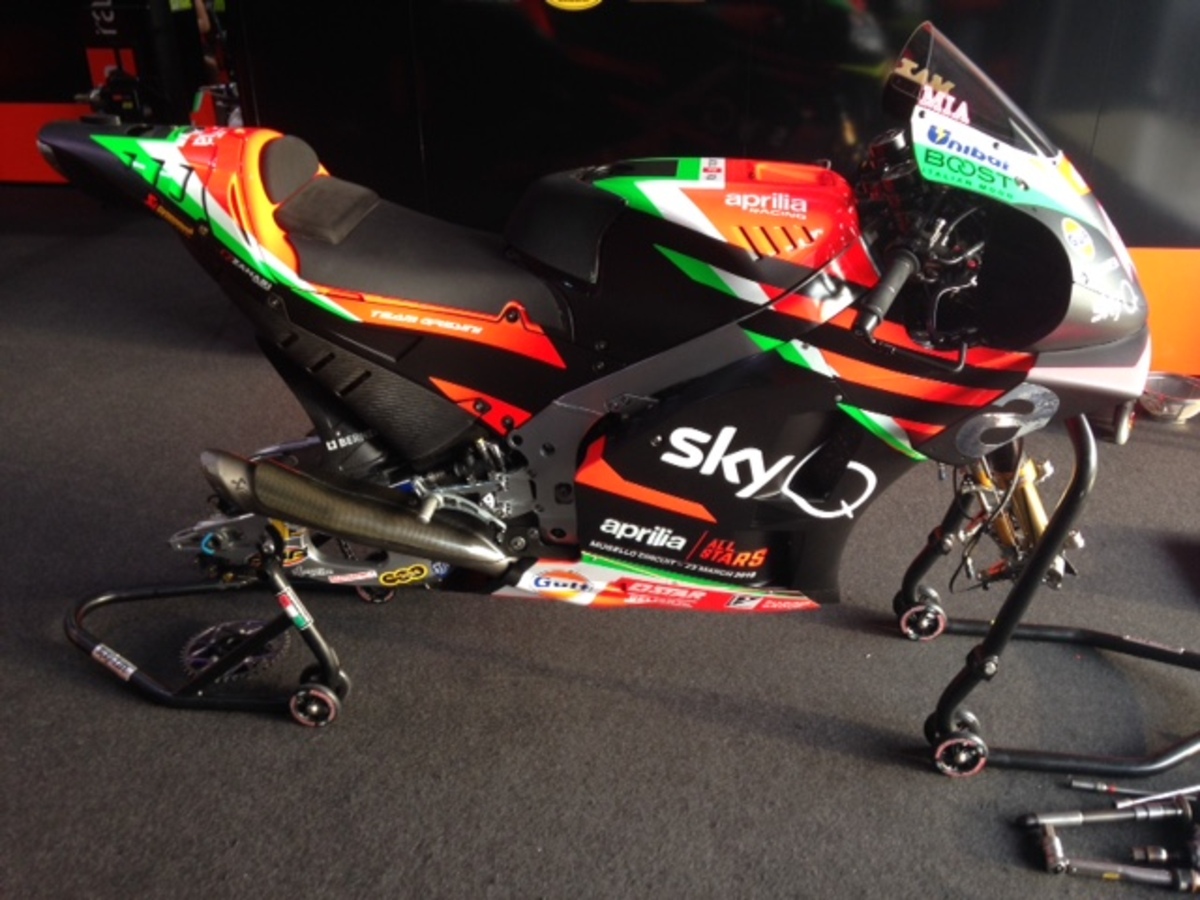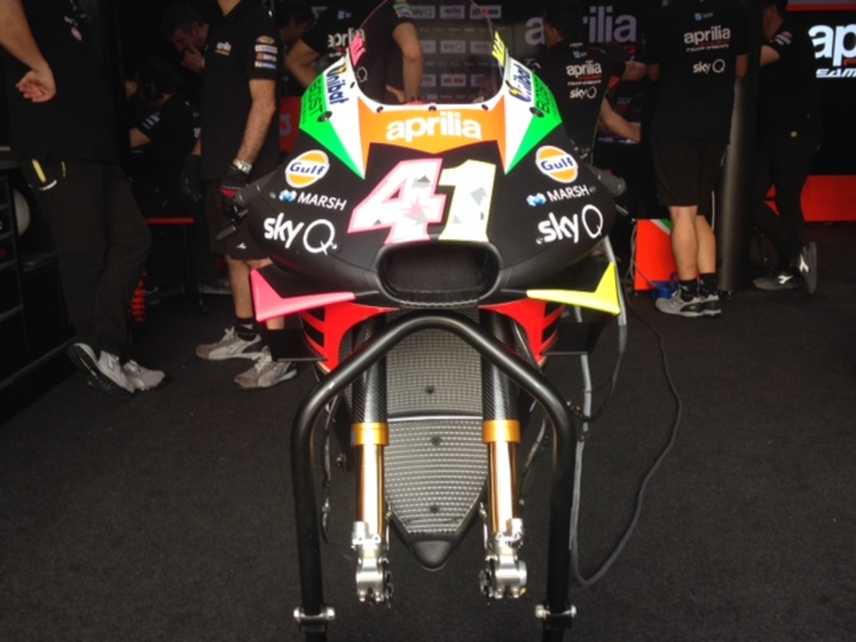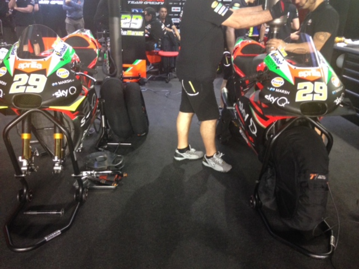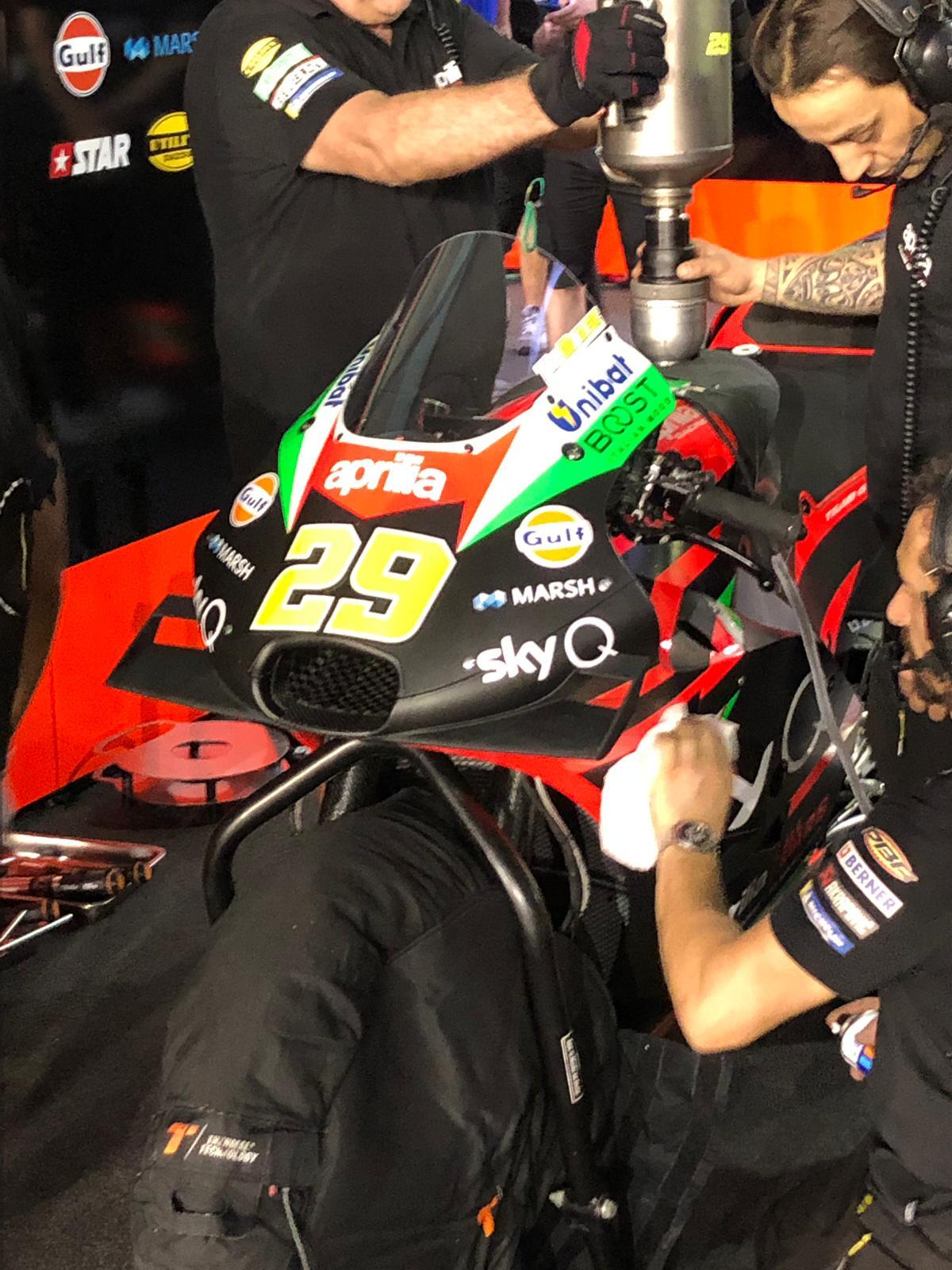Vista laterale dell'Aprilia, con uno scarico più lungo. Dentro al box Aprilia ci sono 4 moto uguali per a.espargaro e iannone, 4 moto 2019. Il collaudatore smith, che qui correrà con una wild card, ha una moto 2019 e un ibrido