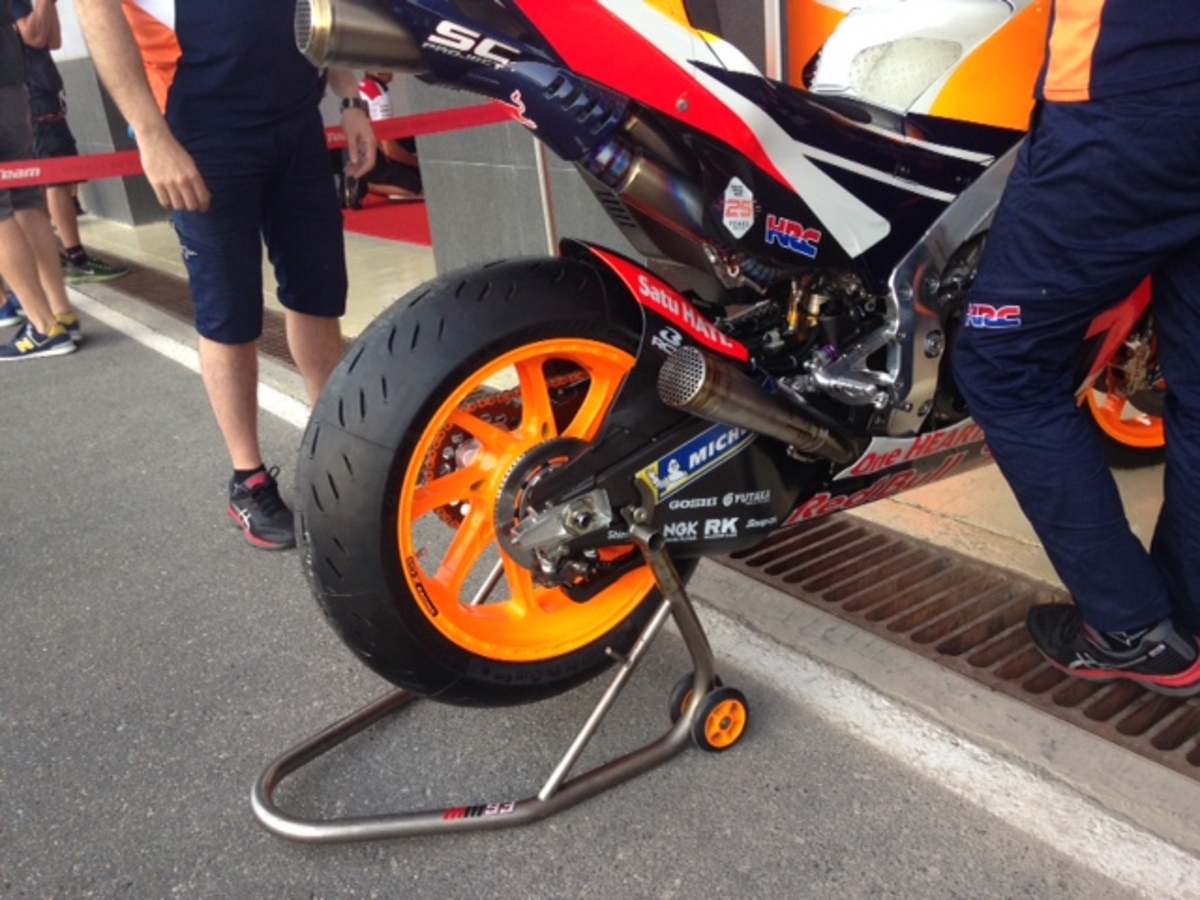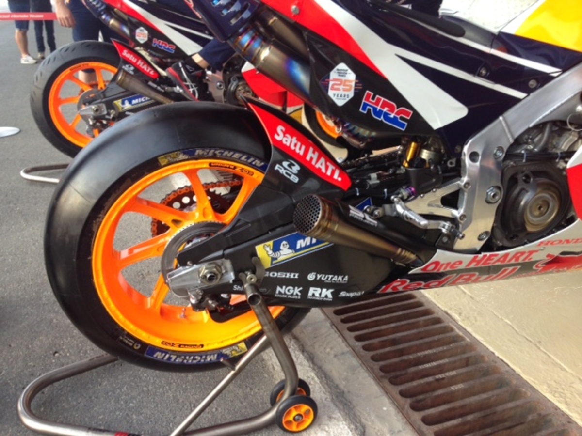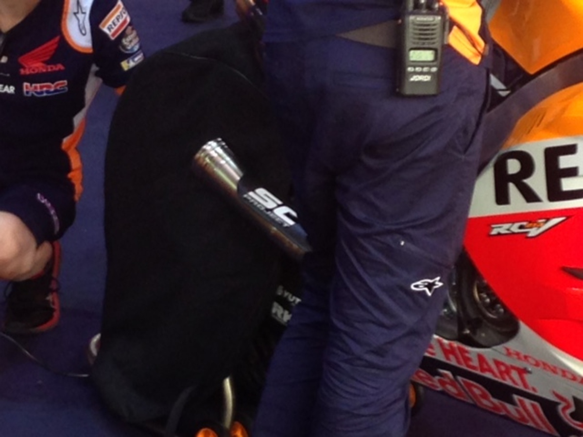 Scarichi differenti sulle due honda di marquez: uno è più corto ed è più largo in uscita rispetto al forcellone, uno è più lungo e più aderente al forcellone