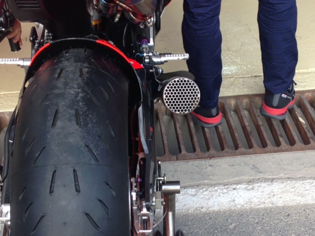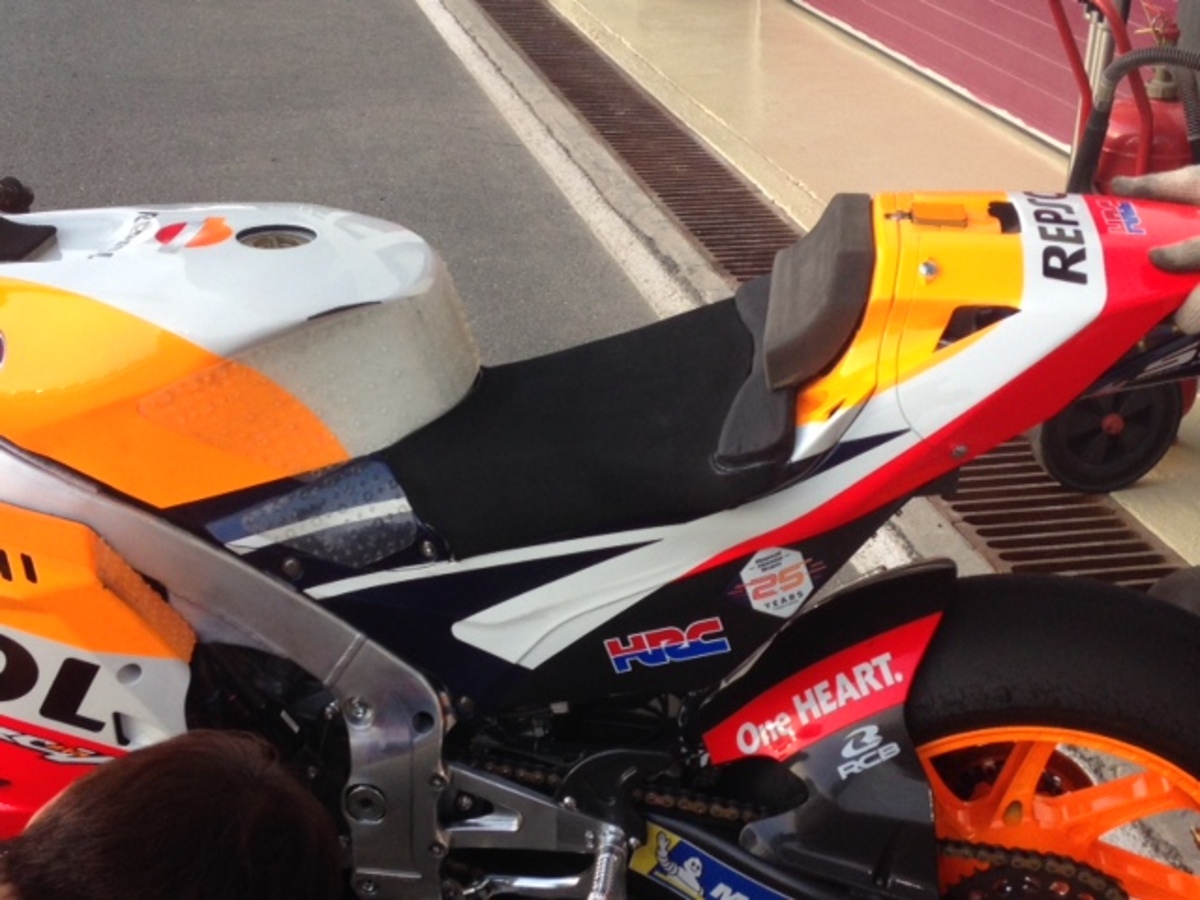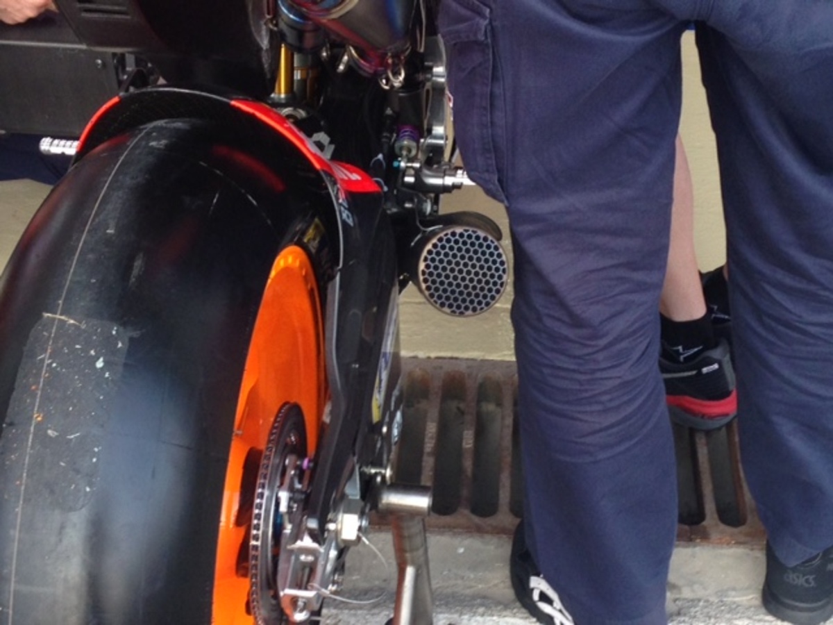 Scarichi differenti sulle due honda di marquez: uno è più corto ed è più largo in uscita rispetto al forcellone, uno è più lungo e più aderente al forcellone