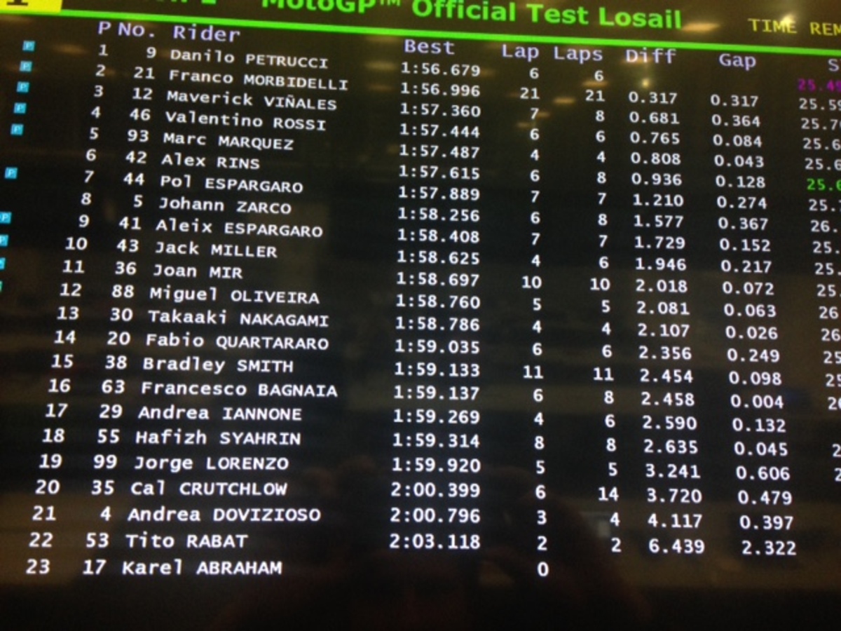 petrucci scende sotto l’1’57”: 1’56”679. Come a Sepang, anche qui i tempi gli vengono “facili”.