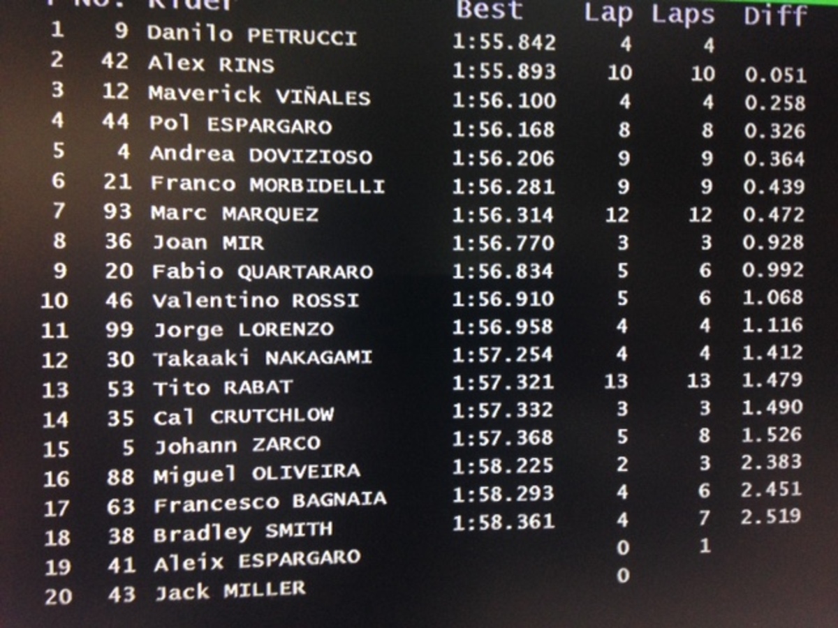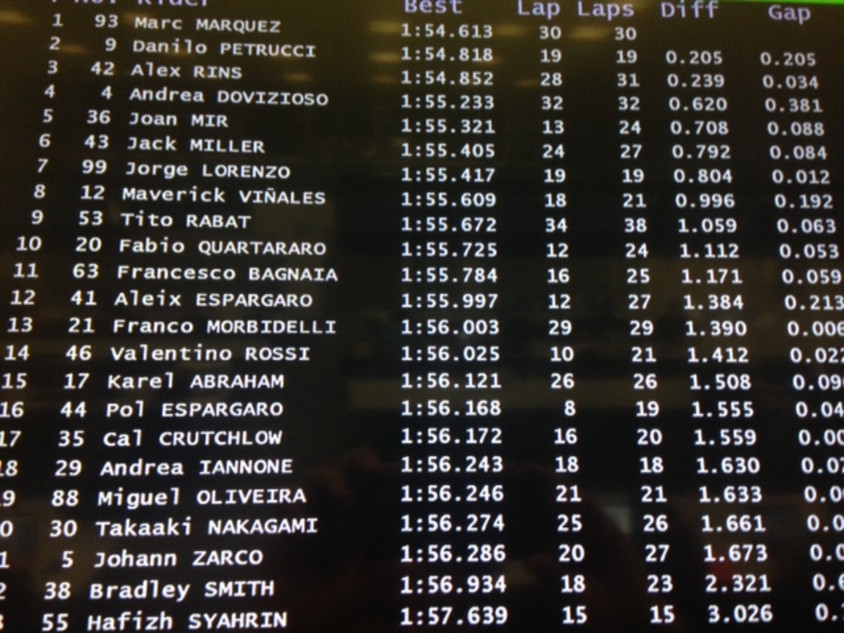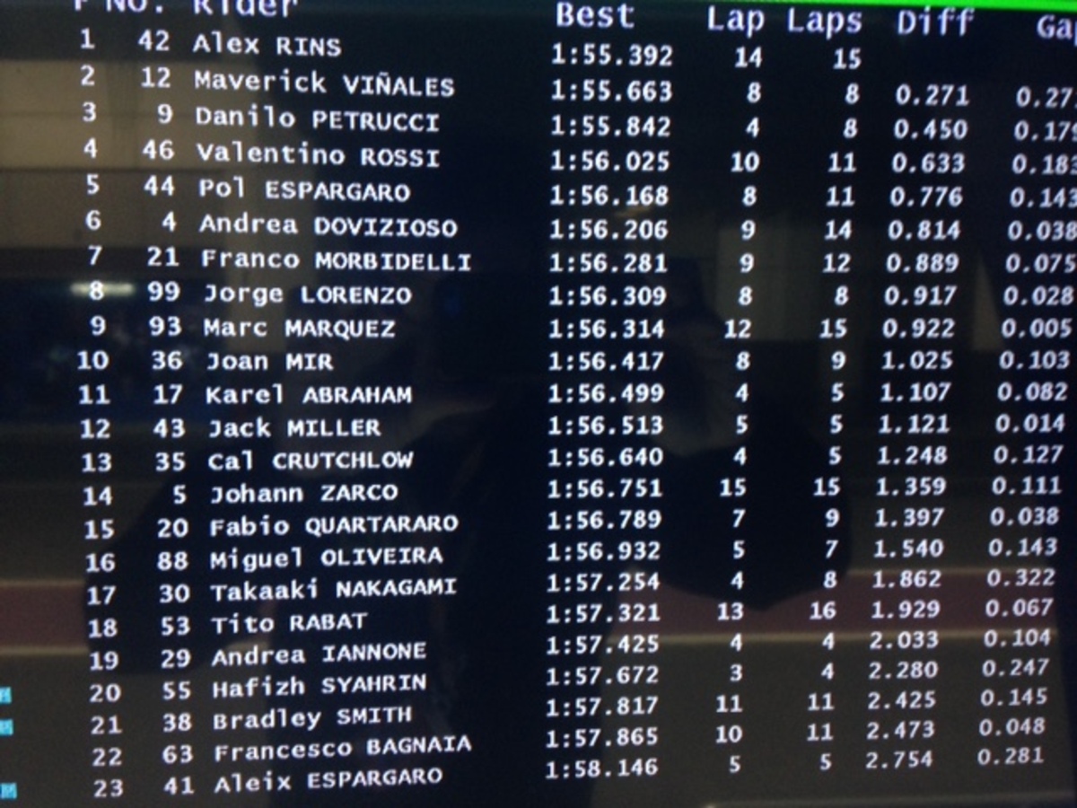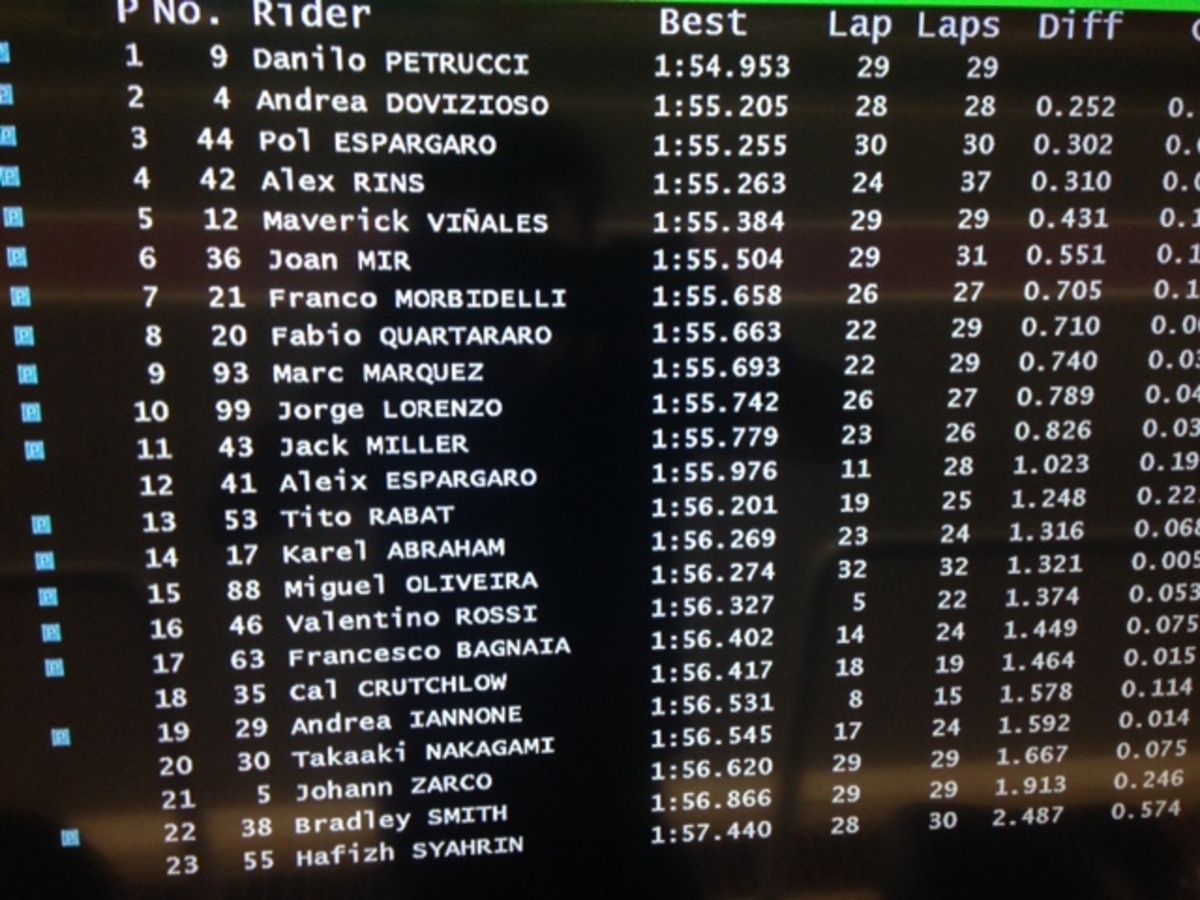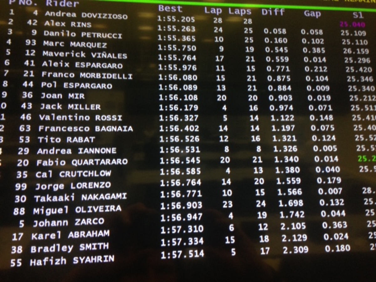 A.Espargaro 8 in 1’56”358 (24), Iannone 20 in 1’57”362 (18)