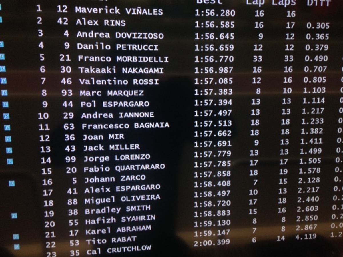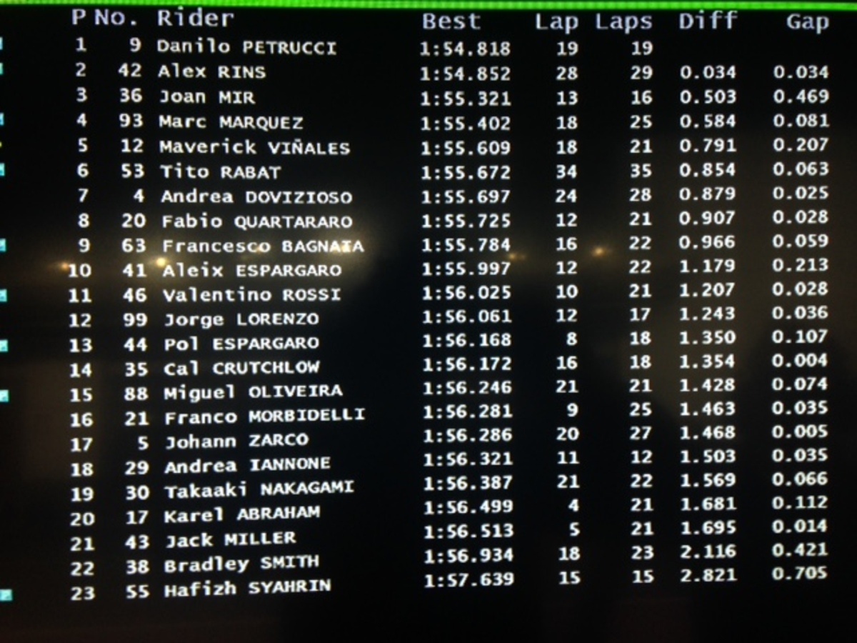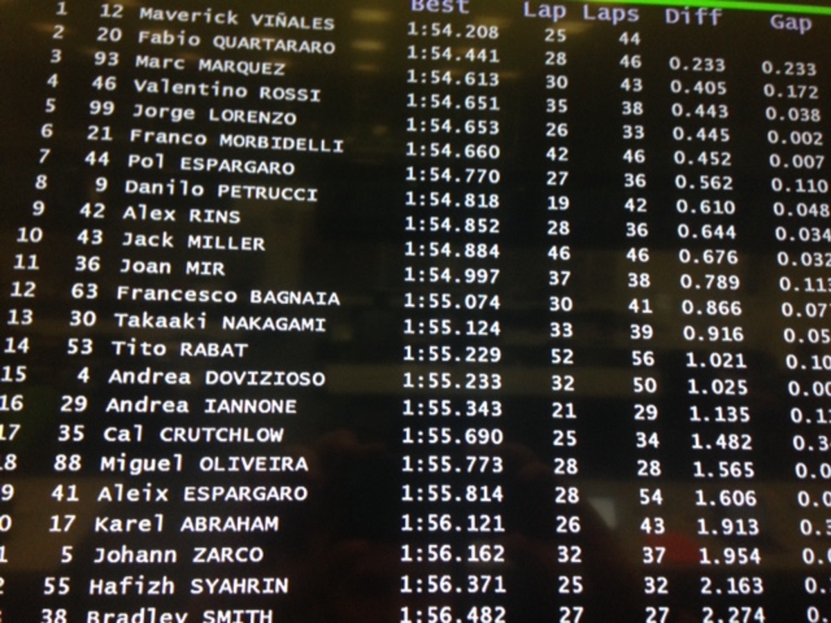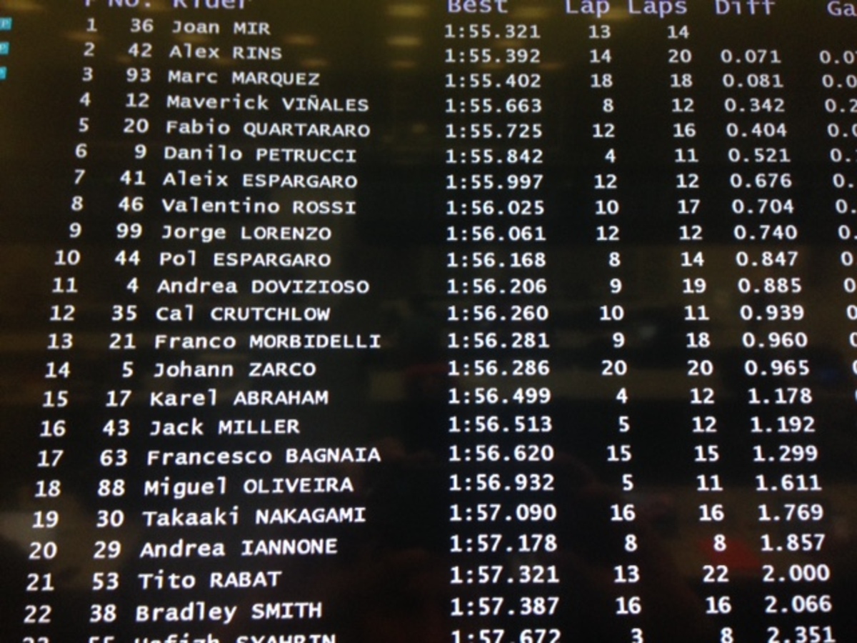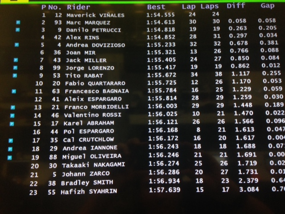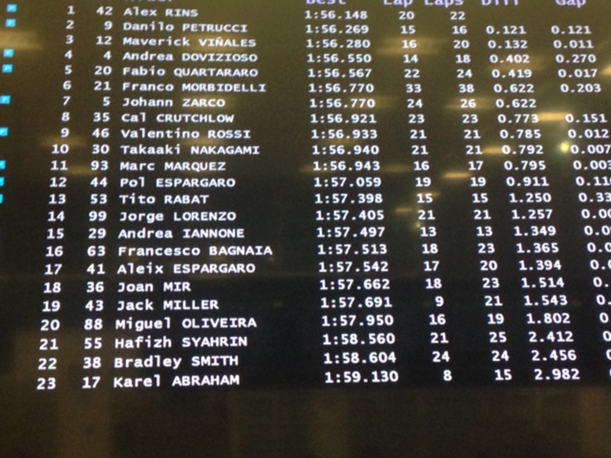 A.Espargaro 8 in 1’56”358 (24), Iannone 20 in 1’57”362 (18)
