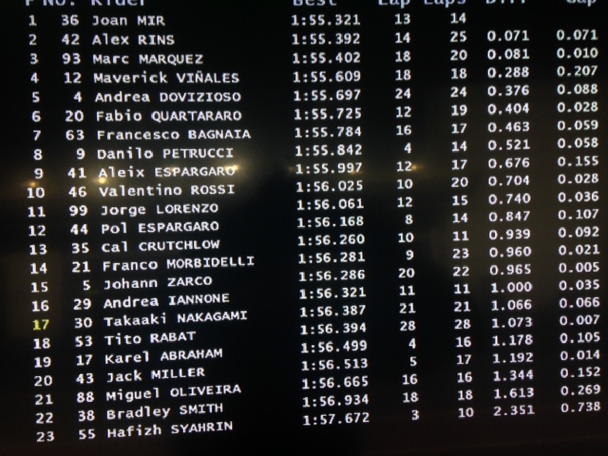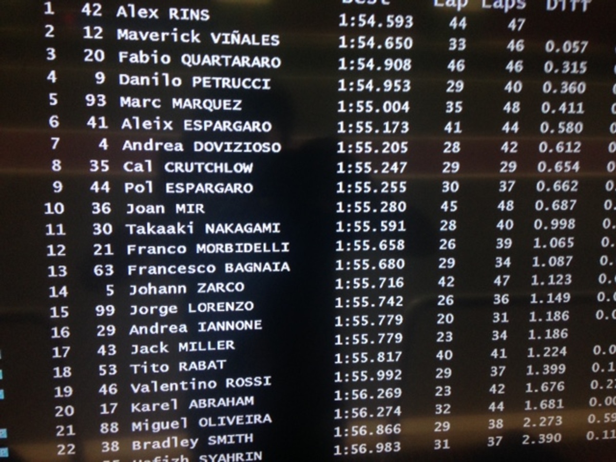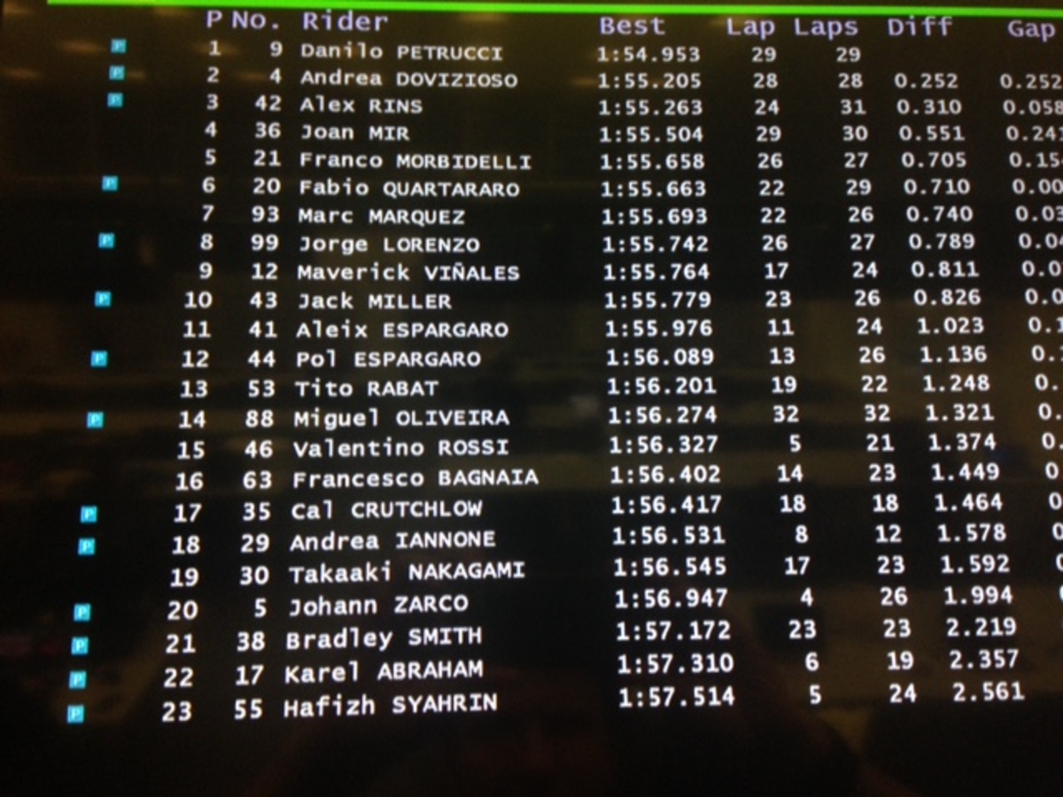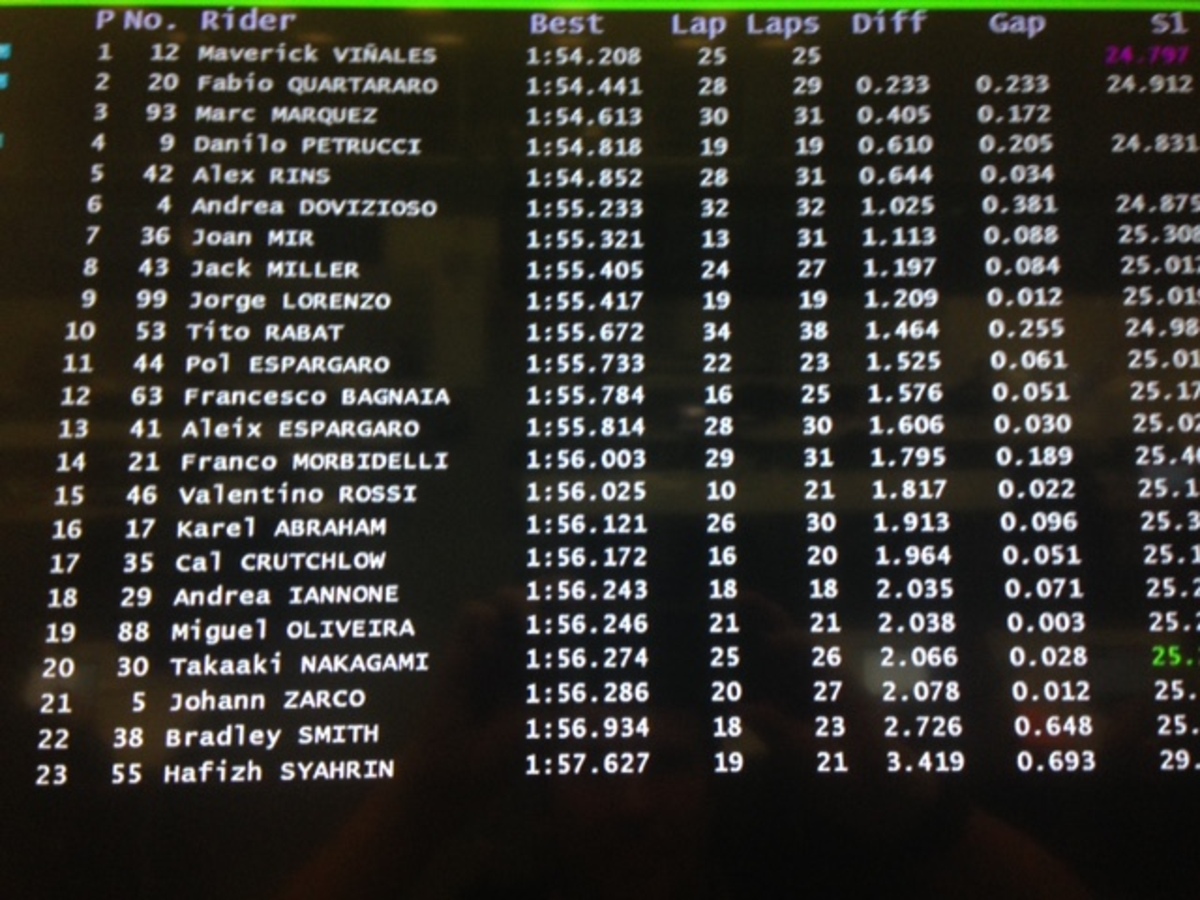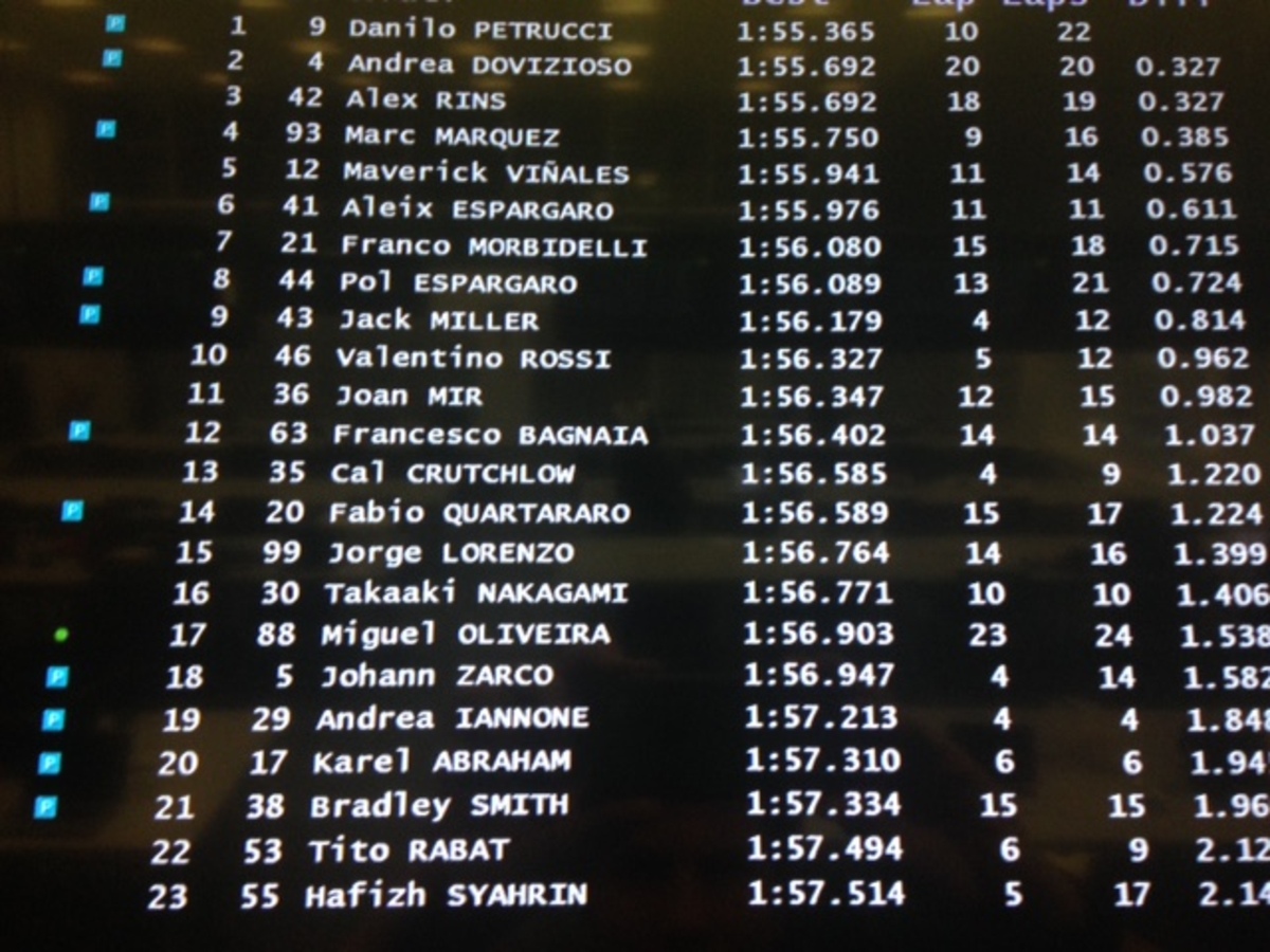 A.Espargaro 8 in 1’56”358 (24), Iannone 20 in 1’57”362 (18)