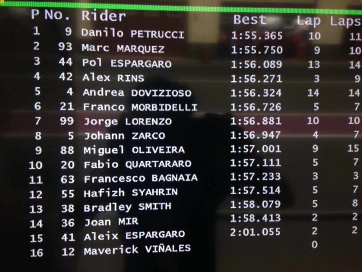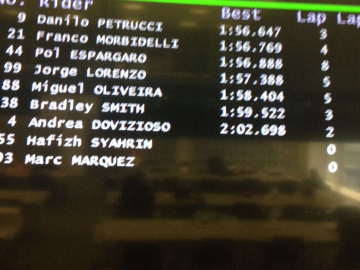 Il riferimento cronometrico è quello di Danilo Petrucci, 1’57”204, 0”601 più veloce di Marquez. Lorenzo, per il momento, ha effettuato 3 giri, il più veloce in 2’02”211