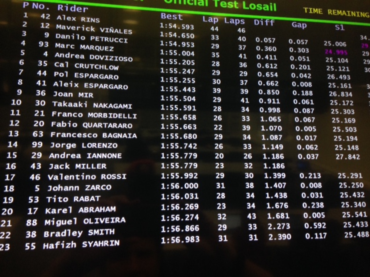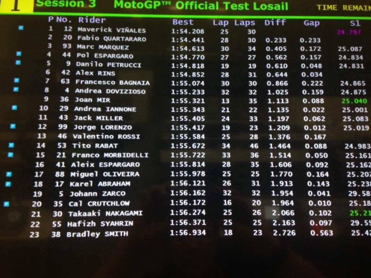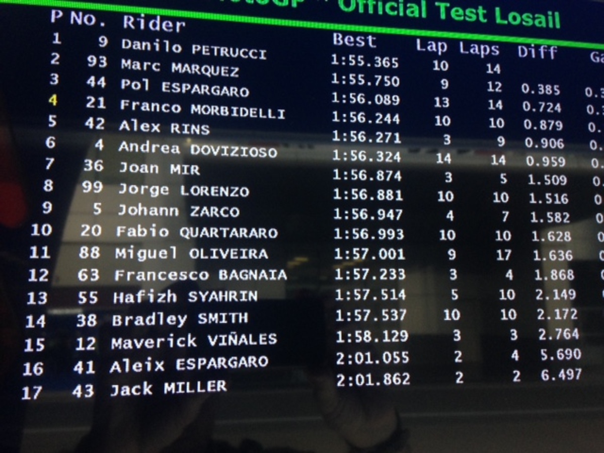 2) Rins (scivolato senza conseguenze alla curva 2) è quello che riesce a ottenere i tempi con maggiore facilità e a girare compie costanza: il pacchetto moto/pilota sta funzionando molto bene. E la competitività della Suzuki è certificata anche dalle prestazioni di Joan Mir, al quale manca un po’ di costanza (per il momento);