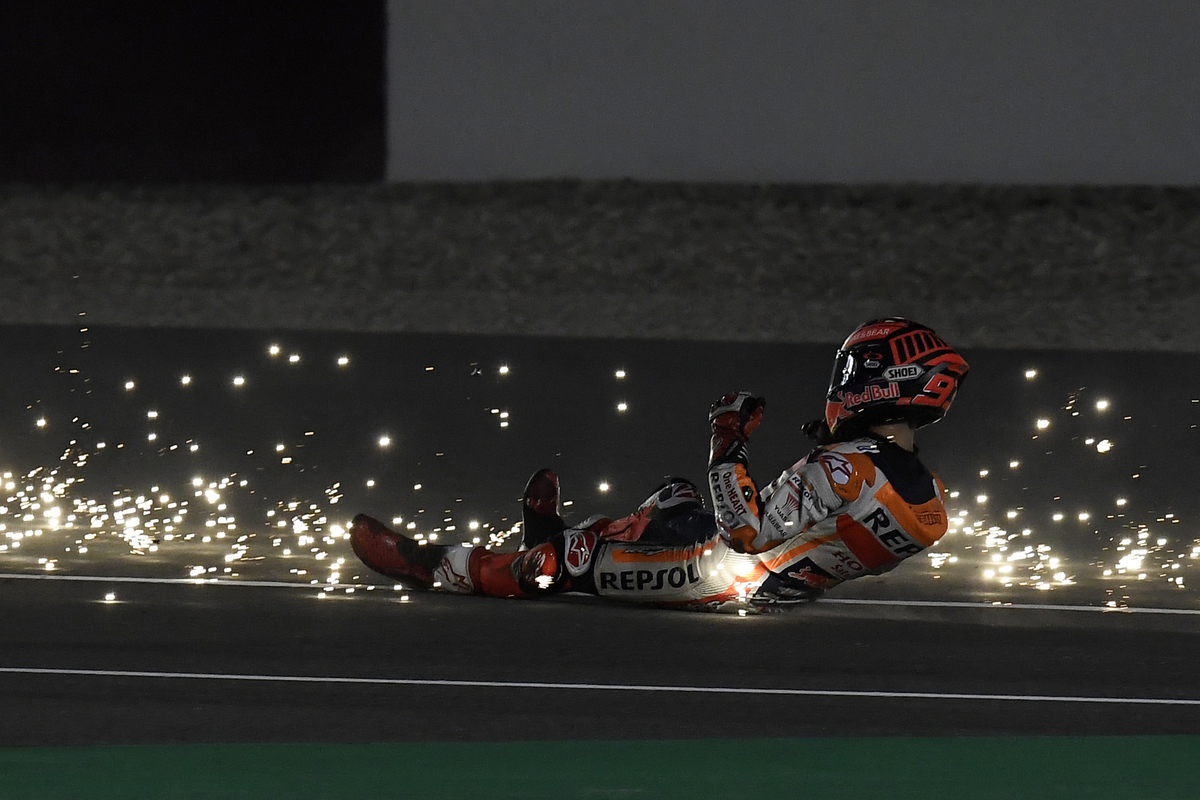 cade marquez alla curva 6, pilota ok. adesso la temperatura sull’asfalto è inferiore ai 20 °C: facile perdere il controllo della moto